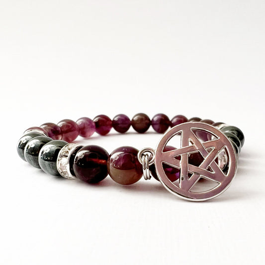 8mm Hematite & Amethyst Beaded Bracelet with Pentacle Charm