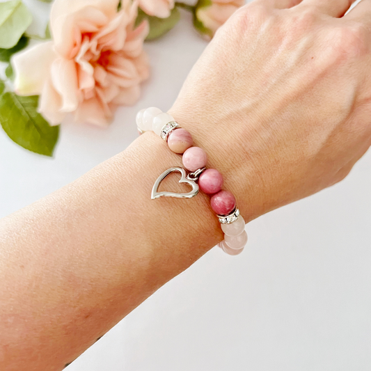 8mm Rhodonite & Rose Quartz Beaded Bracelet with Heart Charm