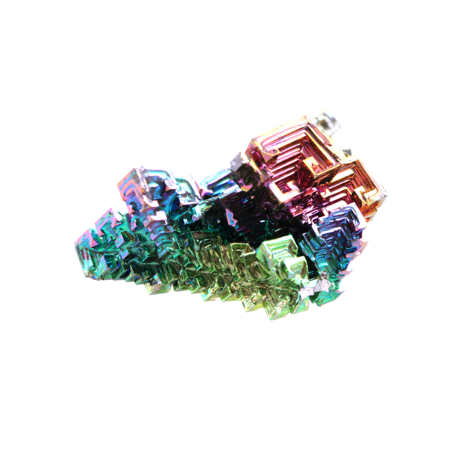 Bismuth is a brittle metal known for its stunning iridescent, rainbow-like hues and unique geometric, hopper crystal formations. Naturally occurring bismuth crystals are rare, and the majority of bismuth crystals available are man-made.