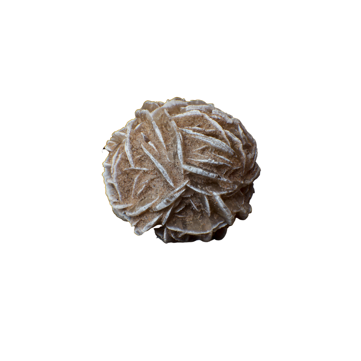 Desert Rose Selenite, also known as Gypsum Rose or Sand Rose, is a form of Selenite combined with Barite that forms in desert environments. It typically has a rosette-like formation with a pale brown, tan, or creamy white color, resembling a rose in full bloom. These formations are created through the combination of water, sand, and wind over time, embedding sand within the Selenite blades.