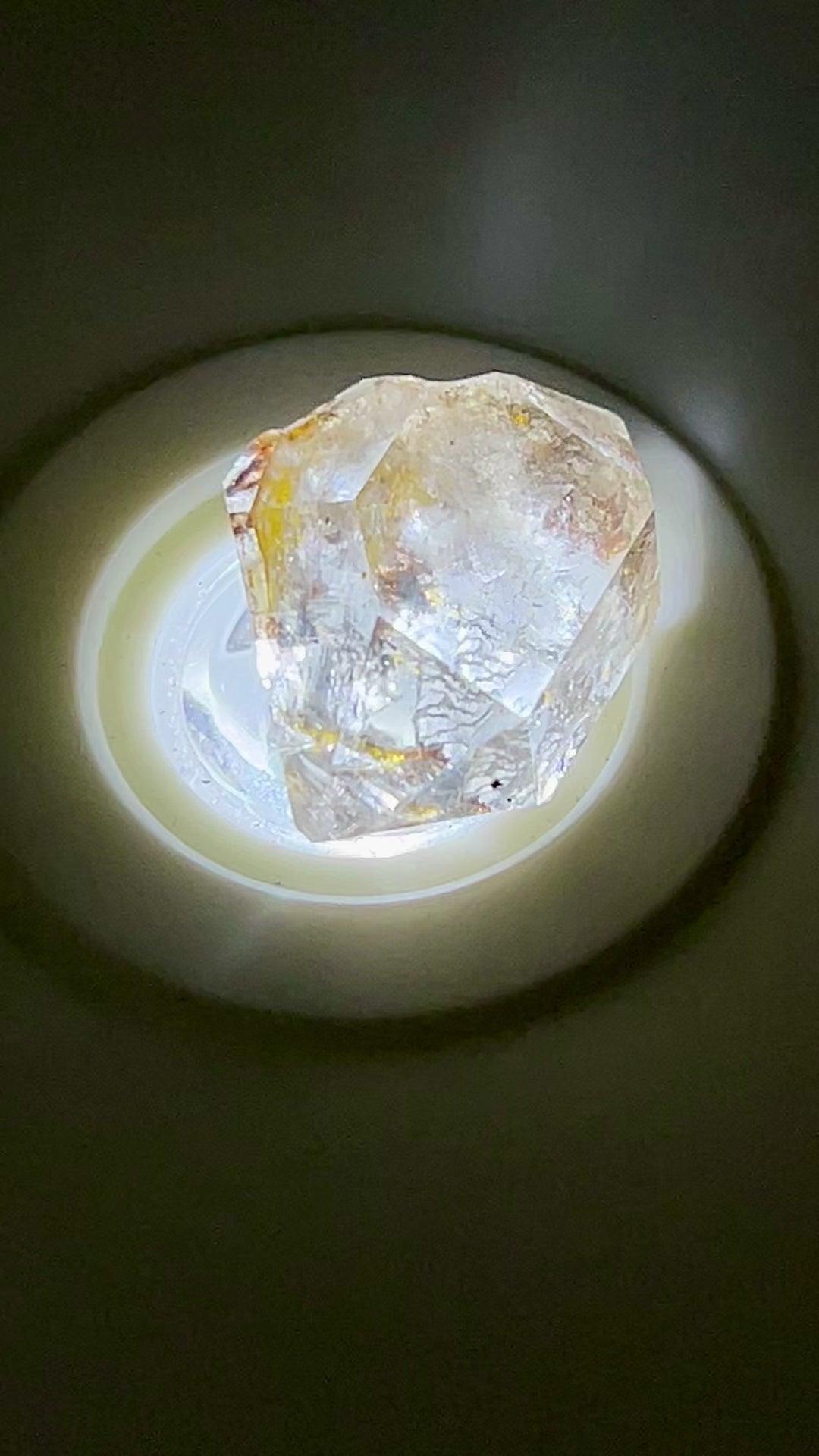 This beautiful Herkimer Diamond quartz crystal, including the case, is the exact piece you will receive, as shown in the photos and videos. It has contact markings on one end where it was attached to the matrix. It is ice-water-clear in some parts and has some lovely inclusions in other areas that give it character.