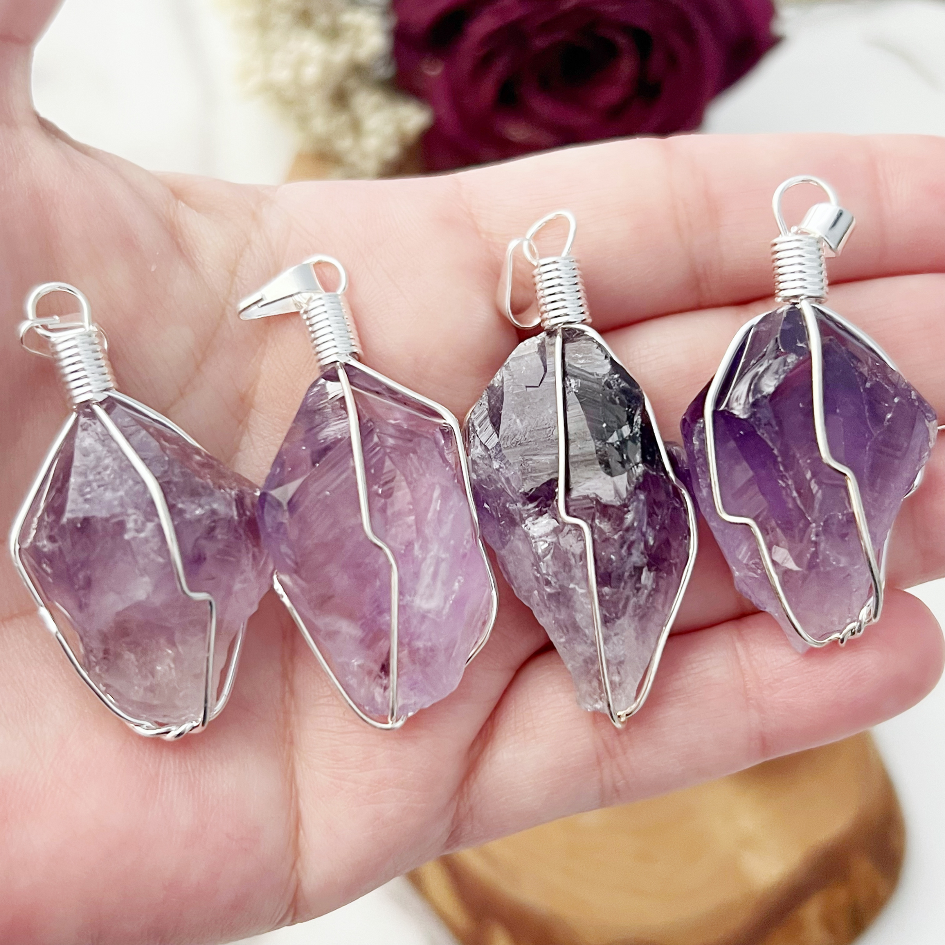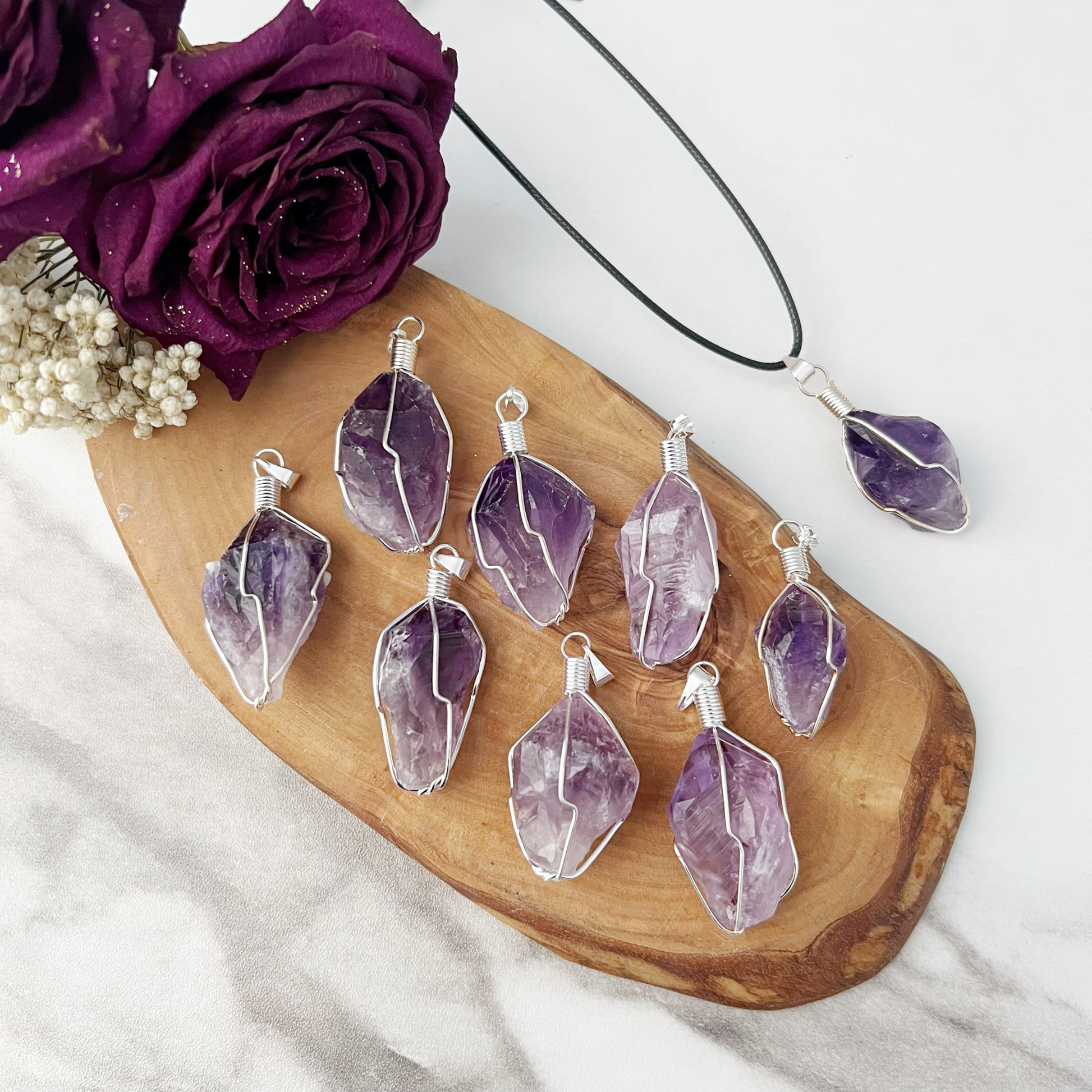 Elevate your spiritual style with this exquisite raw Amethyst point pendant, expertly wire-wrapped to showcase its natural beauty. Ranging from 1 to 1.5 inches, each piece is unique, offering a one-of-a-kind charm. Known for its powerful calming and healing properties, Amethyst is the perfect crystal to bring tranquility and clarity to your everyday life.