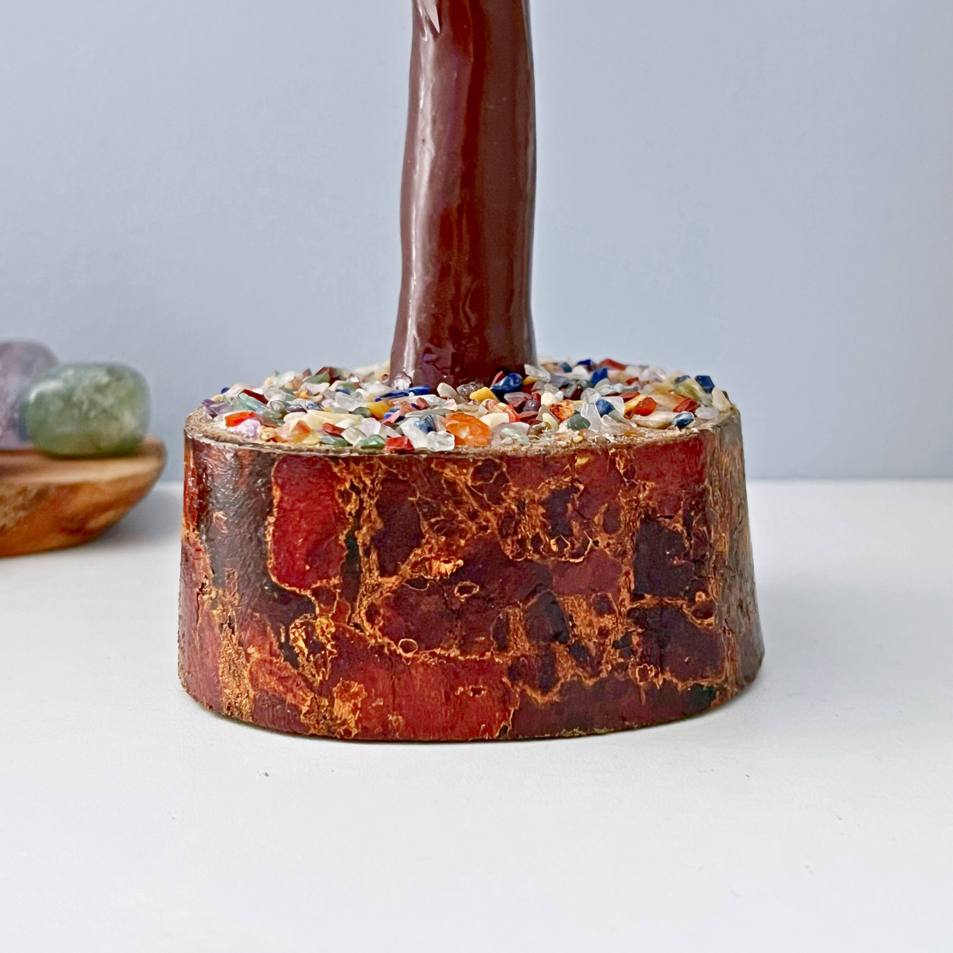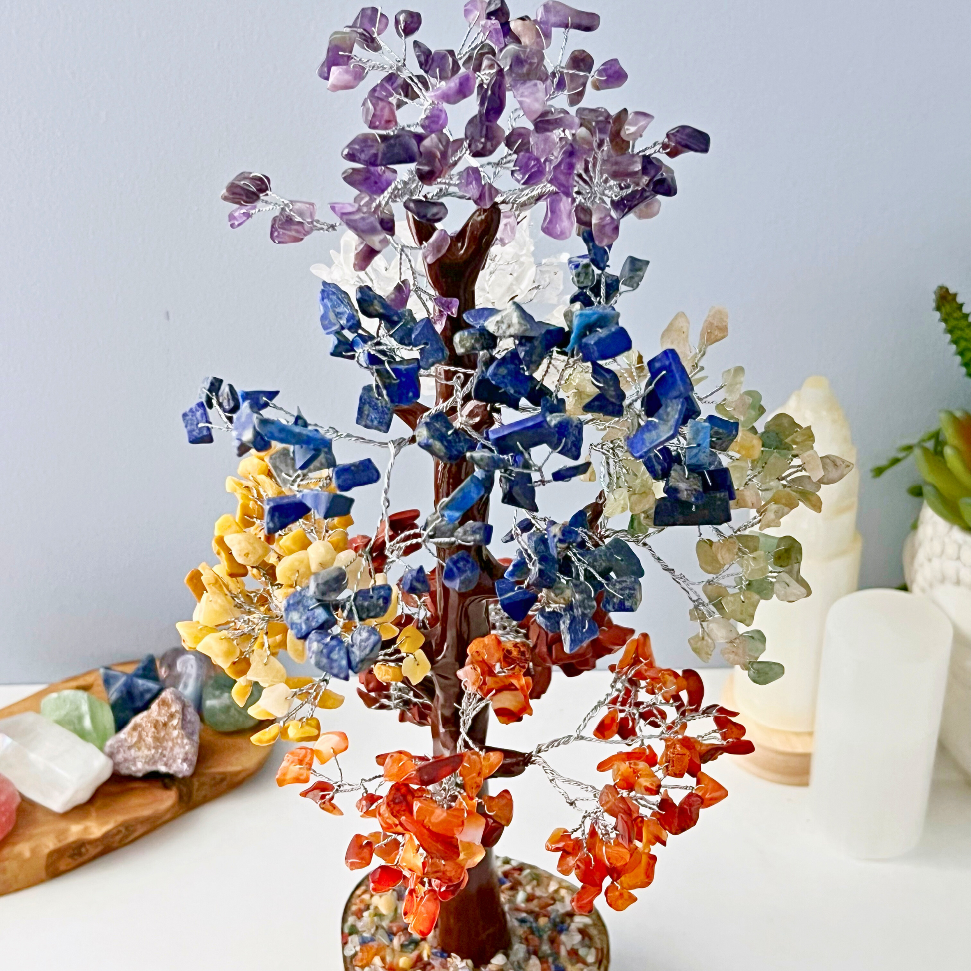 Get ready to balance your vibes with this stunning 15" Seven Chakra Gemstone Tree! Adorned with 700 vibrant gemstone chips, each representing one of the seven chakras, this tree is a visual and energetic masterpiece. From the calming amethyst at the top to the grounding red jasper at the base, every branch is designed to help you align and harmonize your energy centers.