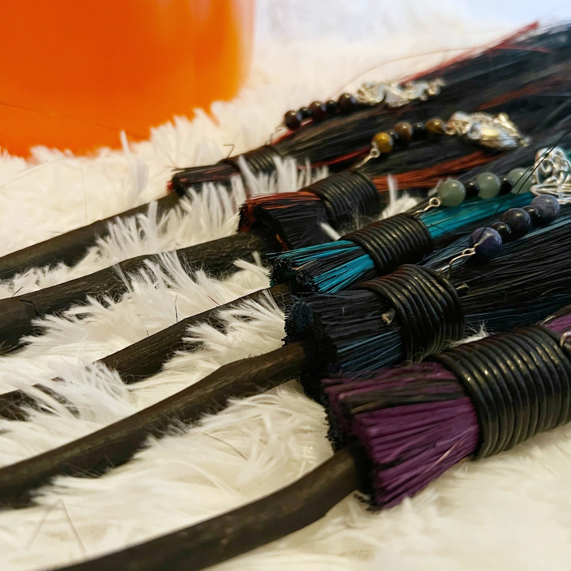 Crafted with care and measuring 12" in length, the broom's enchanting wood handle, which is natural foraged wood from the Catskills, NY, extends an additional 6". Some of the bristles have been dyed and they are are available in 5 captivating colors and styles.