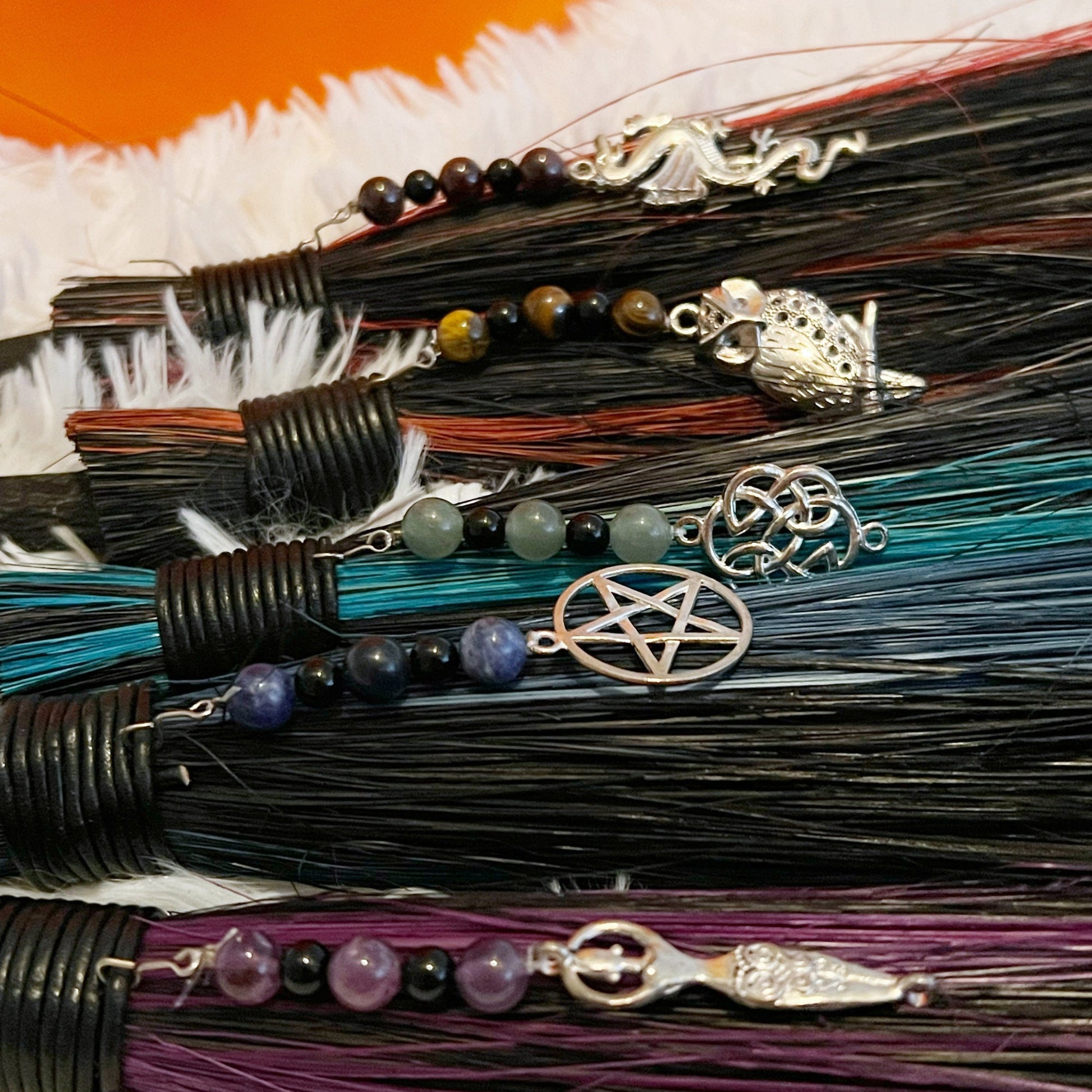 🧡 For a touch of mystery, choose the Black & Orange broom featuring Tiger Eye and Tourmaline beads, accompanied by an Owl Charm.
