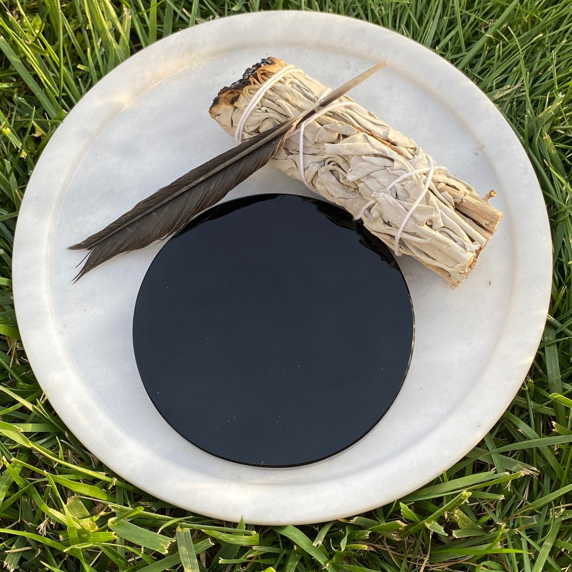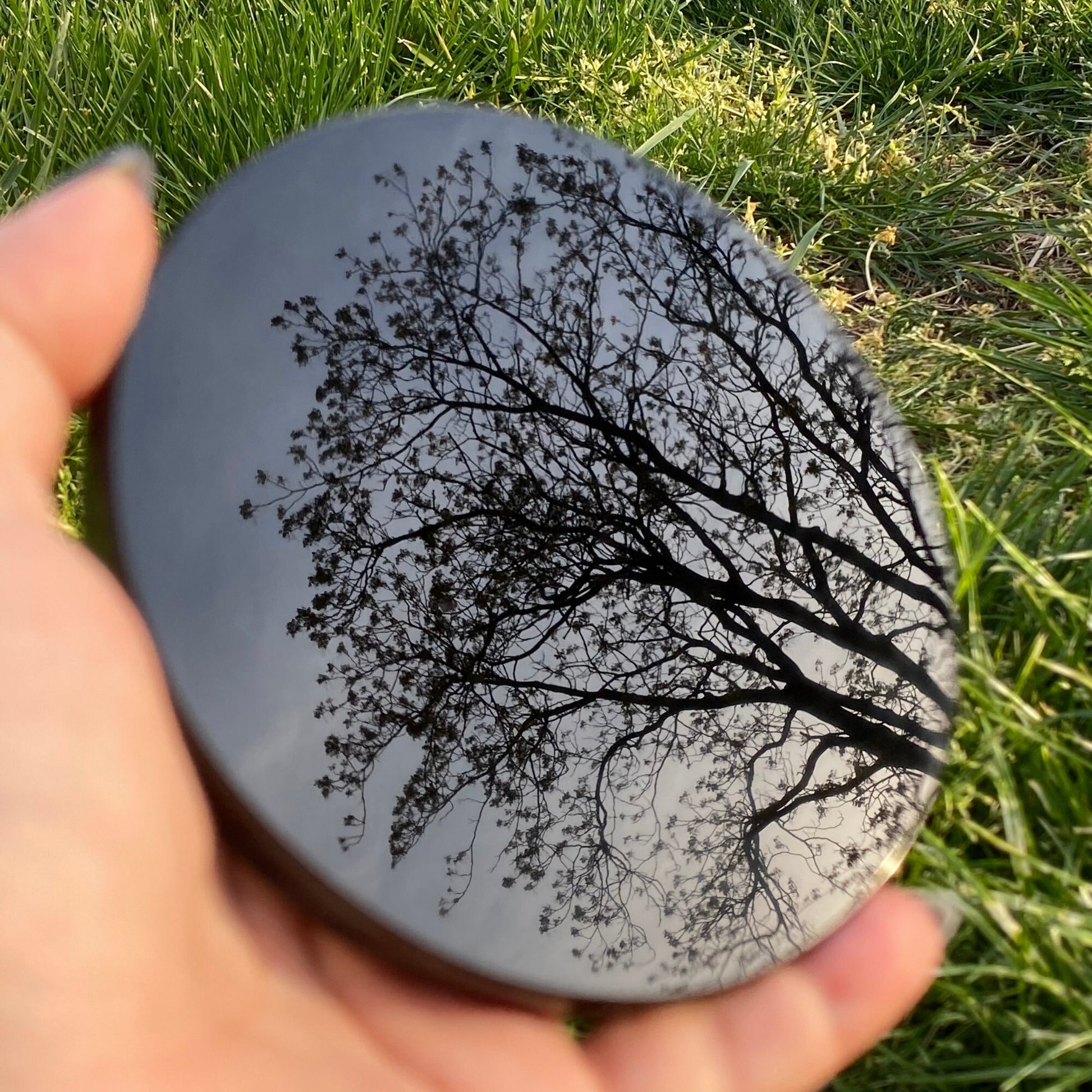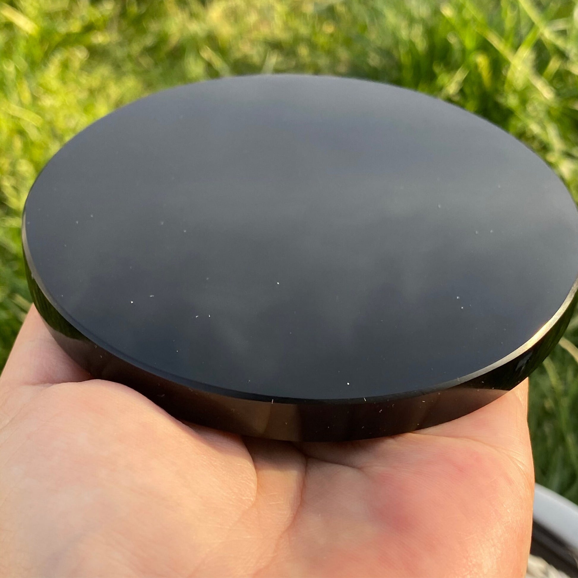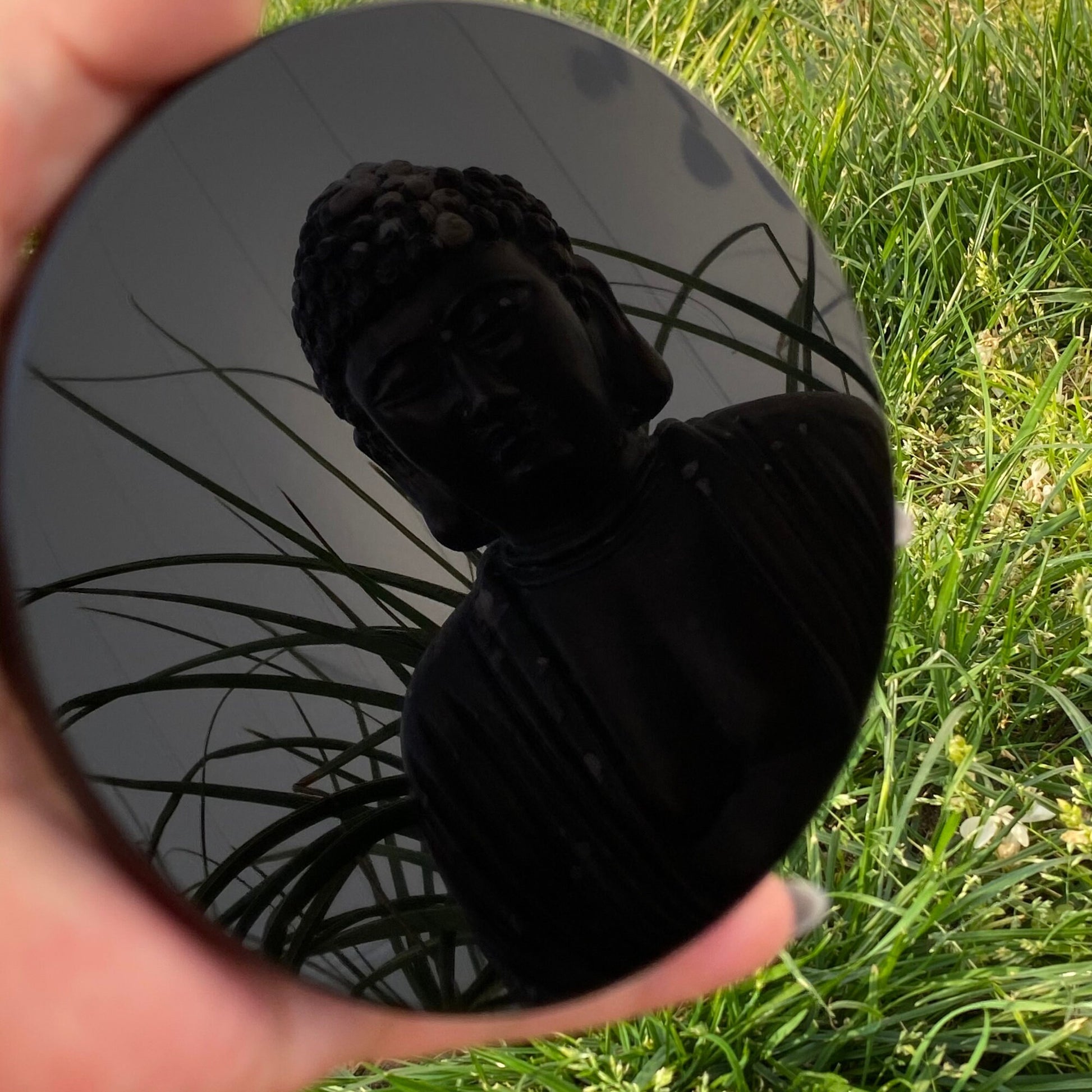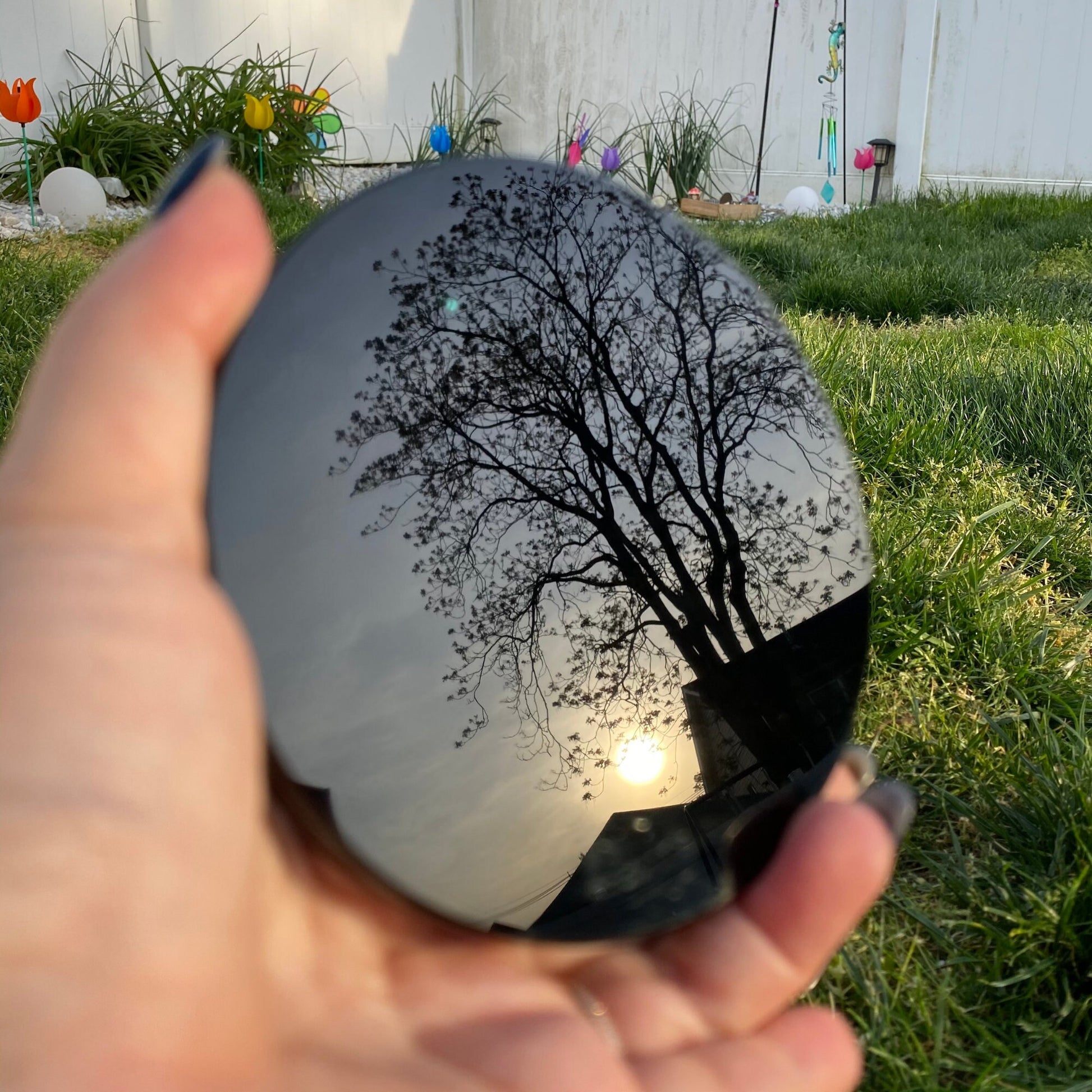 Delve into the mystical with the 4" Obsidian Scrying Mirror, a larger and more captivating portal to the hidden realms of divination, foretelling, and introspection. This elegantly crafted Black Mirror is not merely a decorative piece but a profound tool for those on a quest for deeper knowledge and understanding. Made from the finest quality Obsidian, a powerful volcanic glass revered for its shielding and grounding attributes, this mirror is a sacred companion for all your magical explorations.