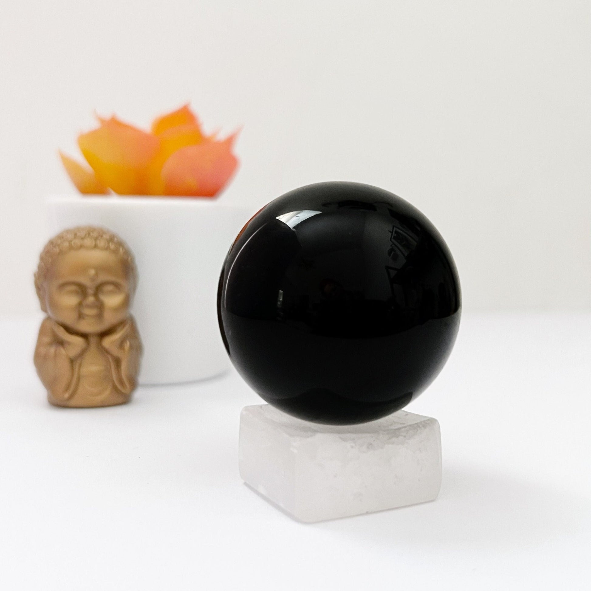 Obsidian, known for its sleek, reflective surface, is formed from rapidly cooled lava. It's a stone deeply connected to the core of the Earth, embodying strength, protection, and grounding energies. In the shape of a sphere, these properties are amplified and radiated in all directions, making it a potent aid for meditation, cleansing, and personal reflection.
