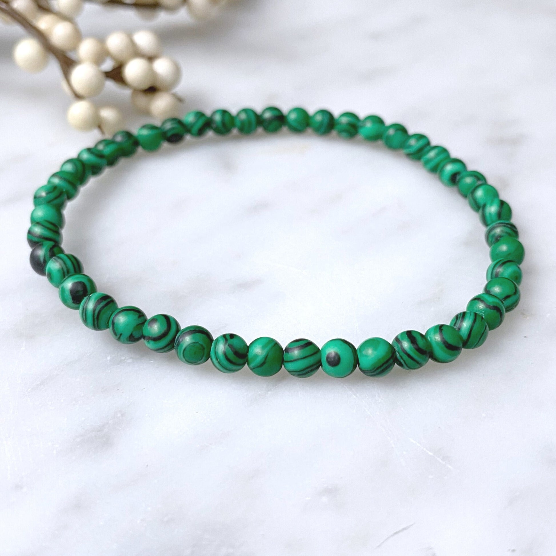 📝 These are reconstituted Malachite beads made of ground Malachite mixed with resin. Malachite is quite soft, and its natural form, with a Mohs hardness between 3.5 and 4.0, is prone to breakage and scratches and is not ideal for rings or bracelets, which may be subject to getting hit and dented. These 4mm beads are made by grinding genuine malachite into a powder form and mixing it with resin to make the beads stronger and more durable for wear.