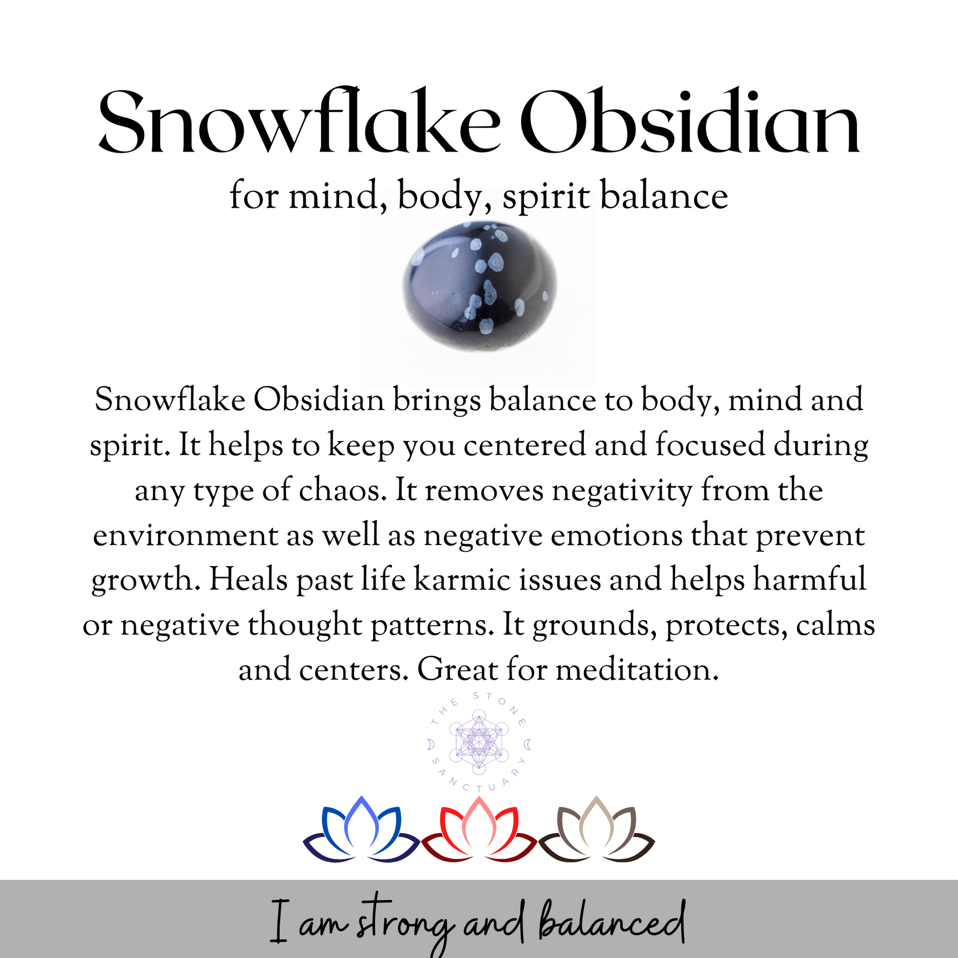 Snowflake Obsidian brings balance to body, mind, and spirit. It helps to keep you centered and focused during any chaos. It removes negativity from the environment and negative emotions that prevent growth. Heals past life karmic issues and helps harmful or negative thought patterns. It grounds, protects, calms, and centers. Great for meditation!