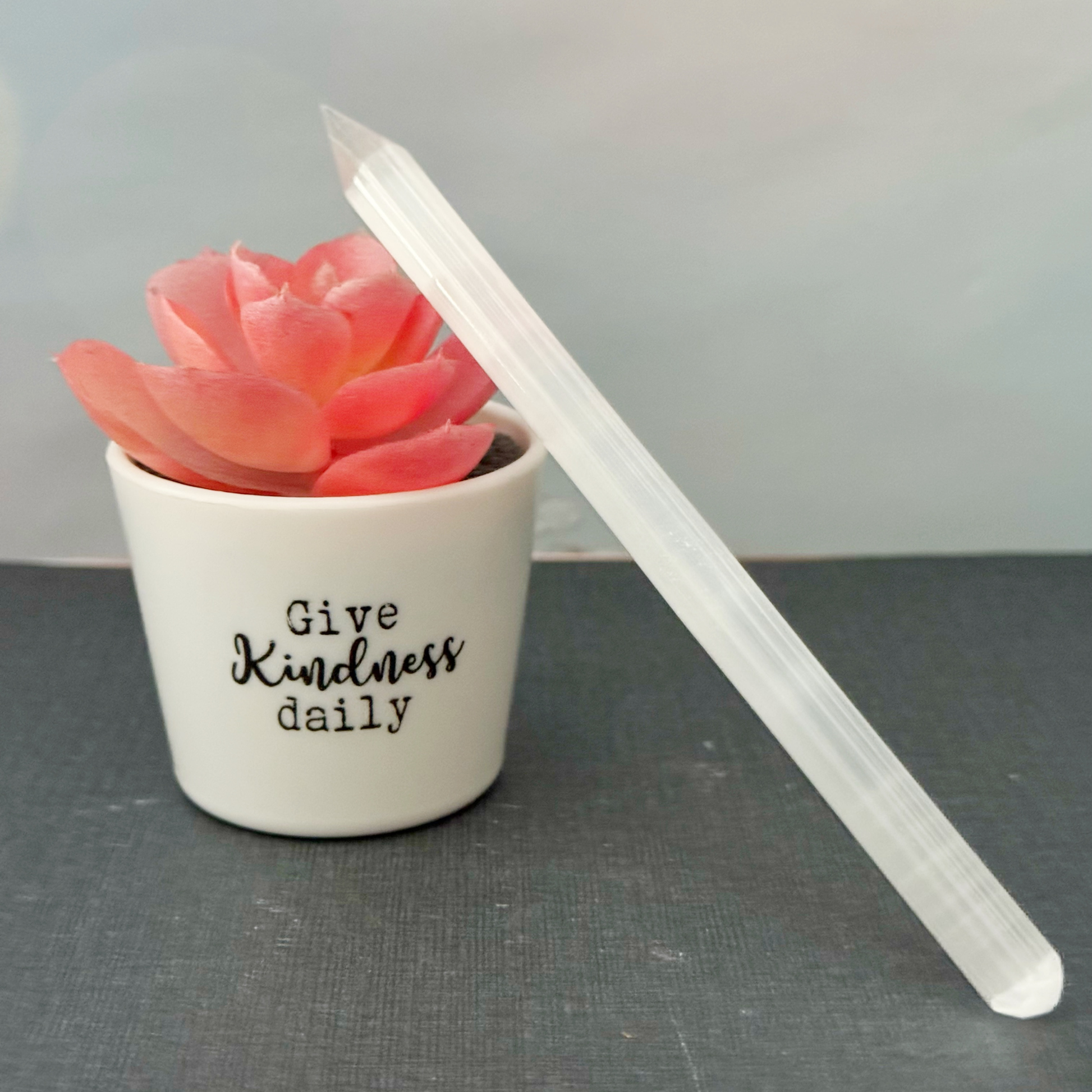 These slender Selenite wands measure approximately 5.5” long and 0.25–0.35” wide, featuring one rounded end and one pointed, pencil-style tip for focused energy work.