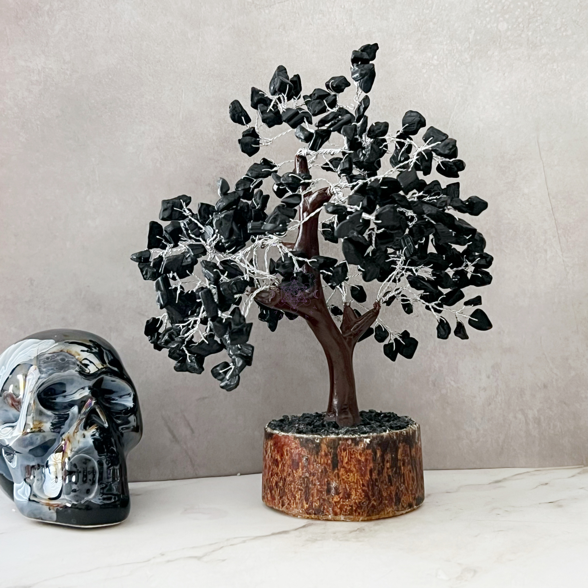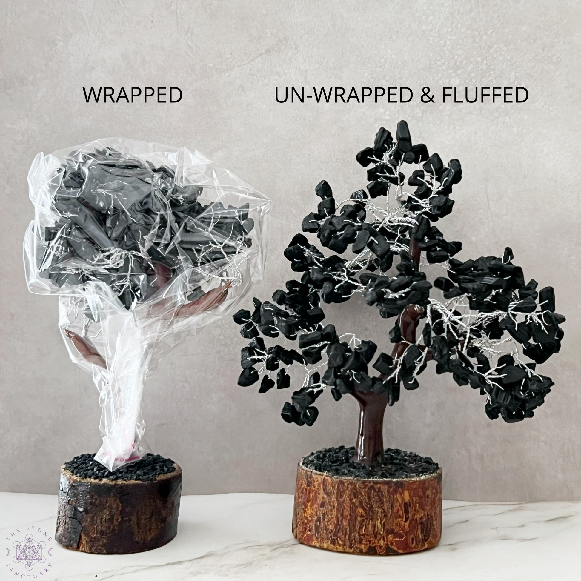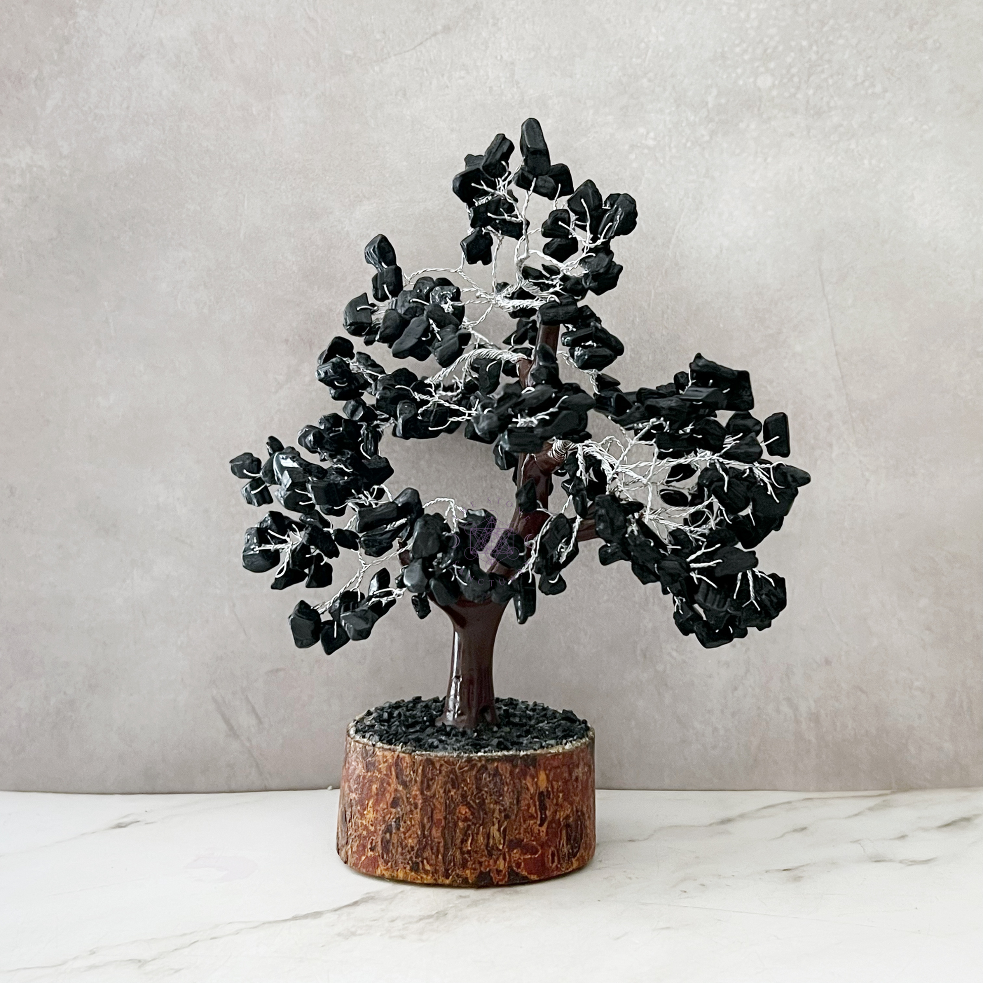 Elevate the energy and aesthetic of any space with our exquisite Black Tourmaline Gemstone Tree. Expertly crafted to blend natural beauty with artistic flair, this stunning piece stands at 8 inches tall and features 300 lustrous black tourmaline chips. Each chip is meticulously attached to shimmering silver metal wire, attached to a wooden base, creating a lush canopy of protective energy.