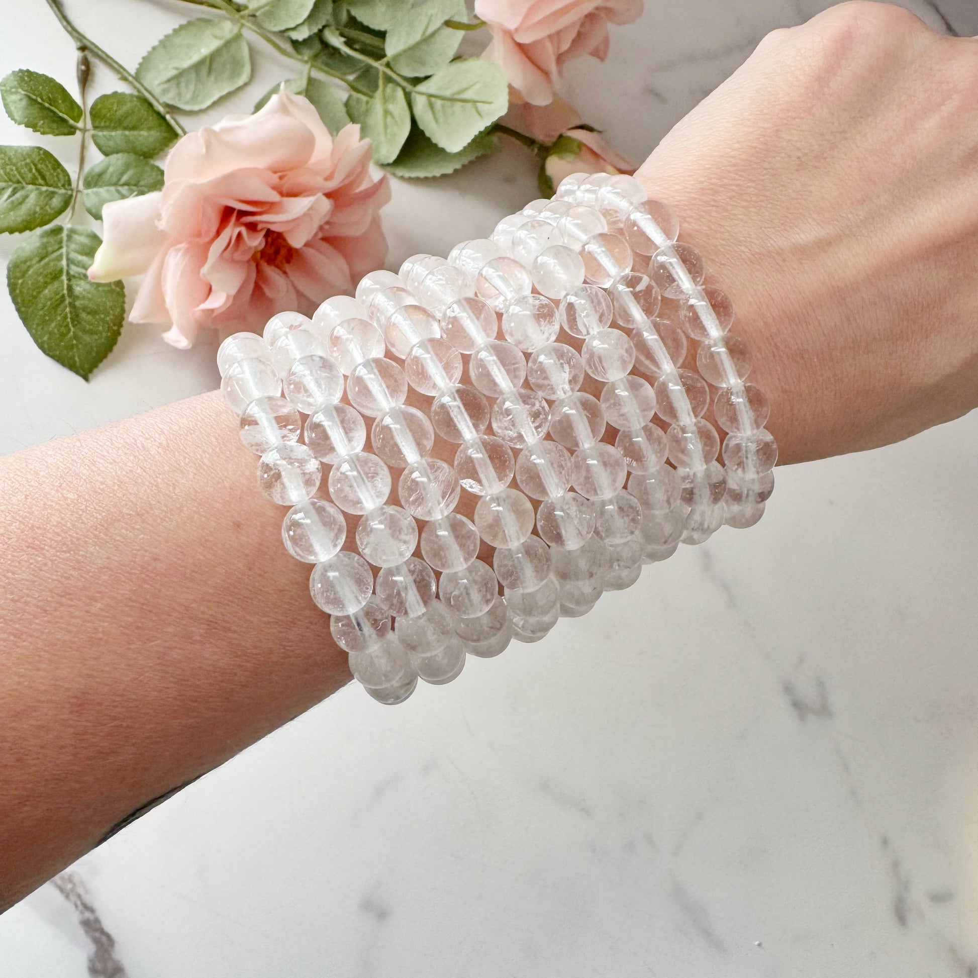 You will receive one (1) Clear Crystal Quartz energy bracelet, infused with Usui Reiki energy. These bracelets are made from 8mm clear quartz polished beads, are stretchable, and fit S/M wrists (fit up to 7-7.5" wrists comfortably.). The model shown in the photo is a small wrist, size 6".
