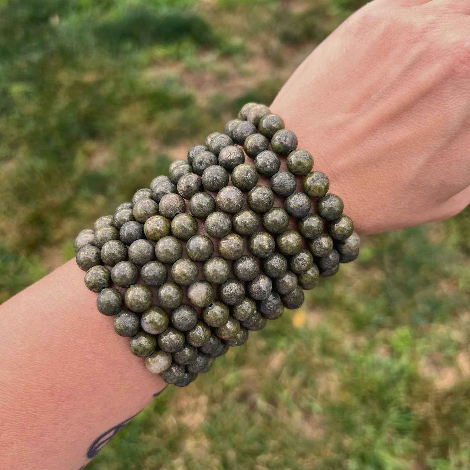 Embrace the harmonious blend of beauty and metaphysical properties with our Epidote with Pyrite beaded bracelet. Each bracelet features exquisite 8mm polished Epidote beads infused with the radiant energy of Pyrite. The Epidote in these beads is believed to enhance intentions, manifestation, and personal power, while Pyrite is often associated with abundance and protection.