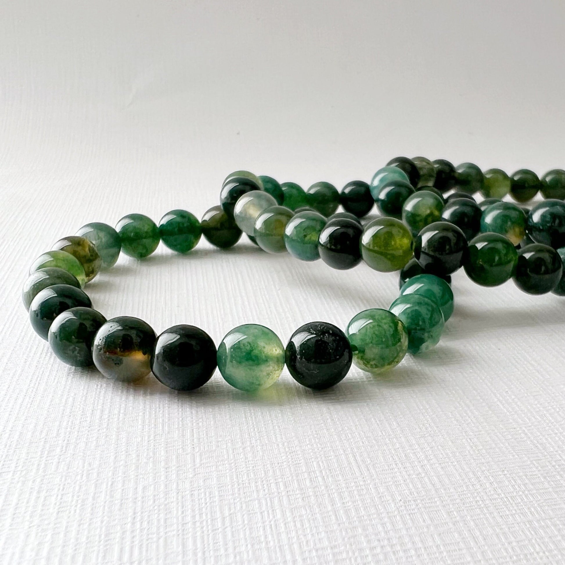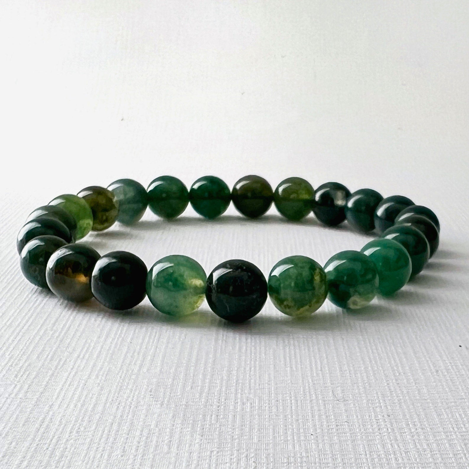 Introducing our captivating 8mm Green Moss Agate Stretch Bracelet. Handcrafted with care, this green moss agate beaded bracelet combines natural beauty with powerful metaphysical properties, making it a must-have accessory for any spiritual journey. The Green Moss Agate Bracelet features smooth, round beads, most displaying the mesmerizing moss-like inclusions that give this gemstone its unique and enchanting appearance. It's earthy tones and organic patterns create a sense of harmony and connection with nature, making it a perfect companion for those seeking grounding and balance.