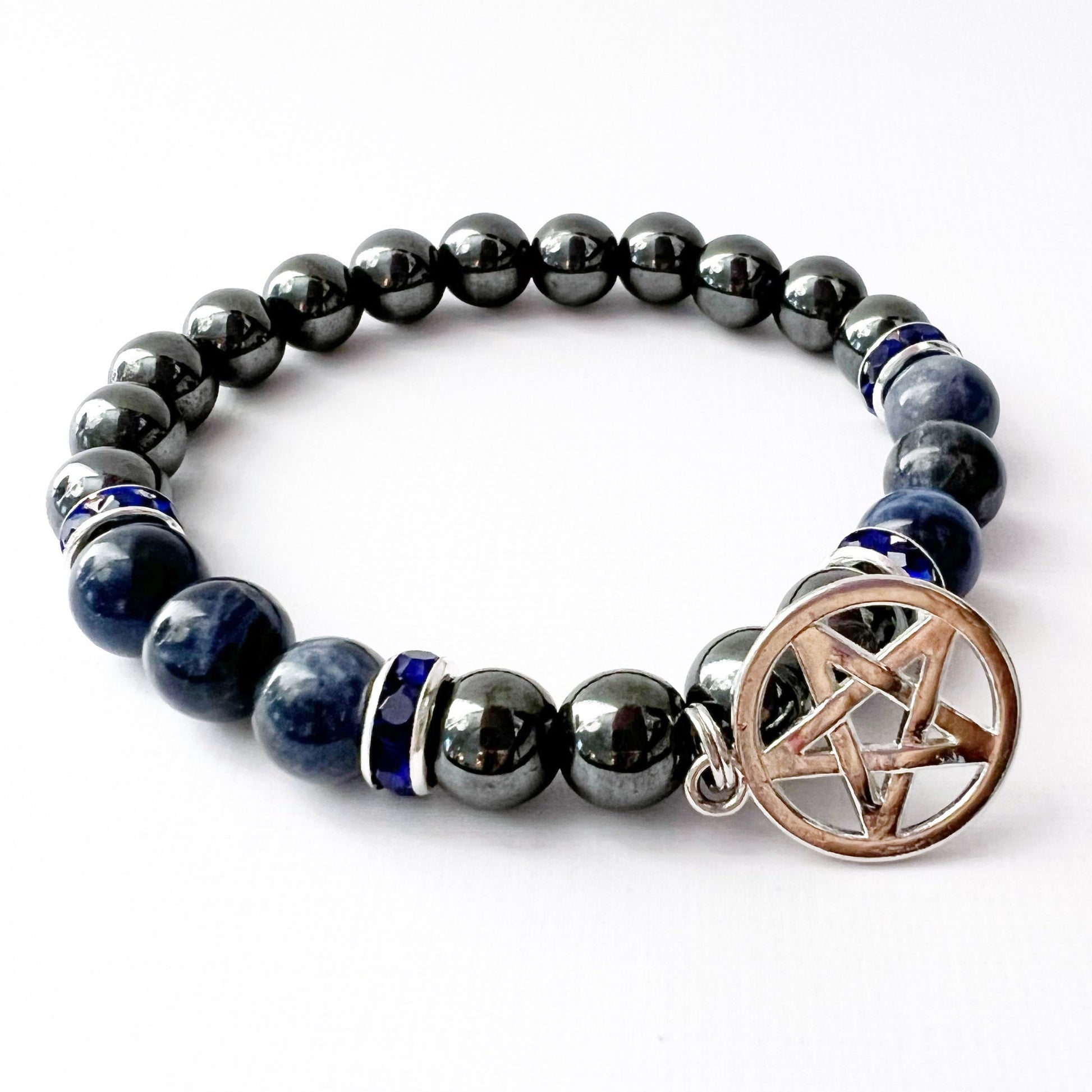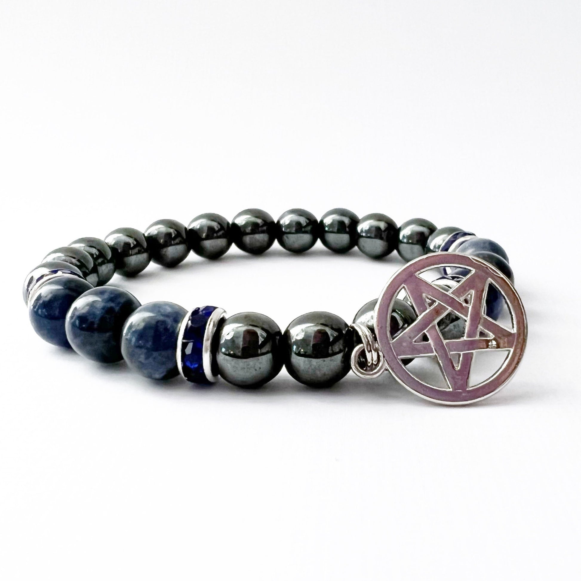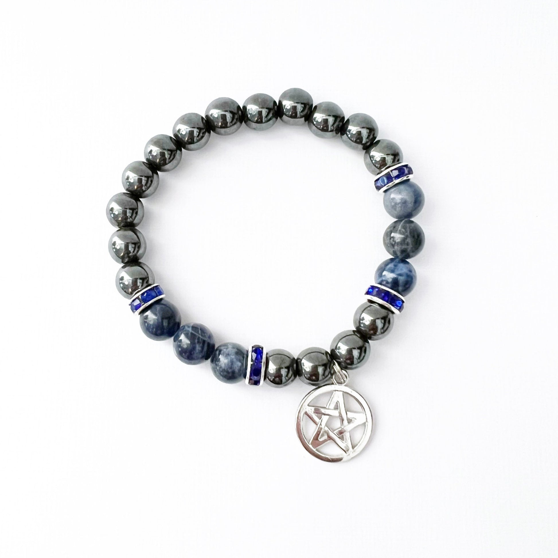 8mm Hematite & Sodalite Beaded Bracelet with Pentacle Charm