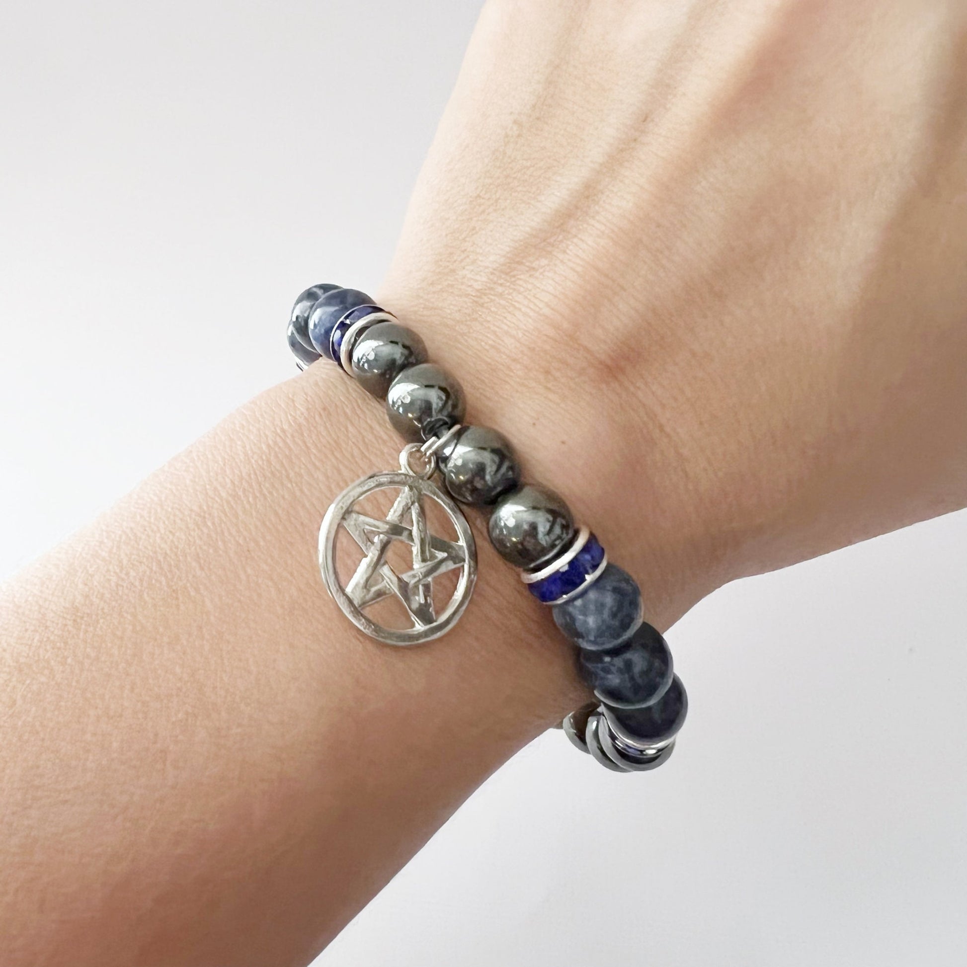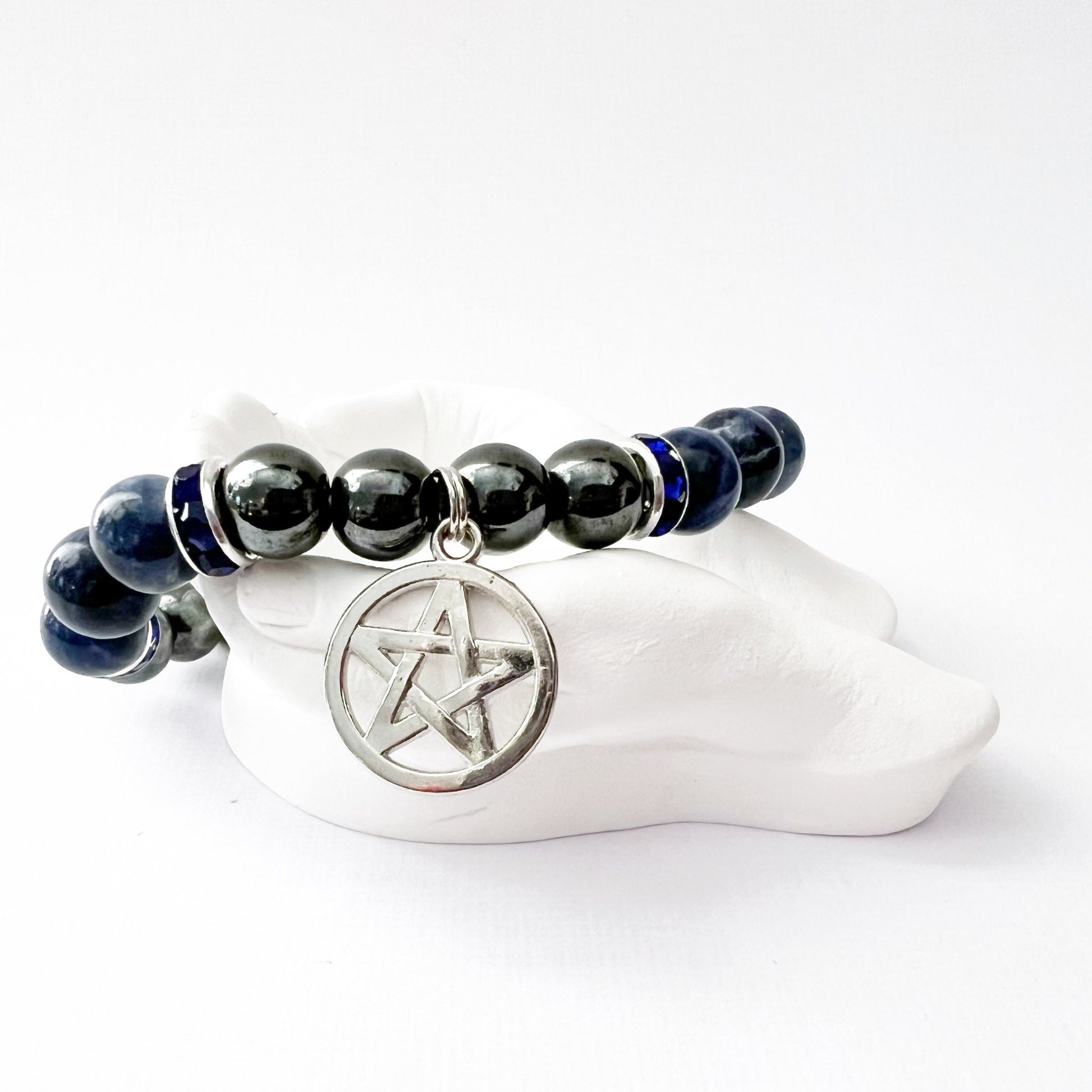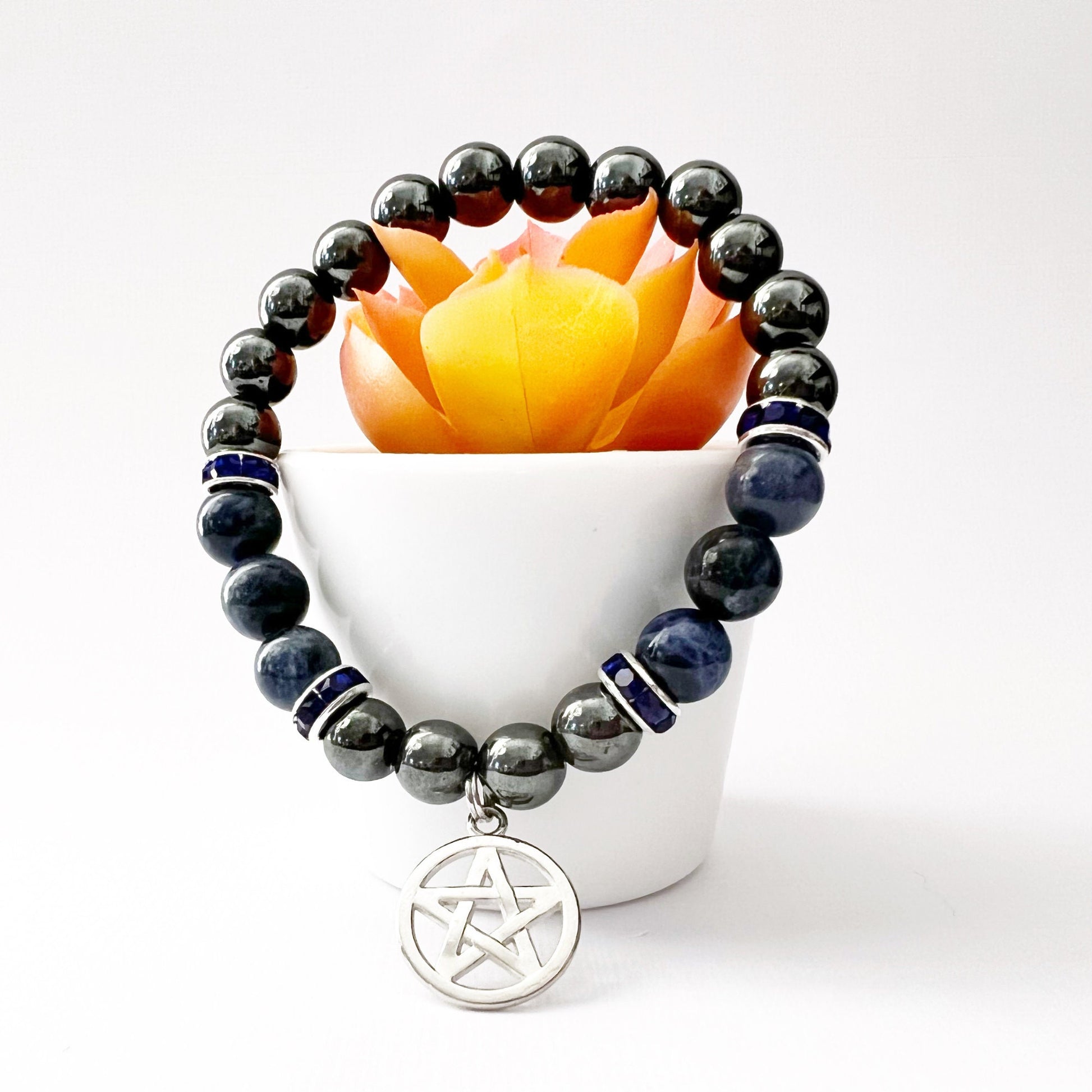 8mm Hematite & Sodalite Beaded Bracelet with Pentacle Charm