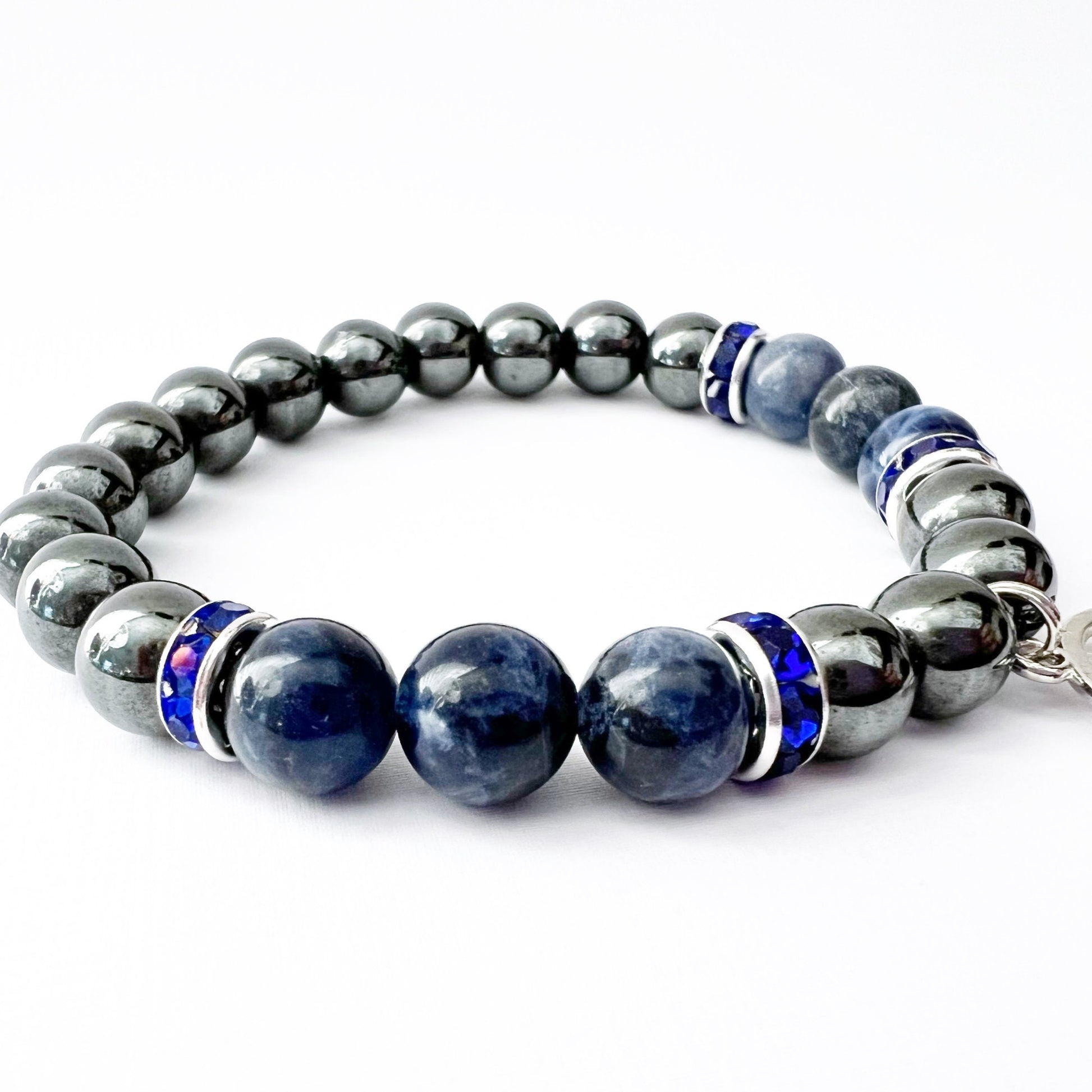 Introducing our beautifully crafted Hematite and Sodalite beaded bracelet, a harmonious blend of spiritual symbolism and natural gemstone energies. The bracelet features 8mm polished Hematite and Sodalite beads, chosen for their grounding and intuitive qualities. Hematite, with its metallic sheen, is celebrated for its ability to foster strength, endurance, and a strong connection to the earth. In contrast, Sodalite's deep blue hues promote wisdom, clarity, and emotional balance.