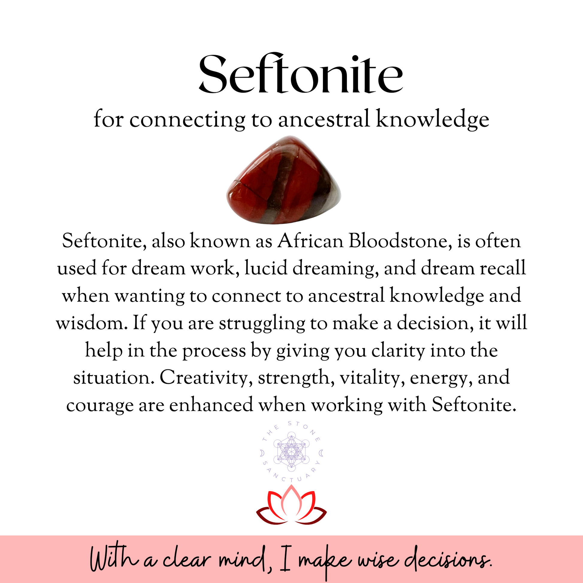 African Bloodstone / Seftonite is a stone of balance when we are feeling stressed. It helps to calm our minds, remove confusion, and can help to revitalize us. Seftonite enhances both our creativity and our intuition and also helps us to make the most of whatever talents and abilities we possess. It stimulates emotional growth and sensitivity and helps develop our ability to make decisions. Whilst Seftonite provides us with inner strength and courage, it also helps us to avoid dangerous situations by helping us to recognize when we need to either make a strategic withdrawal or be much more flexible.