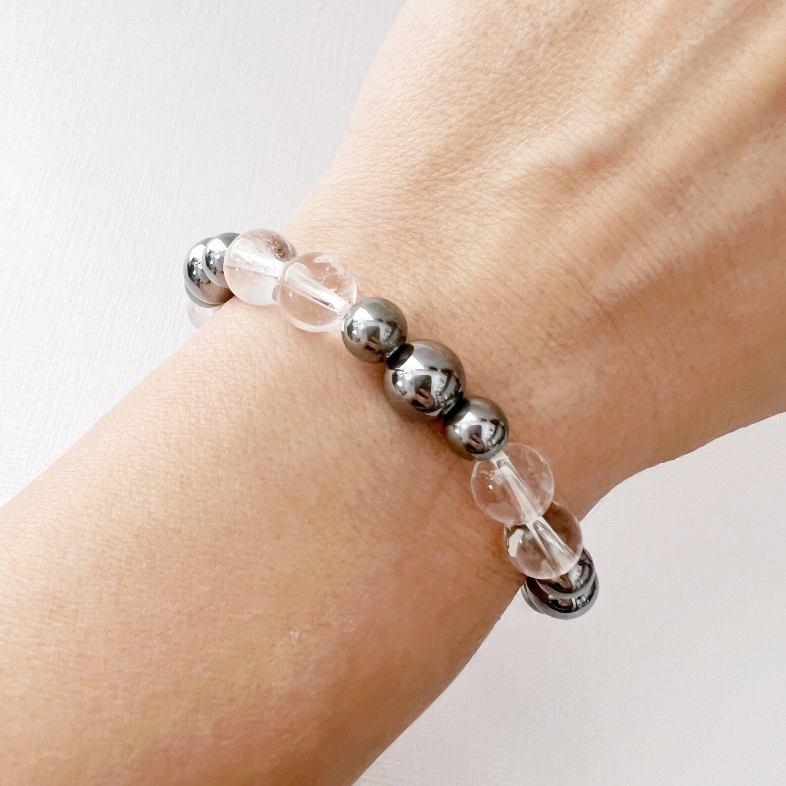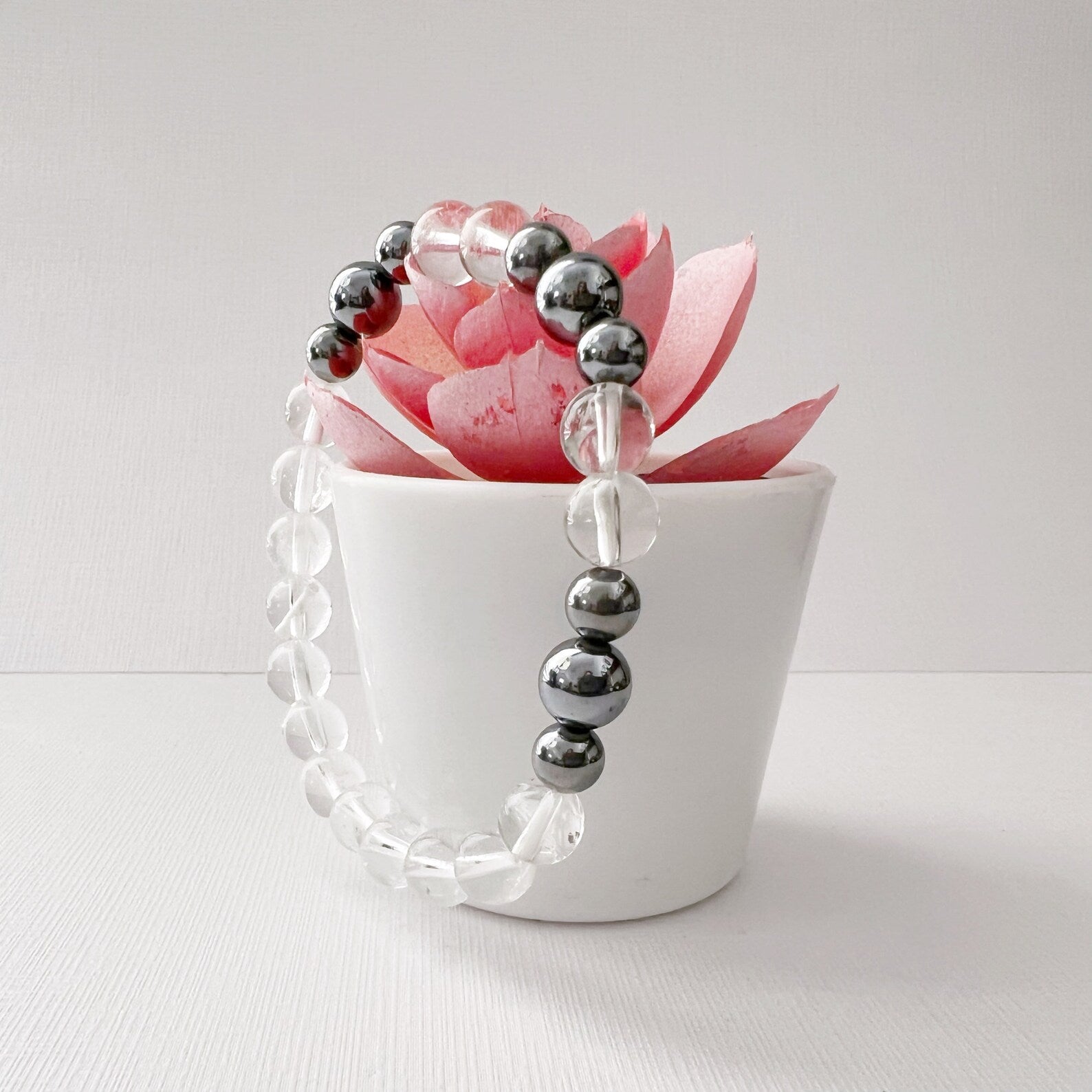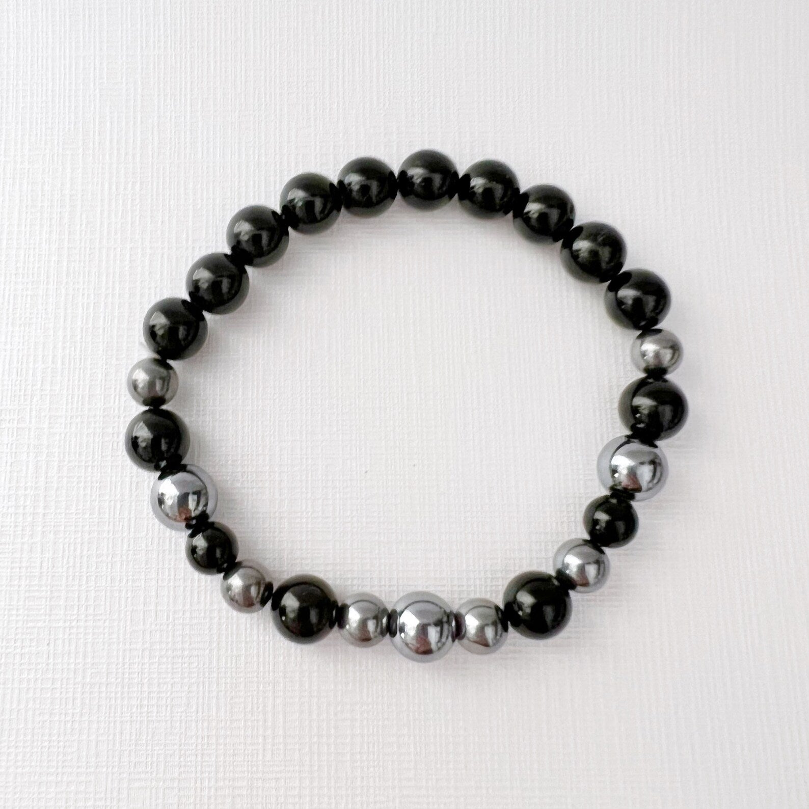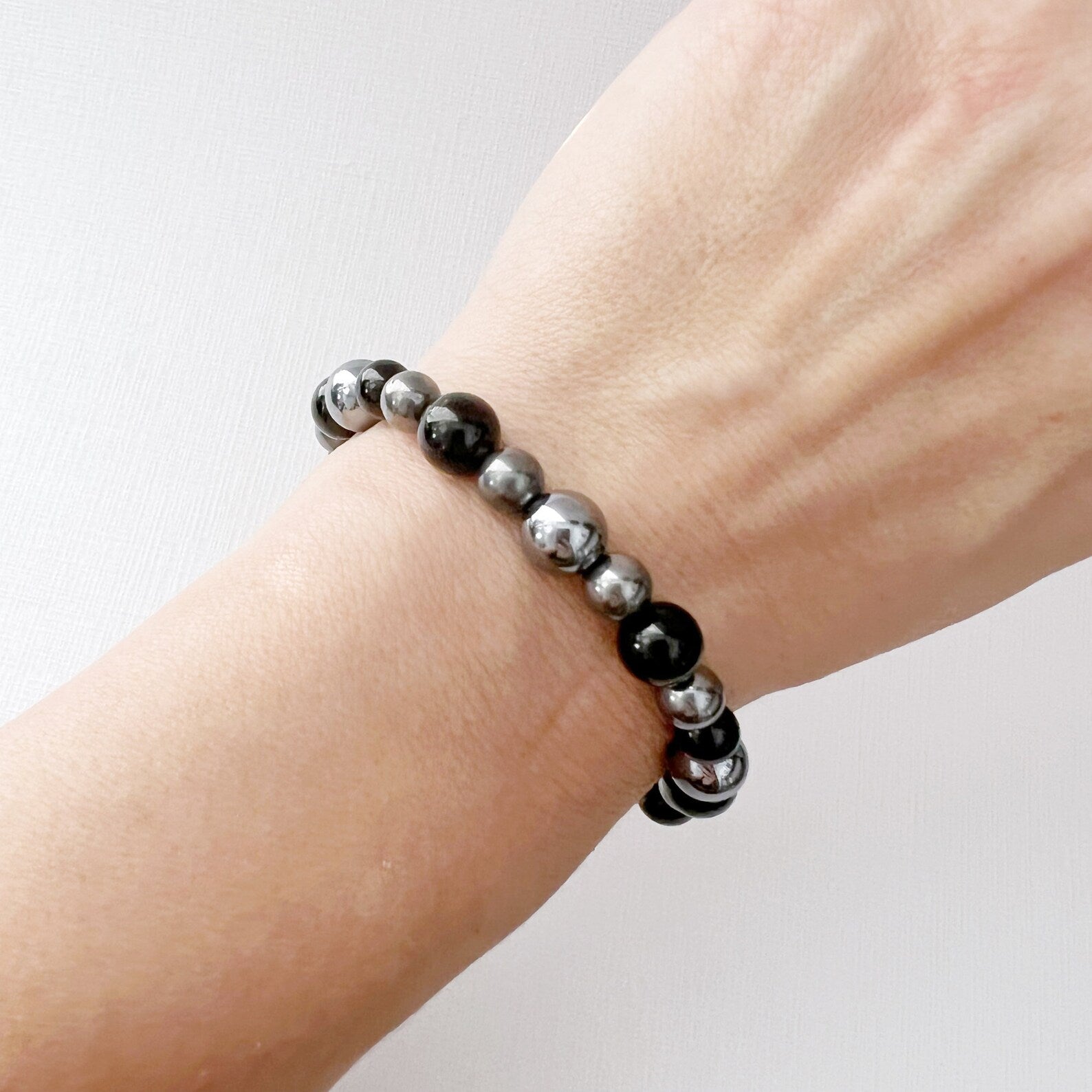 Elevate your style with our Terahertz beaded bracelet, available with either Clear Quartz or Black Tourmaline beads. These exquisite bracelets are crafted from 6-8mm Terahertz polished beads combined with 8mm Clear Quartz or Tourmaline beads. They are designed to be stretchable and comfortably fit wrists measuring up to 7-7.25 inches.