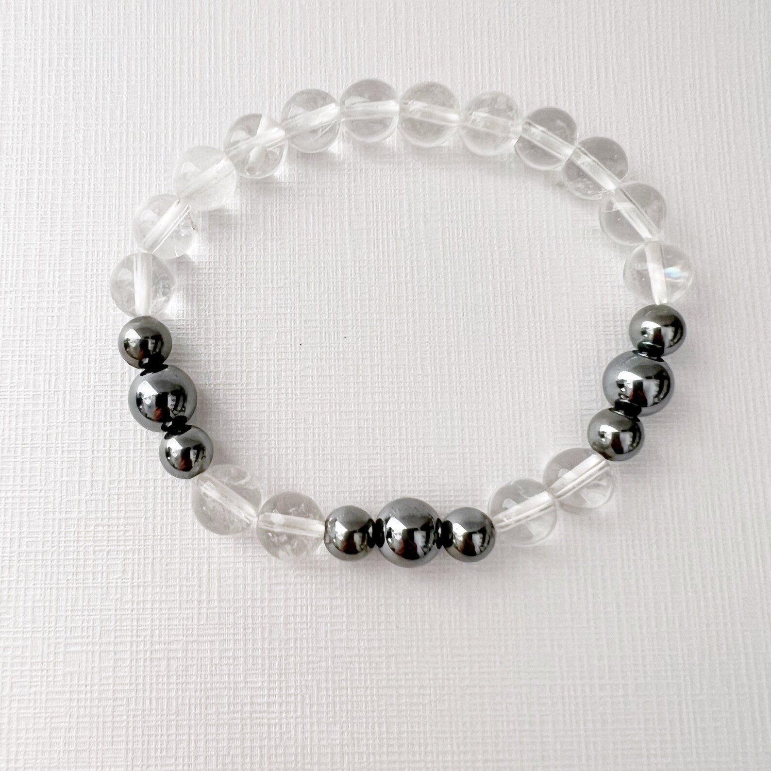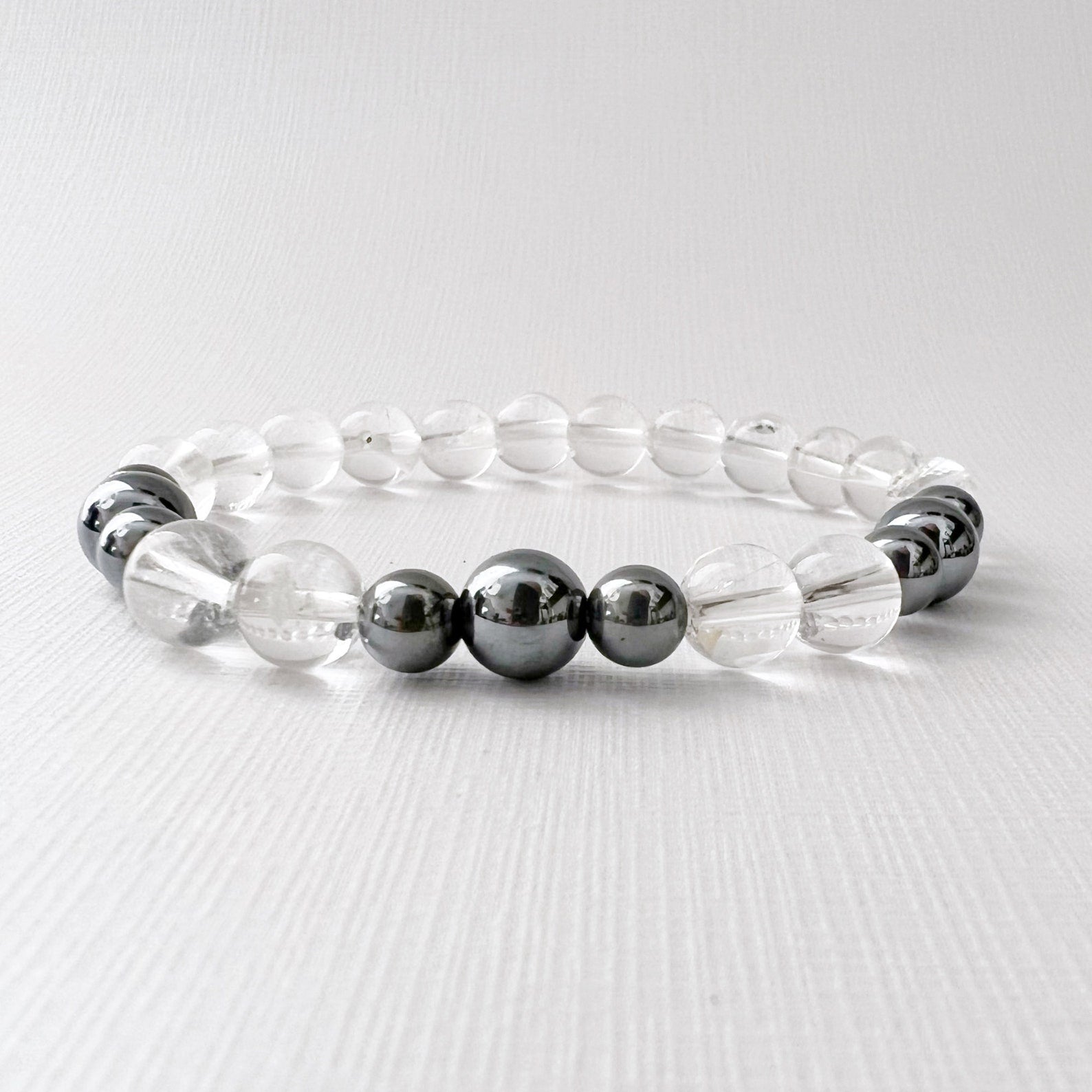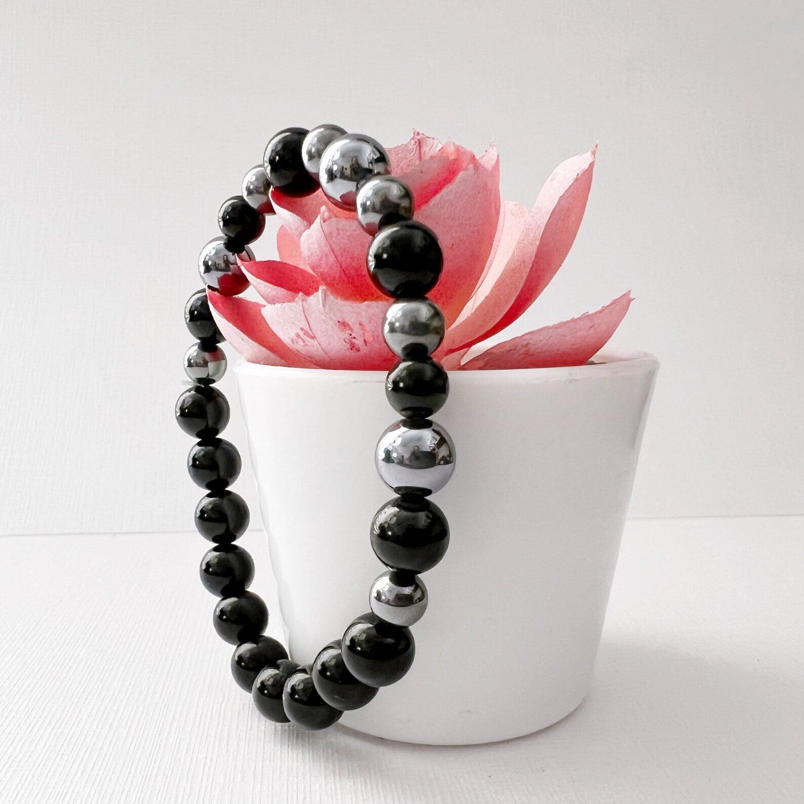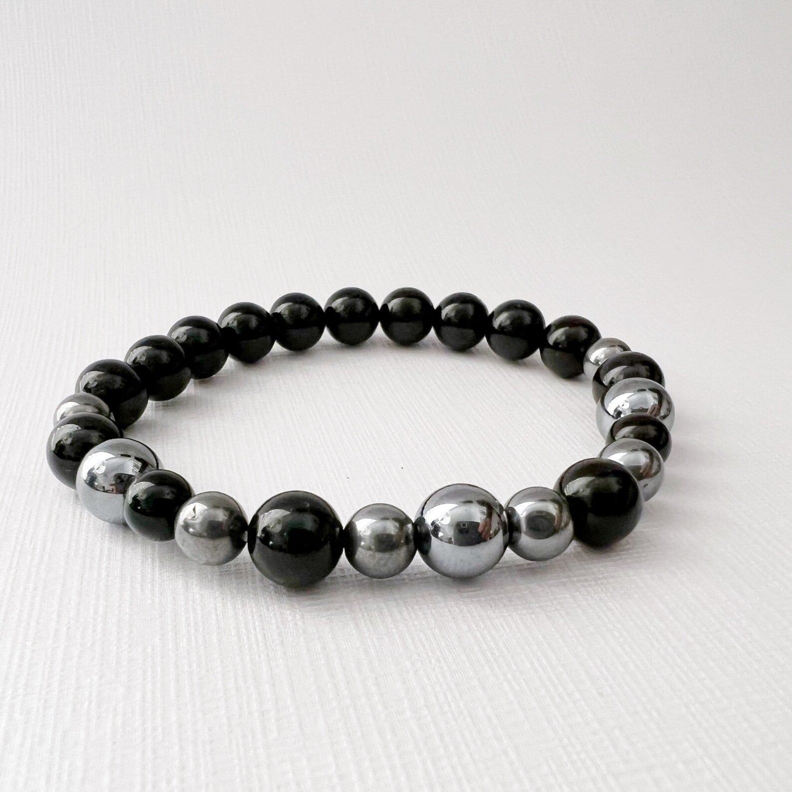 Elevate your style with our Terahertz beaded bracelet, available with either Clear Quartz or Black Tourmaline beads. These exquisite bracelets are crafted from 6-8mm Terahertz polished beads combined with 8mm Clear Quartz or Tourmaline beads. They are designed to be stretchable and comfortably fit wrists measuring up to 7-7.25 inches.
