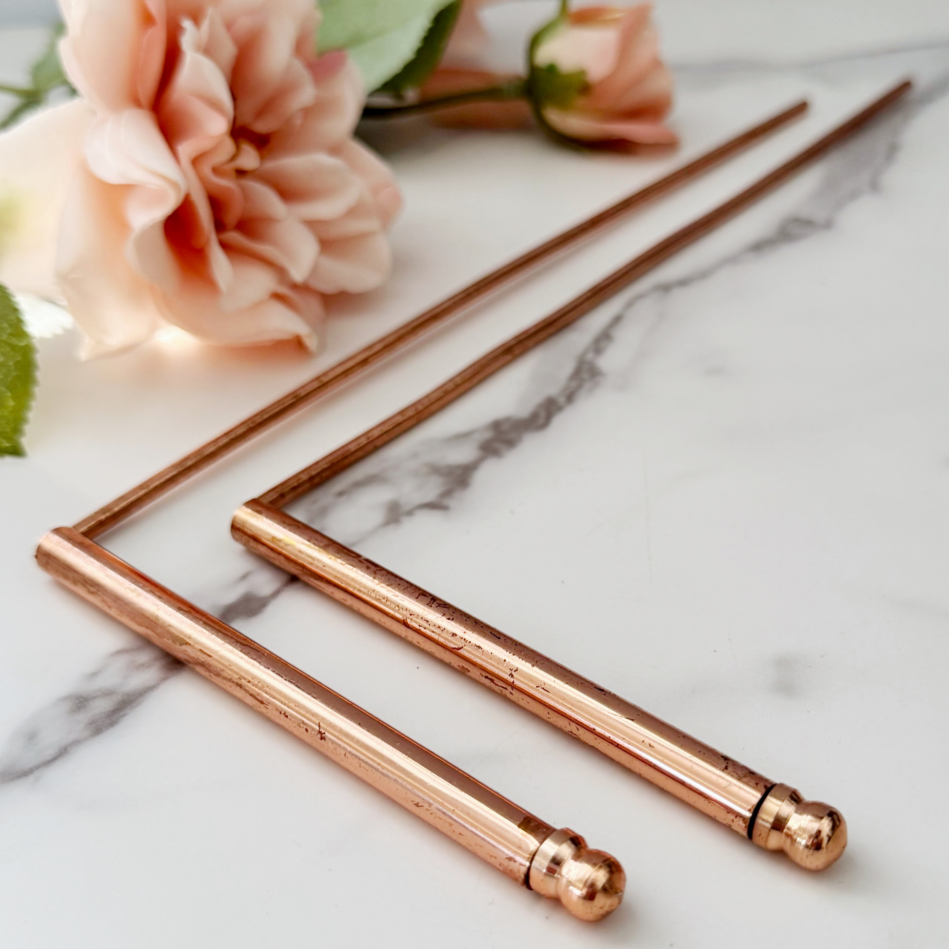 Discover the subtle energies around you with our beautifully crafted Copper Dowsing Rods. Each set includes two solid copper rods, each measuring 9.5 inches in length and 4.5 inches in width, perfect for various dowsing applications including energy work, finding lost objects, or exploring mysterious underground sources.