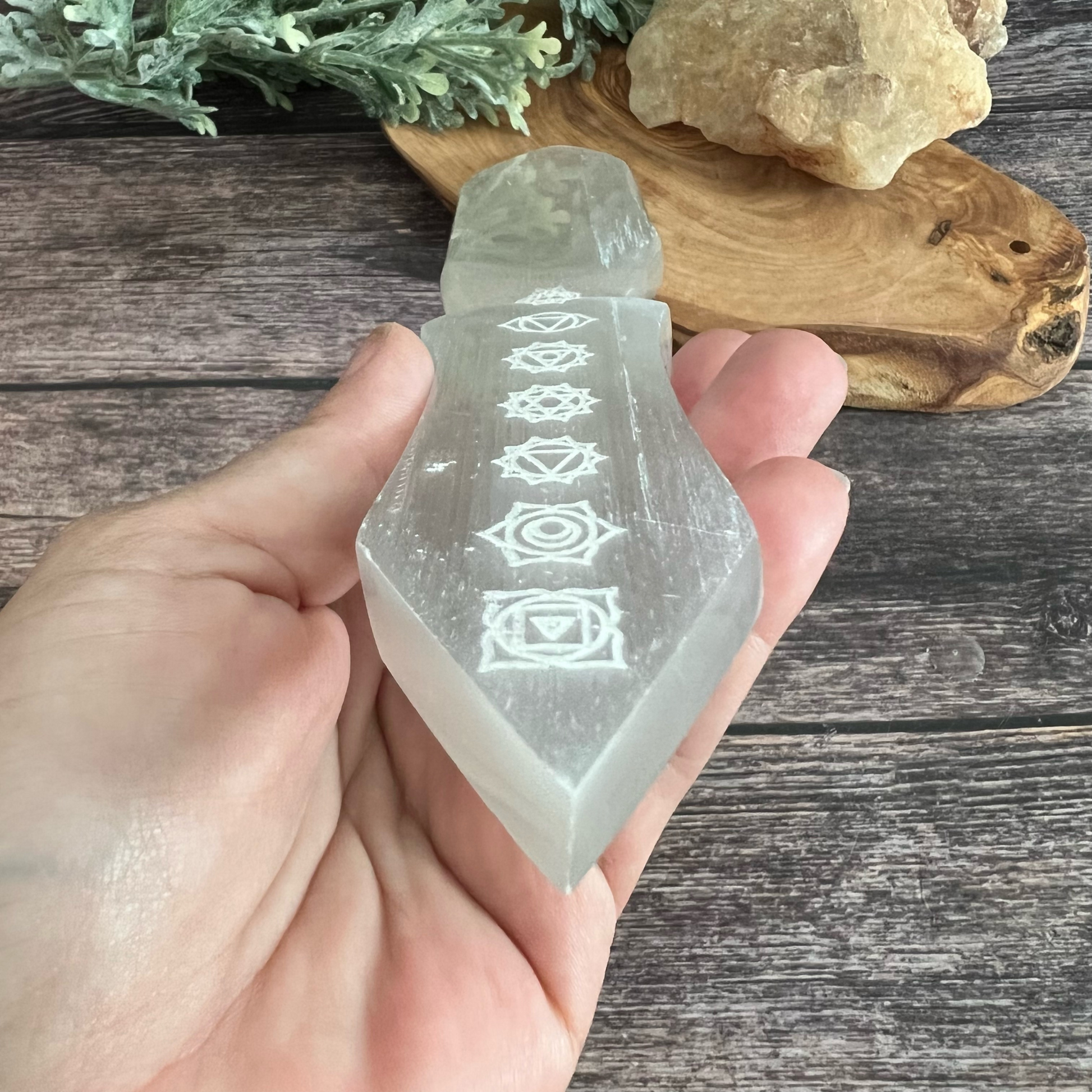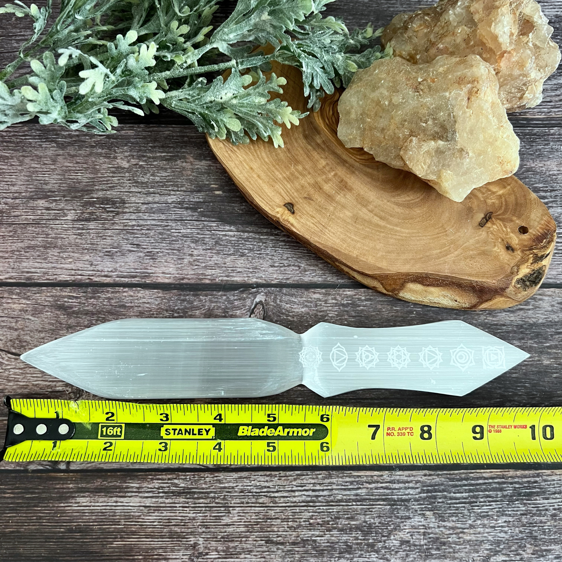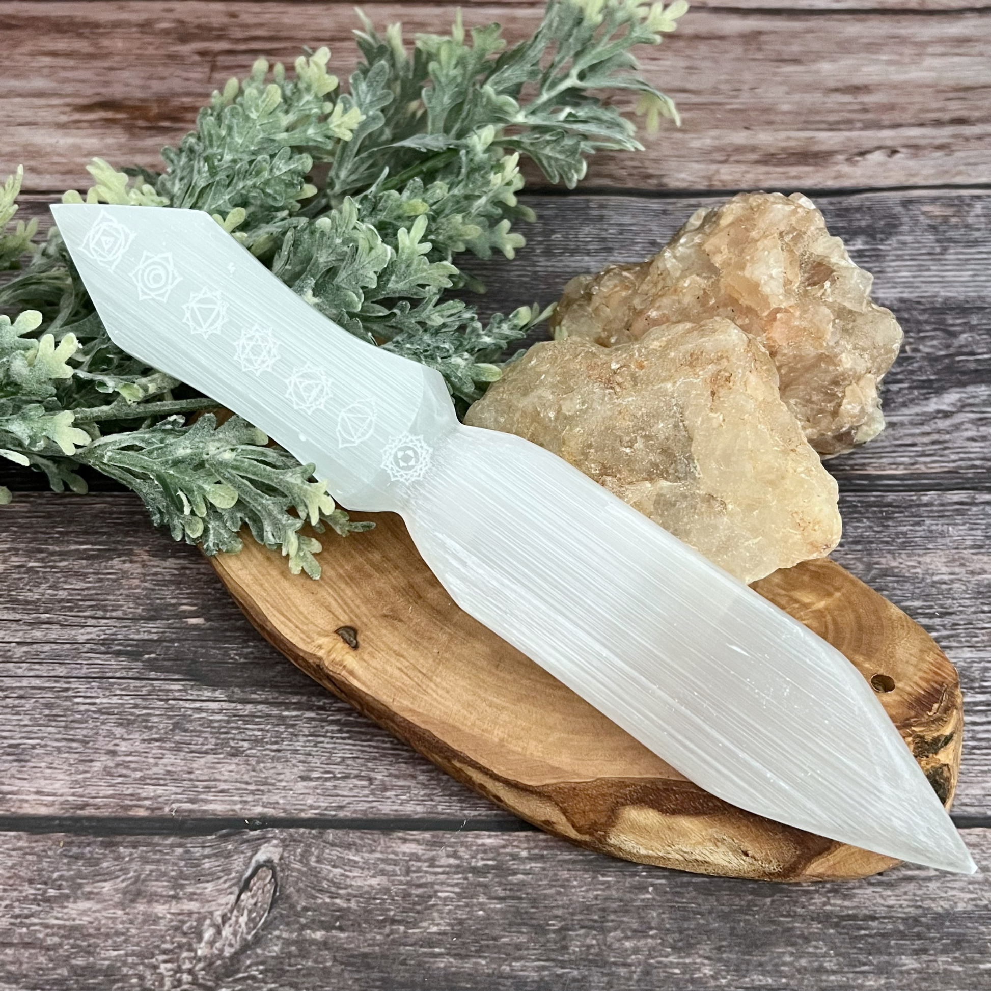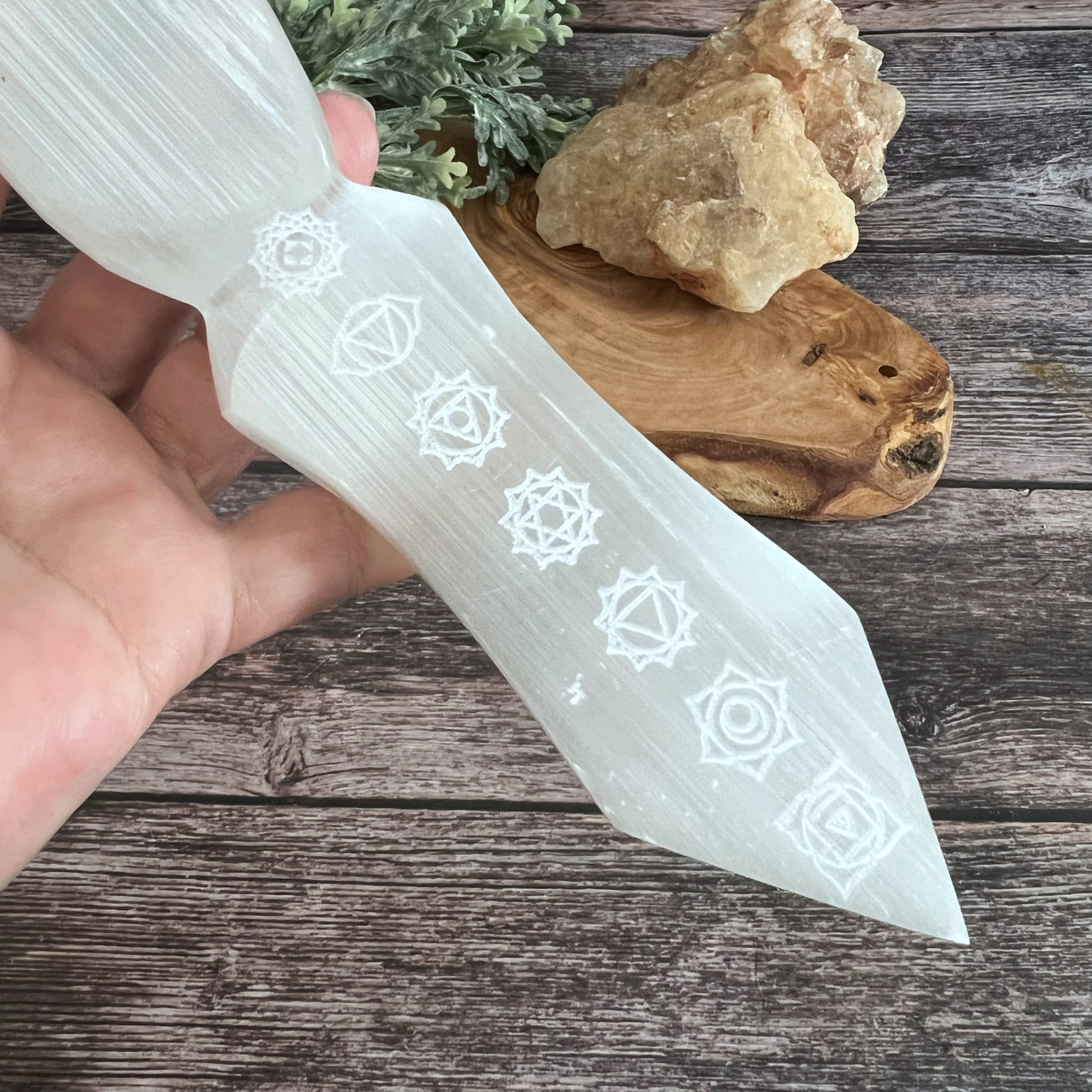You will receive 1 Selenite Athame engraved with the seven chakras in the handle. This athame is approx 8" long as is hand-carved and laser engraved so please allow for minor variances. This athame has Selenite's characteristic snowy glow and a feeling of direct connection to the divine.
