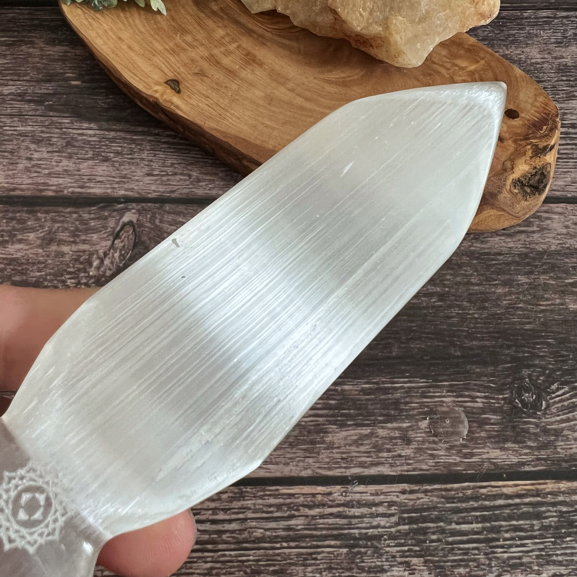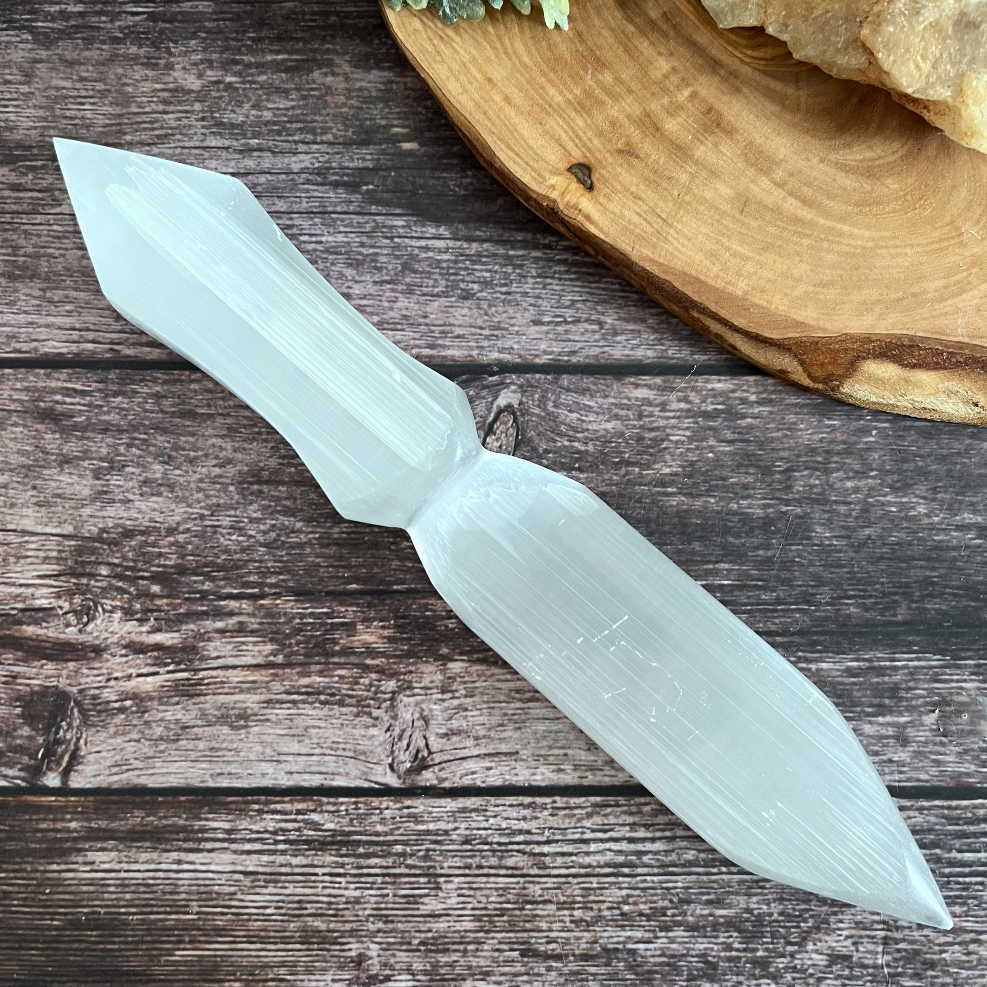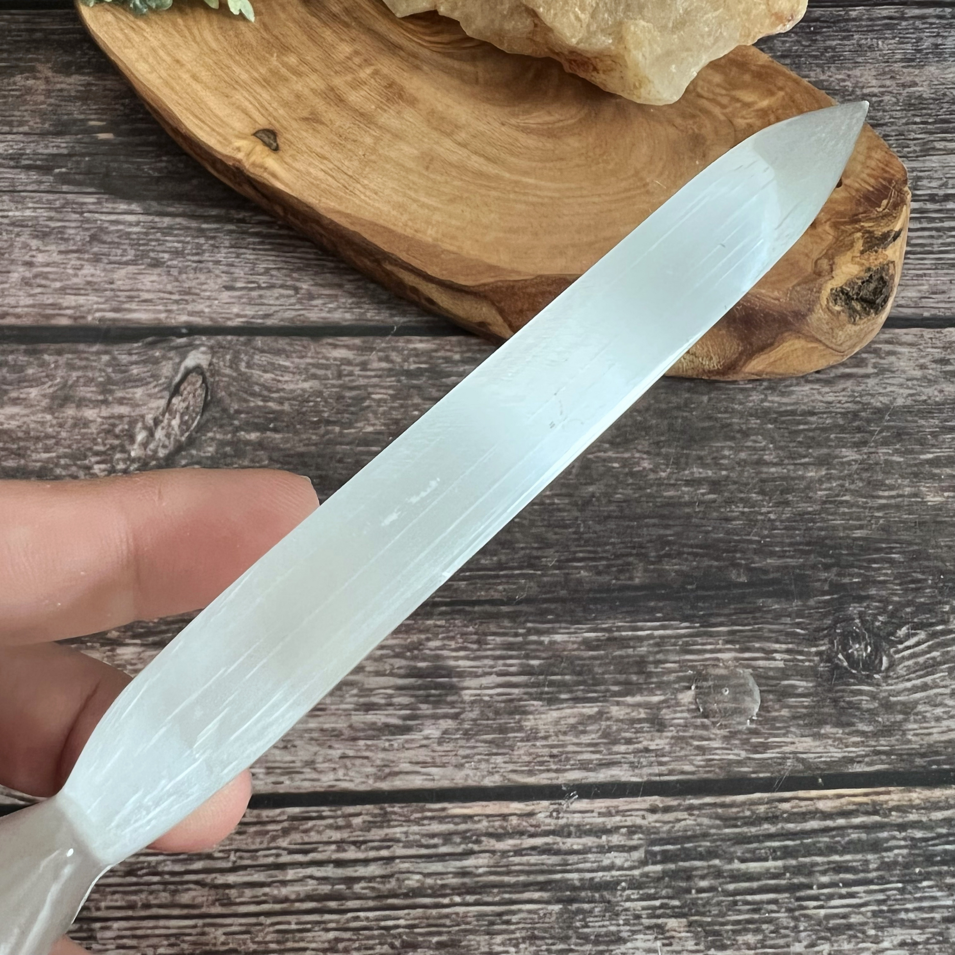 Athames are traditional ceremonial magic tools in Wiccan and Pagan rituals and spellwork. Selenite purifies spaces and raises the vibration. These selenite athames are excellent companions for circle opening and closing, charging and dedicating items, cord cutting rituals, and boundary-setting work. Work with them to lift, lighten, and protect your sacred spaces. Work with a Selenite Athame to open and close circles, especially during moon rituals.