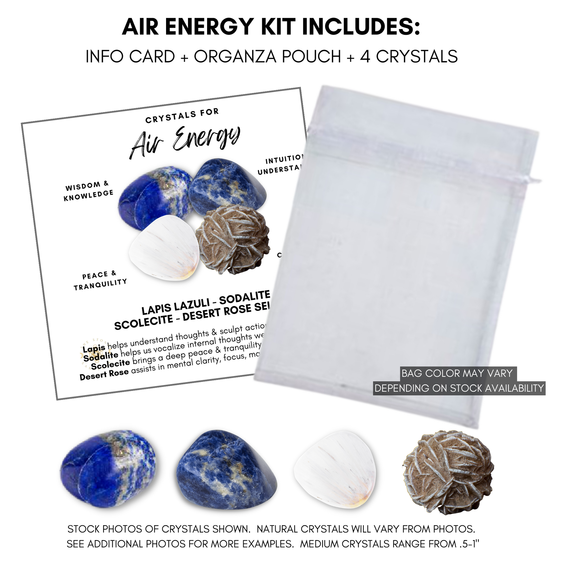You will receive 1 Crystals for Air Healing Energy Kit which includes the info card, 4 hand selected healing crystals, and organza pouch.