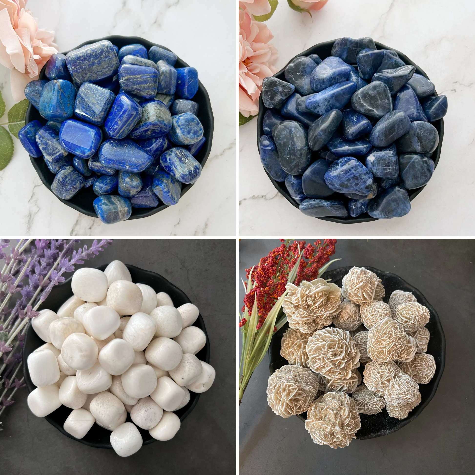 🔵 Lapis Lazuli -  encourages self-awareness, honesty, and communication, embodying the depth and wisdom of the sky.
