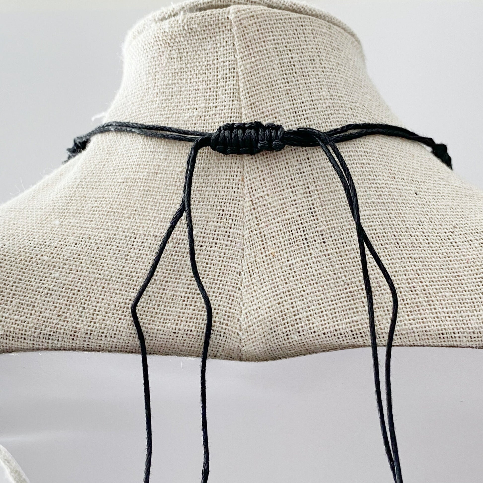This Amethyst Crystal Point Net Cord Necklace is made from a black wax cord and is handwoven into a net to hold the point, then finished with rose quartz and amethyst beads and an adjustable knotted clasp. This Amethyst Point Crystal Necklace is 14” L at its shortest and 30” L when it’s full length.