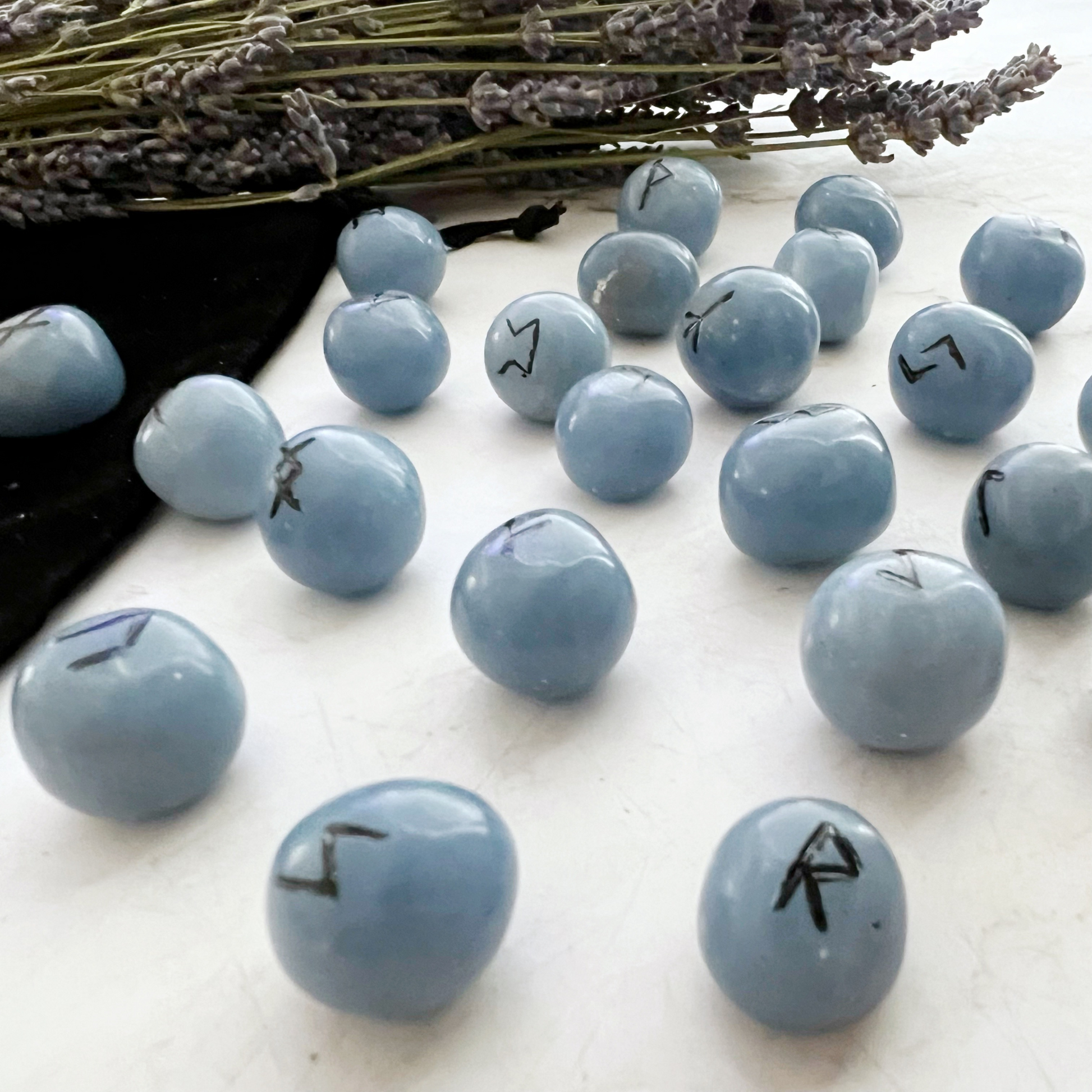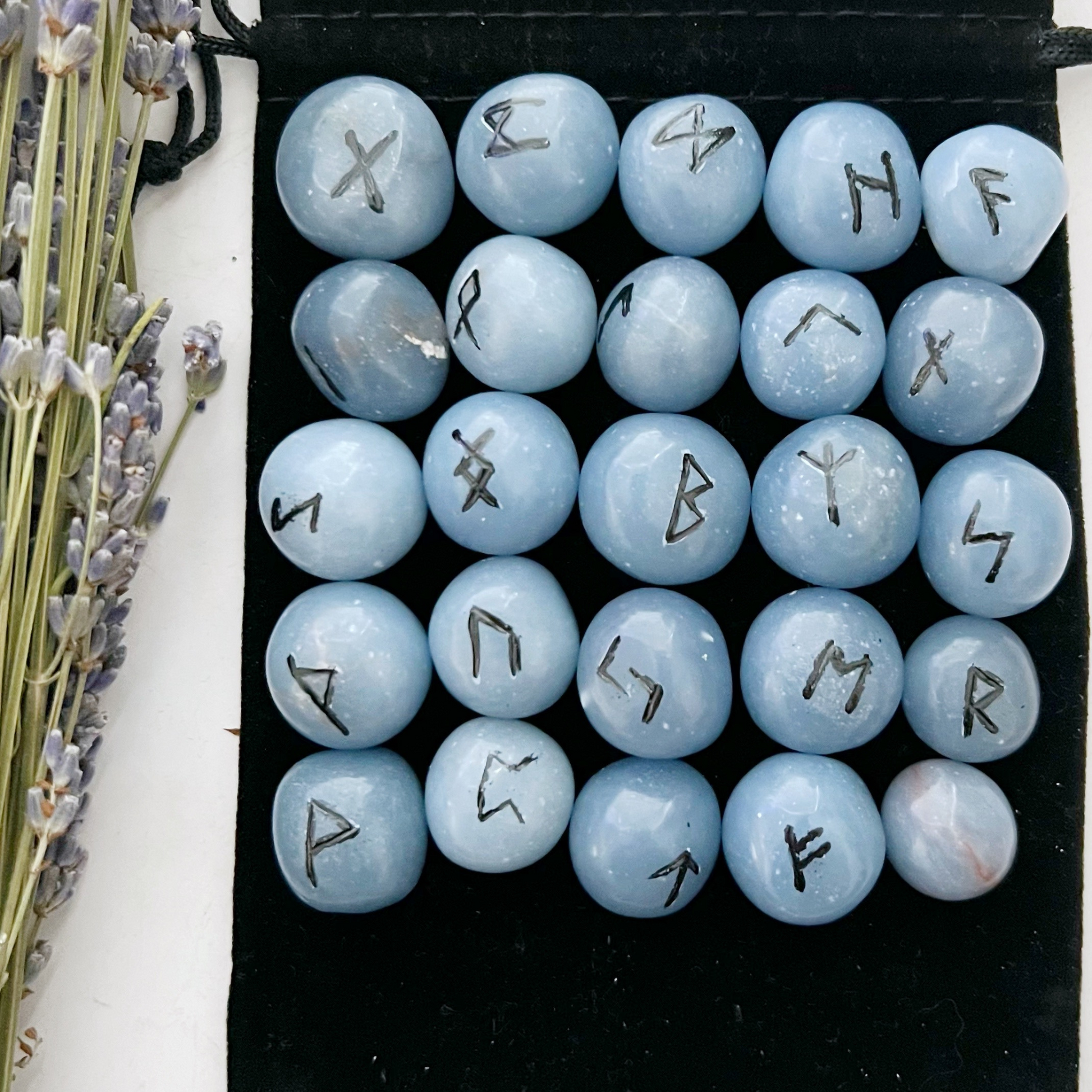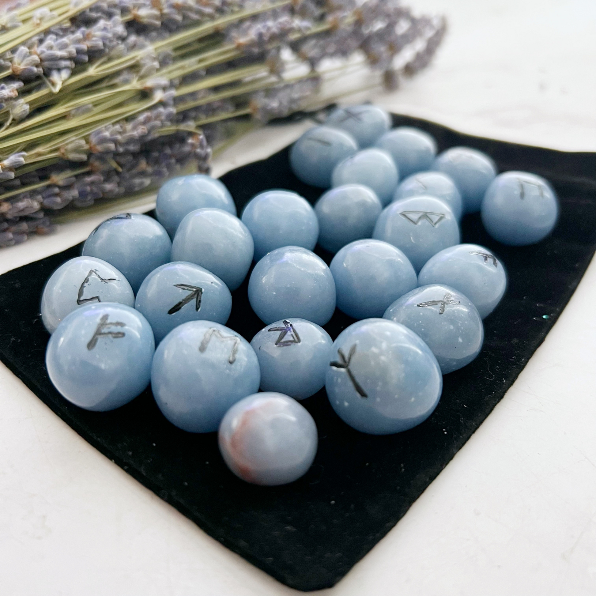 Embark on a celestial journey of divination with our Angelite Runes Stones, a set echoing the ethereal wisdom of the Elder Futhark script. Each rune, meticulously carved into the serene blue surface of Peruvian Angelite, provides a tactile and spiritual medium for seekers aligned with witchy, Nordic, Norse, Viking, and Pagan traditions, acting as a conduit between ancient sorcery and modern mysticism.