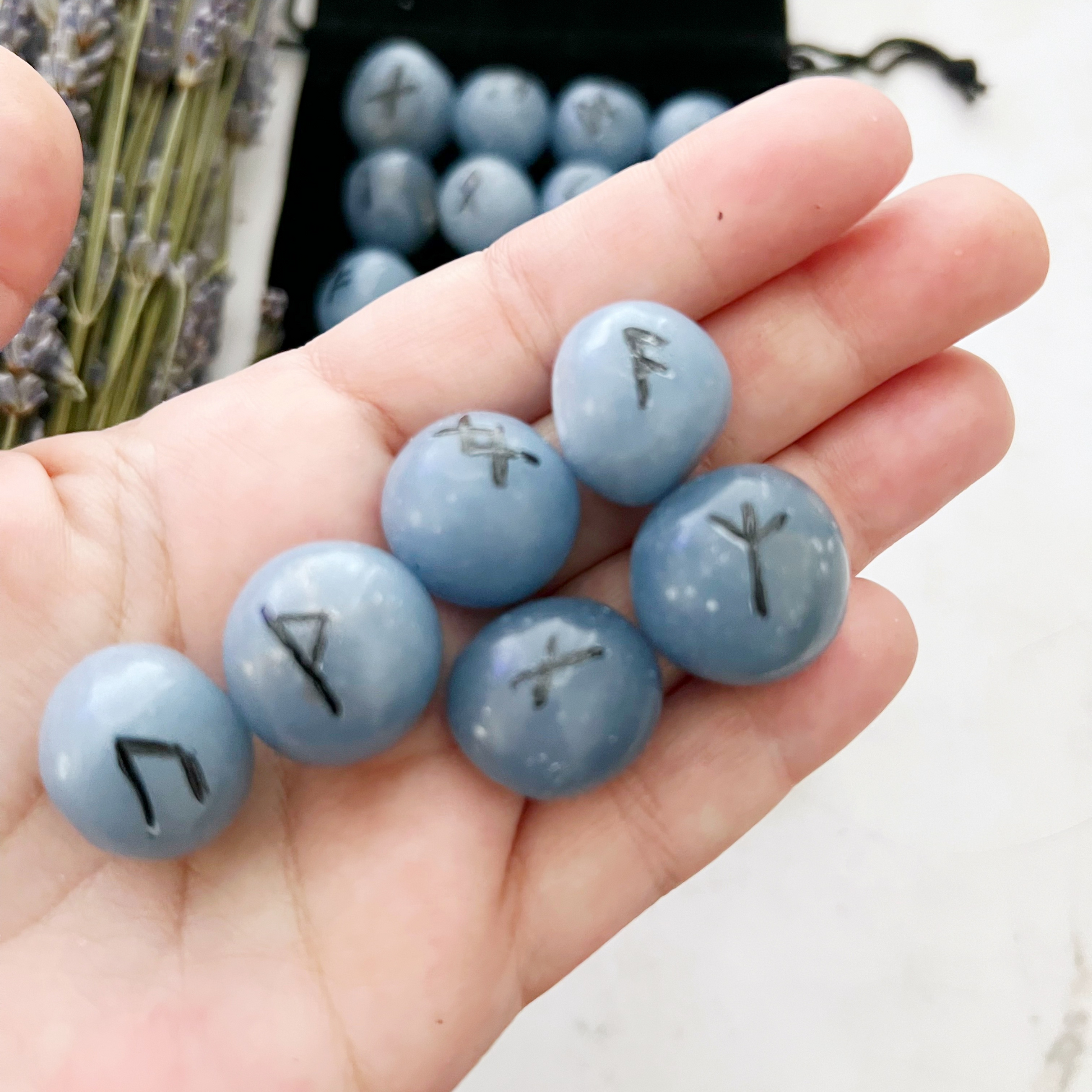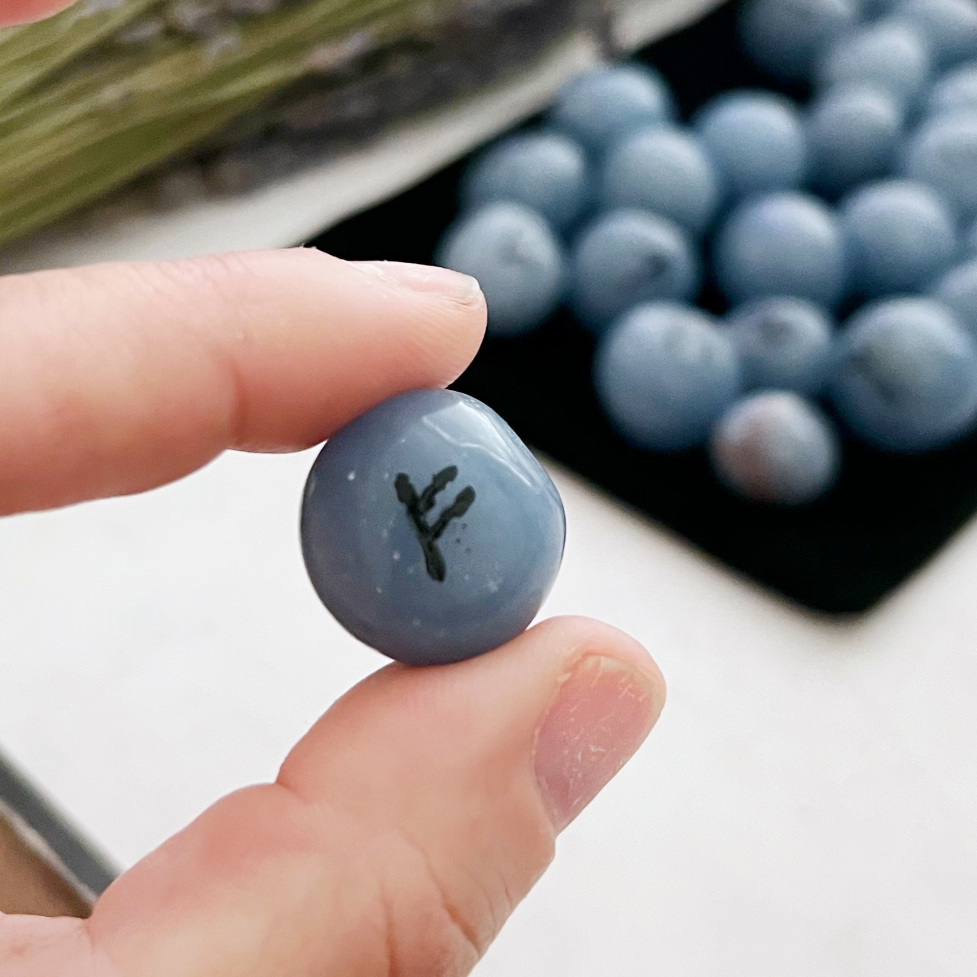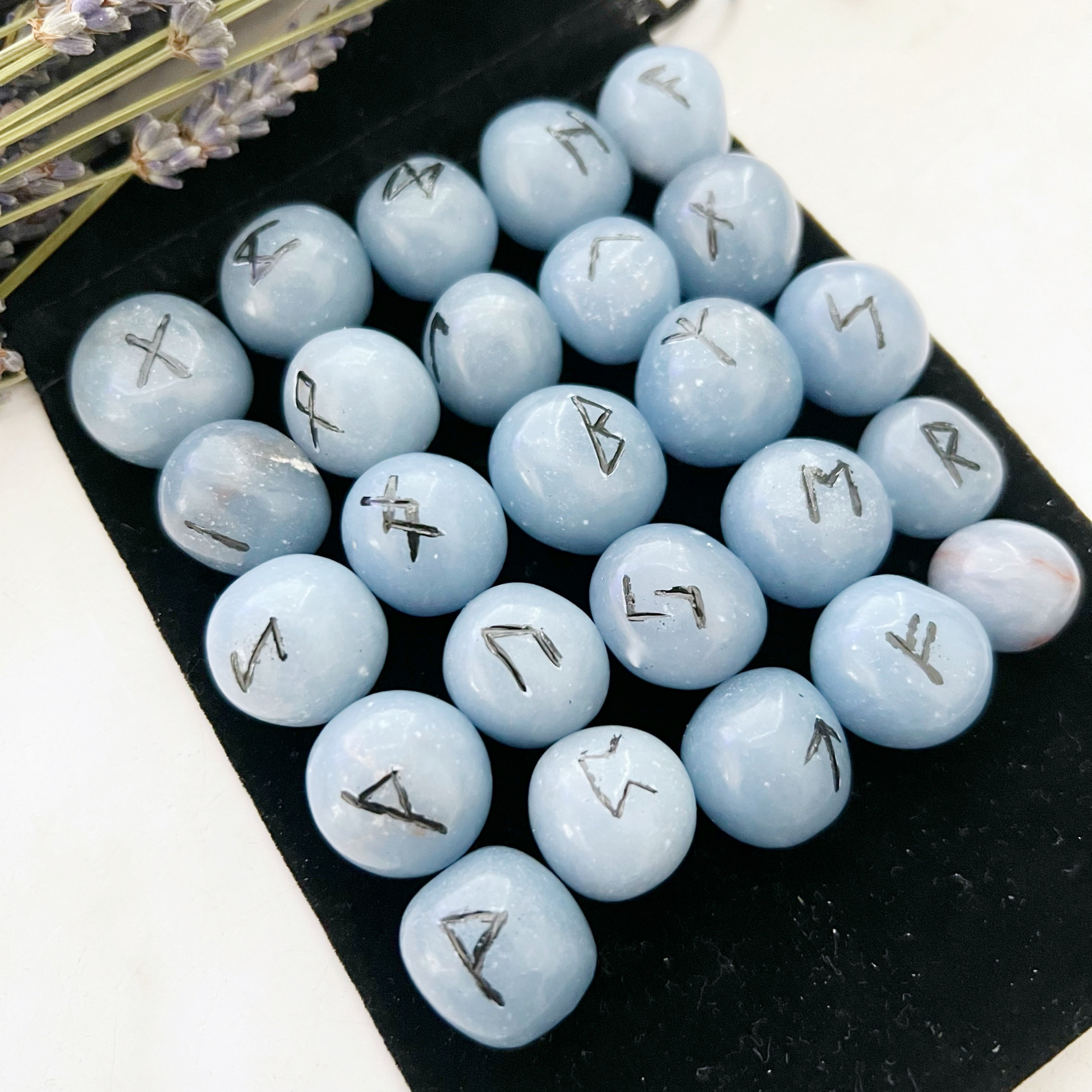 Embark on a celestial journey of divination with our Angelite Runes Stones, a set echoing the ethereal wisdom of the Elder Futhark script. Each rune, meticulously carved into the serene blue surface of Peruvian Angelite, provides a tactile and spiritual medium for seekers aligned with witchy, Nordic, Norse, Viking, and Pagan traditions, acting as a conduit between ancient sorcery and modern mysticism.