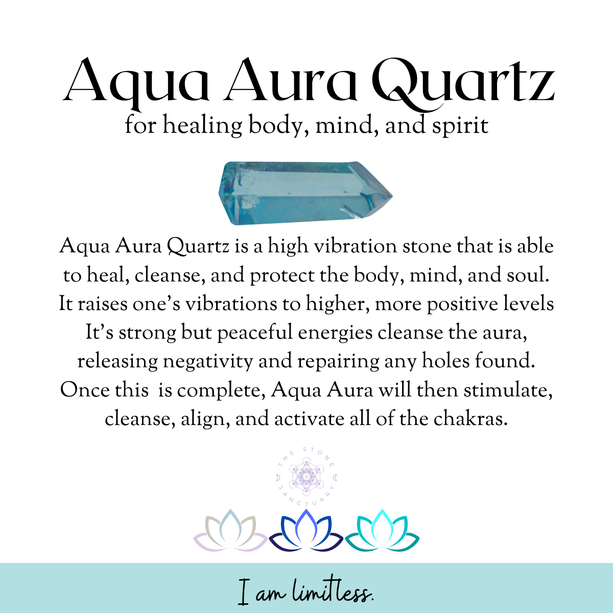Aqua Aura safeguards against psychic attack, energy drain and provides profound peace during meditation, opening gateways to the angelic realm. It is highly beneficial in multidimensional and cellular memory healing, and is an efficient receptor for programming and bringing the body into balance.