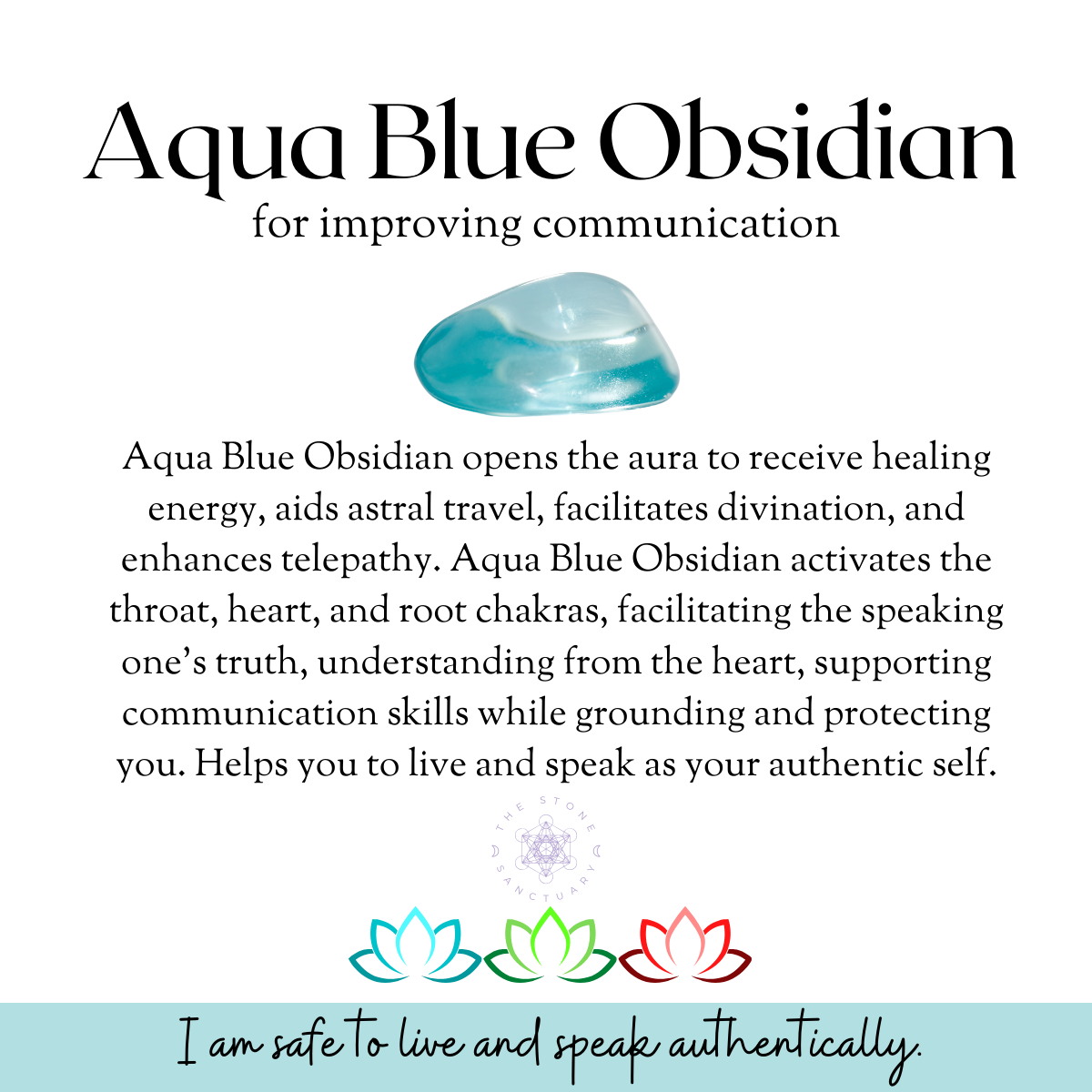 Aqua Blue Obsidian has a beautiful hue and shares similar color schemes to the Aegean Sea on a smooth sunlit day. Aqua Blue Obsidian opens the aura to receive healing energy, aids astral travel, facilitates divination, and enhances telepathy. Aqua Blue Obsidian activates the throat and heart chakra a opens the heart and throat chakras, facilitating the speaking one's truth, understanding from the heart, and supporting communication skills. For anyone who is trying to live their authentic self Aqua Blue Obsidian is a must-have to add to your crystal cabinet.