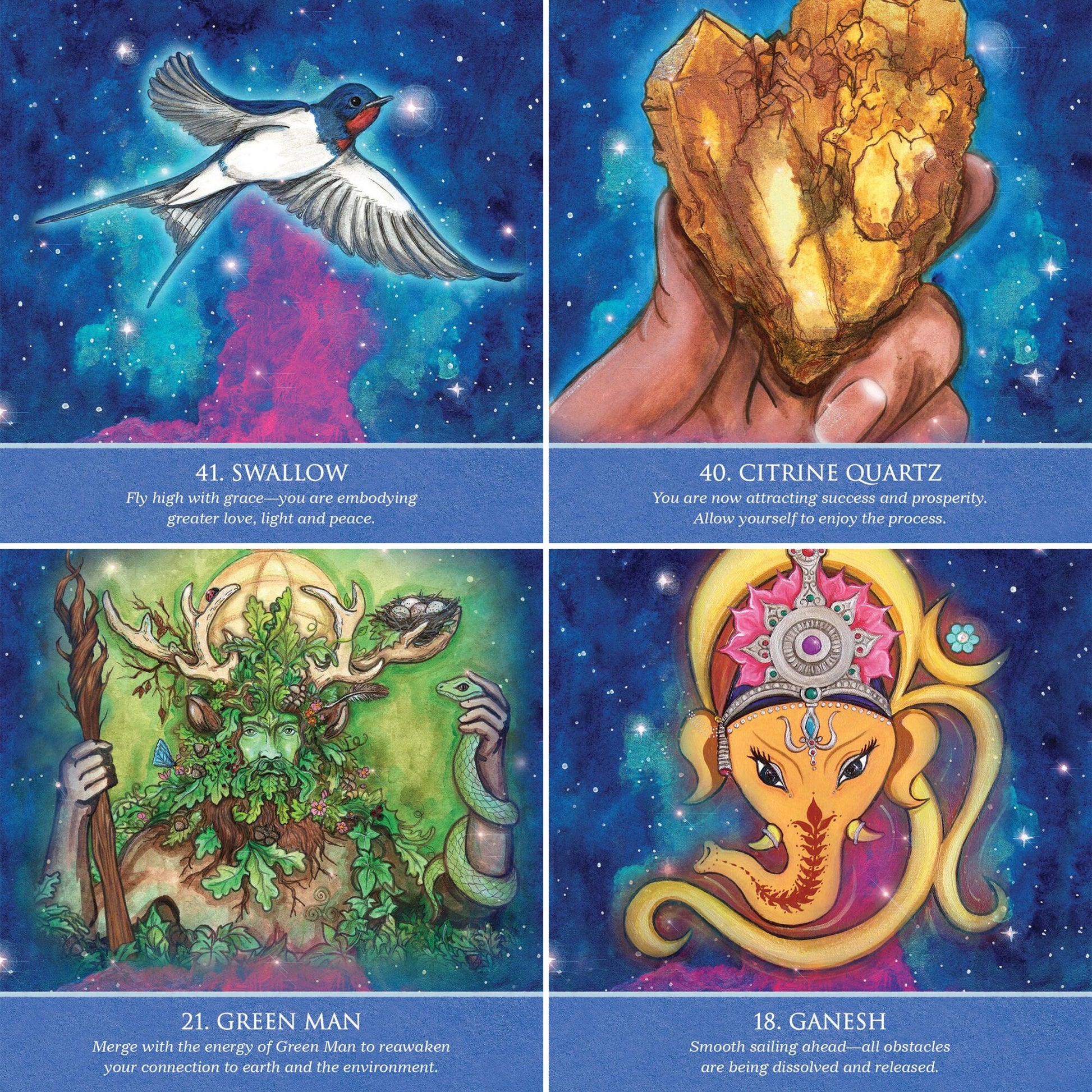 Auspicious Symbols for Luck and Healing is a vibrant 44-card deck and book set presenting good luck charms, mystical images, talismans, multi-cultural deities and spiritual healers with messages of positivity and enlightenment. This deck includes symbols that suggest not only luck but also health and healing, abundance and opportunities. Healing energy brought forth by these many symbols and images offer powerful medicine for the body, spirit and mind.