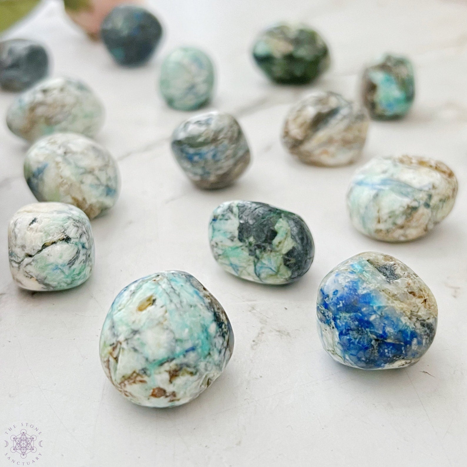 You will receive 1 Azurite-Malachite tumbled stone, intuitively chosen. These gorgeous Azurite-Malachite tumbles come to us from Peru. Azurite-Malachite is a pseudomorph with the Azurite occurring first and then with the introduction of water, it slowly turns to Malachite and these beautiful pieces will exhibit properties of both Azurite and Malachite.