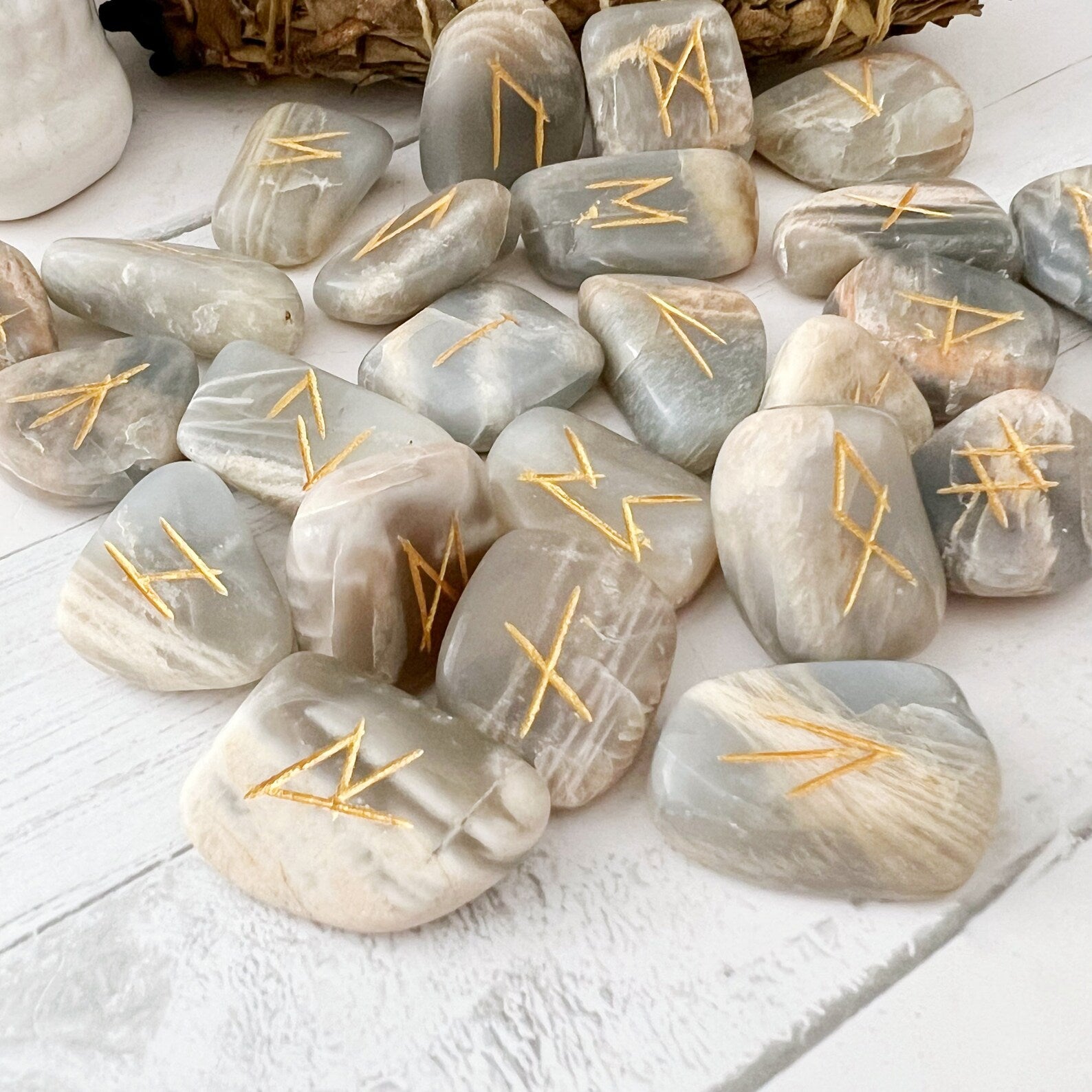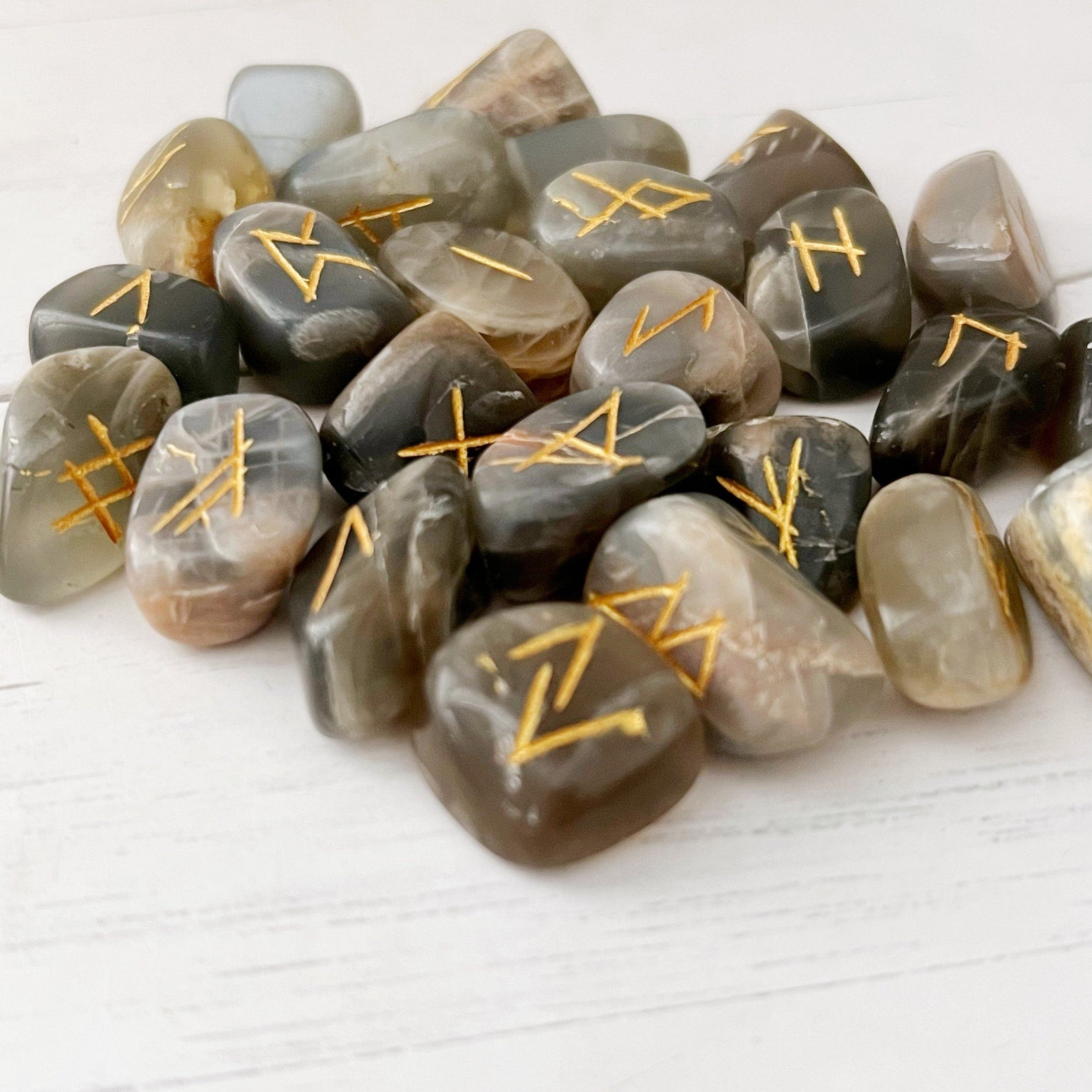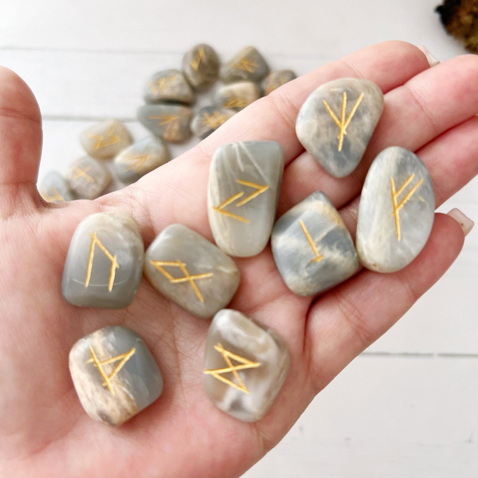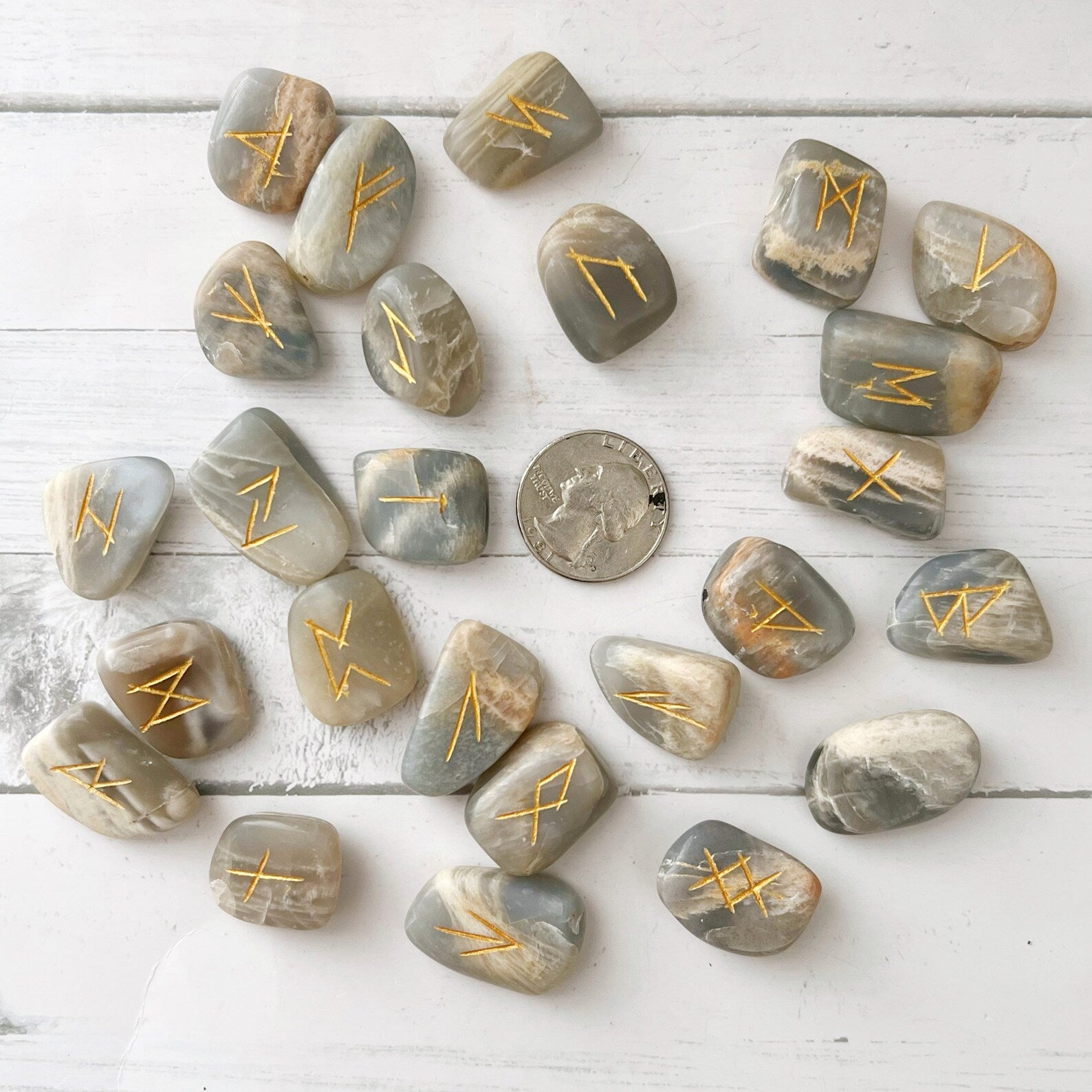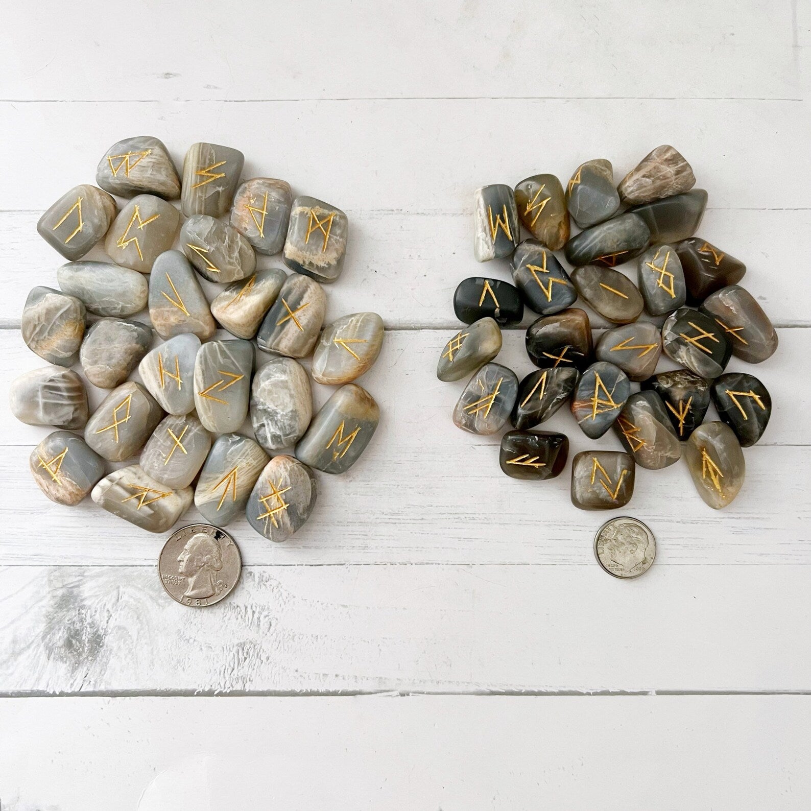 Each full-size rune measures approximately 0.5-1" in length (approximately the size of a quarter), while travel-size runes are approximately 0.5" and under (approximately the size of a dime). Please note that sizes may vary slightly due to the natural variations in the stones.