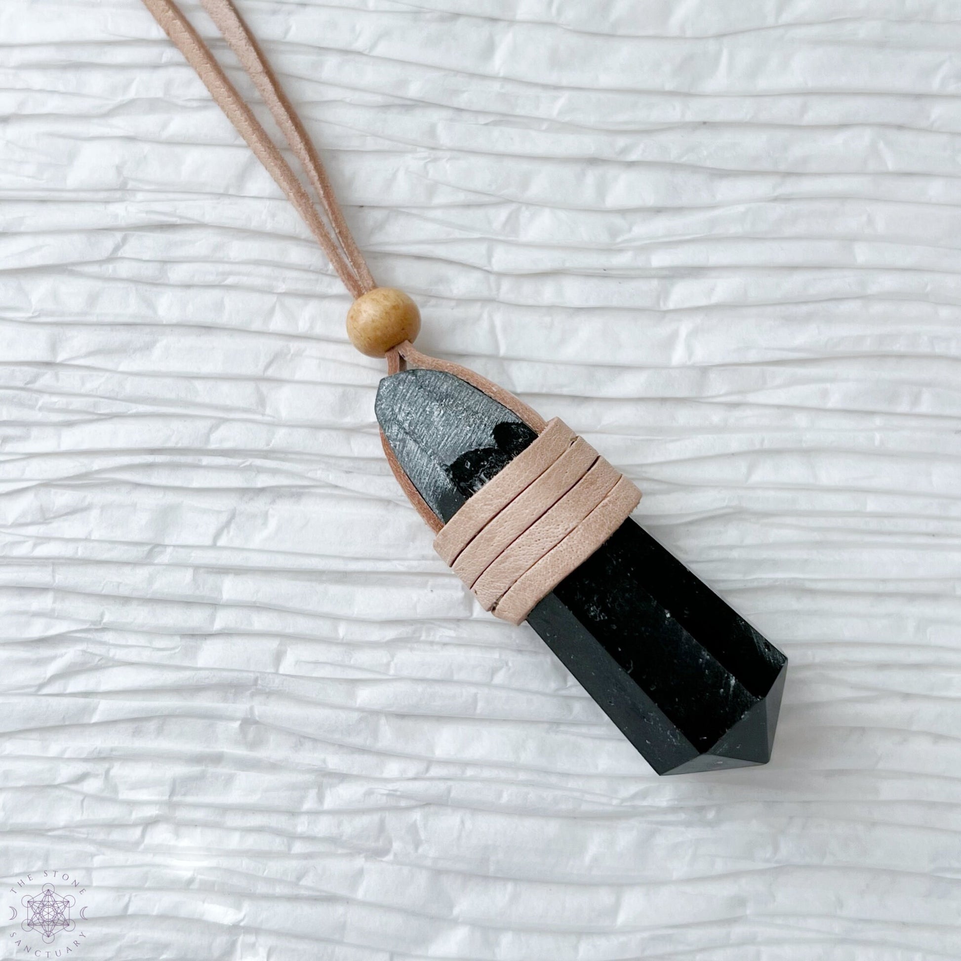 You will receive 1 Black Tourmaline Point Pendant (these are hand polished points and vary from 1.5-1.75" long) wrapped on a 28"L natural tan leather chord. There is an adjustable bead at one end that you can use to shorten the length of the chord. The rugged design of the leather chord perfectly complements the raw and natural beauty of the black tourmaline point, creating a stunning contrast that is sure to turn heads.