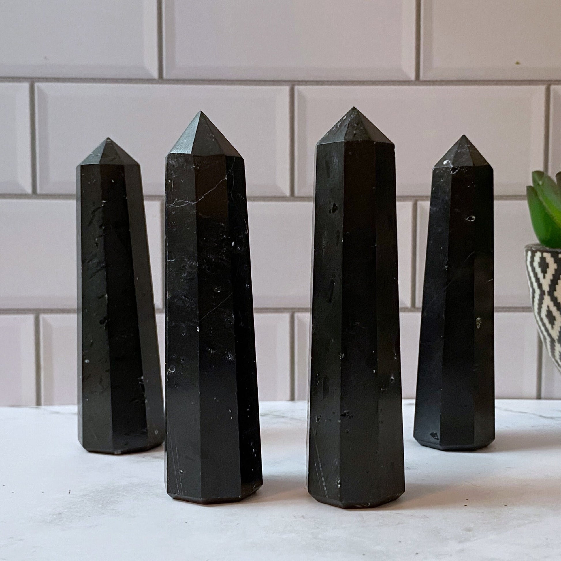 Prepare to enhance your space with the elegant and powerful presence of a fully polished 6-sided Black Tourmaline point obelisk/generator. Each piece, standing at an impressive 3-4 inches in height, is meticulously crafted to stand upright, serving not just as a stunning decorative item but also as a potent tool for your spiritual and energetic practices. The sleek, fully polished surfaces reflect the light and reveal the deep, rich hues of the Black Tourmaline, a stone renowned for its protective and grounding properties.