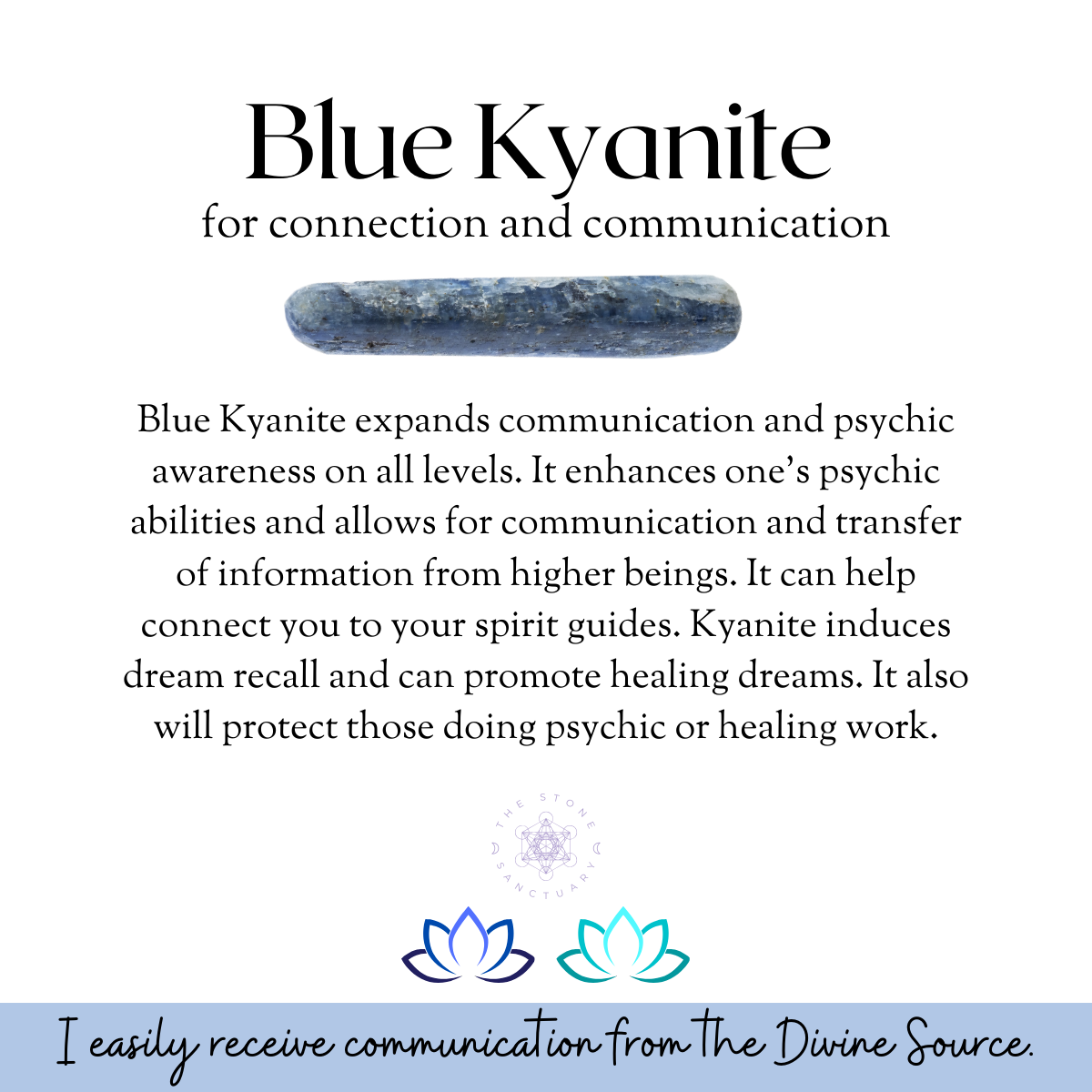 Blue Kyanite expands communication and psychic awareness on all levels. It enhances one’s psychic abilities and allows for communication and transfer of information from higher beings. It can help connect you to your spirit guides. Kyanite induces dream recall and can promote healing dreams. It also will protect those doing psychic or healing work.