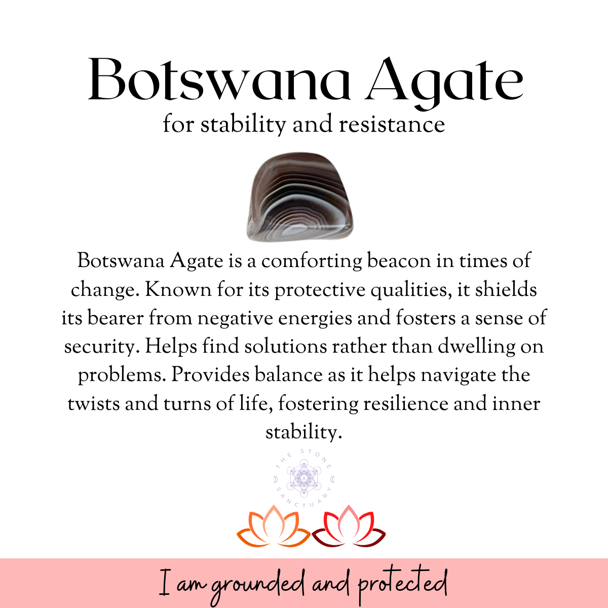 Botswana Agate can help relieve emotional trauma that needs to be addressed so healing can begin. Once it does, it then brings Universal Love. It can be helpful for those who are struggling to be genuine in their lifestyle to be true to themselves. Botswana Agate also stimulates the exploration of the unknown and furthers one's quest toward an enlightened state. It has energy balancing properties