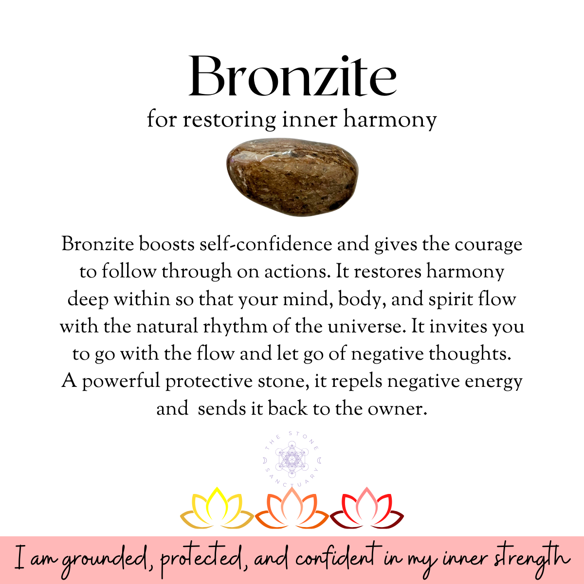 Bronzite boosts self-confidence and gives the courage to follow through on actions. It restores harmony deep within so that your mind, body, and spirit flow with the natural rhythm of the universe. It invites you to go with the flow and let go of negative thoughts.