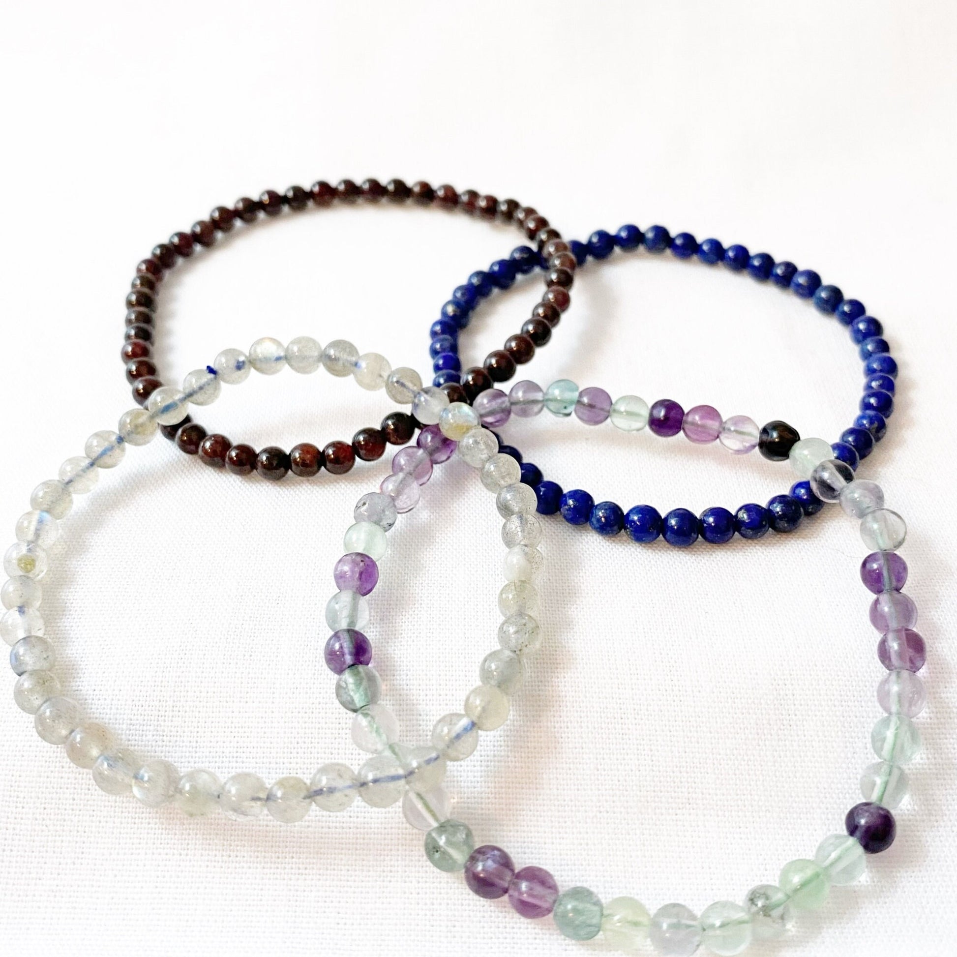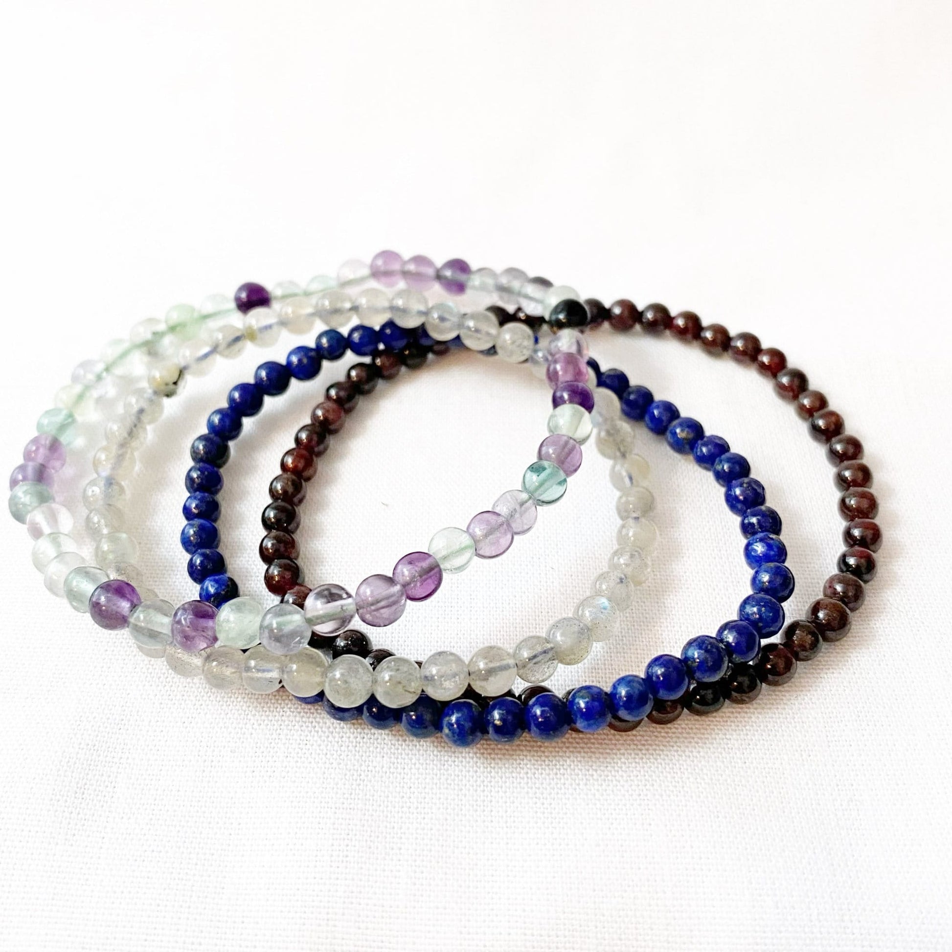 Includes one (1) each of the following gemstone bracelets: Amethyst, Blue Labradorite, Sodalite, and Blue Tiger Eye 4mm bead energy bracelets infused with Usui Reiki energy, love, and light. These fit-size S-M wrists.
