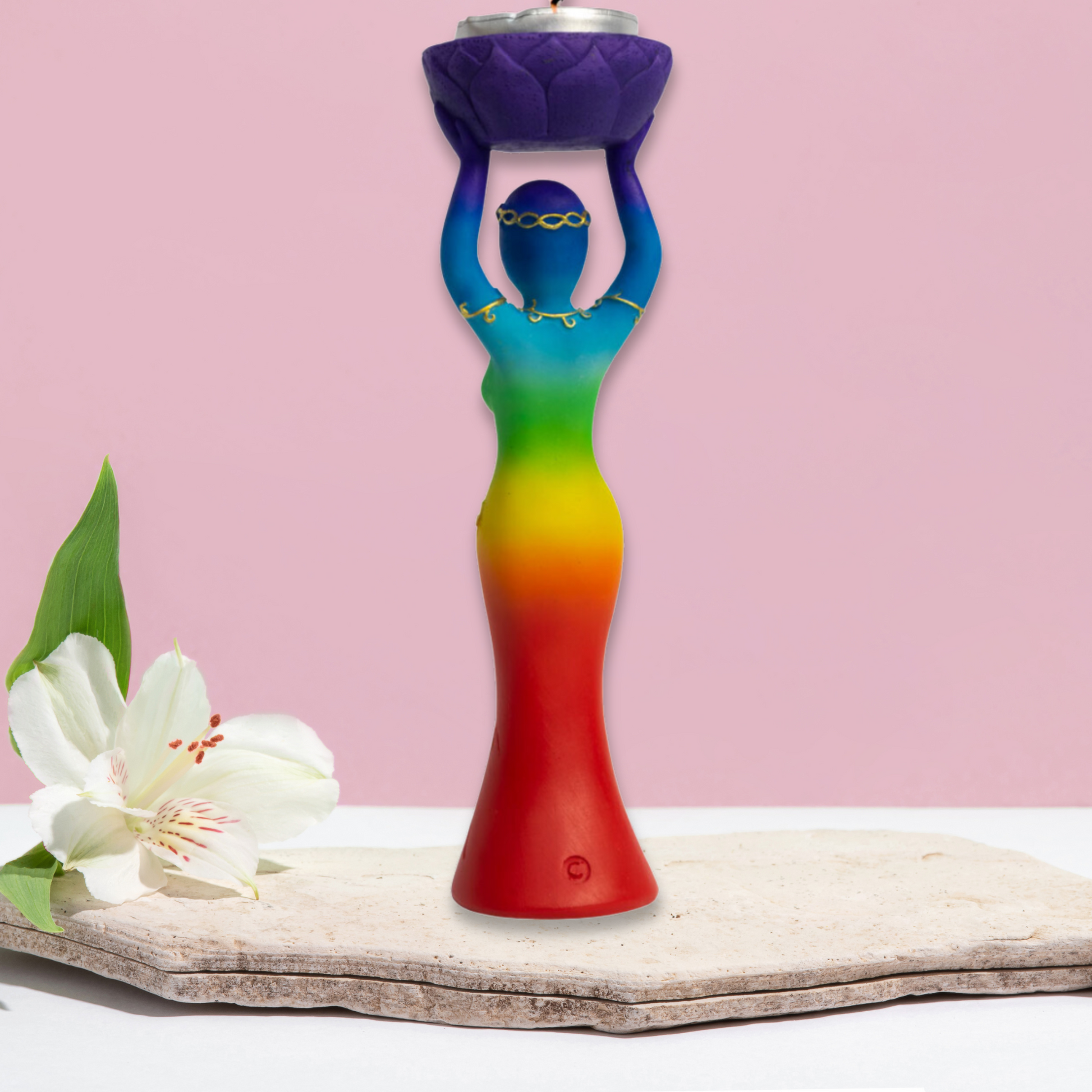 The Chakra Goddess candle holder is an exquisite representation of balance and energy flow. Its body displays a gradient of colors representing each of the seven chakras, from the grounding red at the base to the enlightening violet at the crown, each adorned with symbolic golden motifs that enhance the visual allure and spiritual significance of the holder.