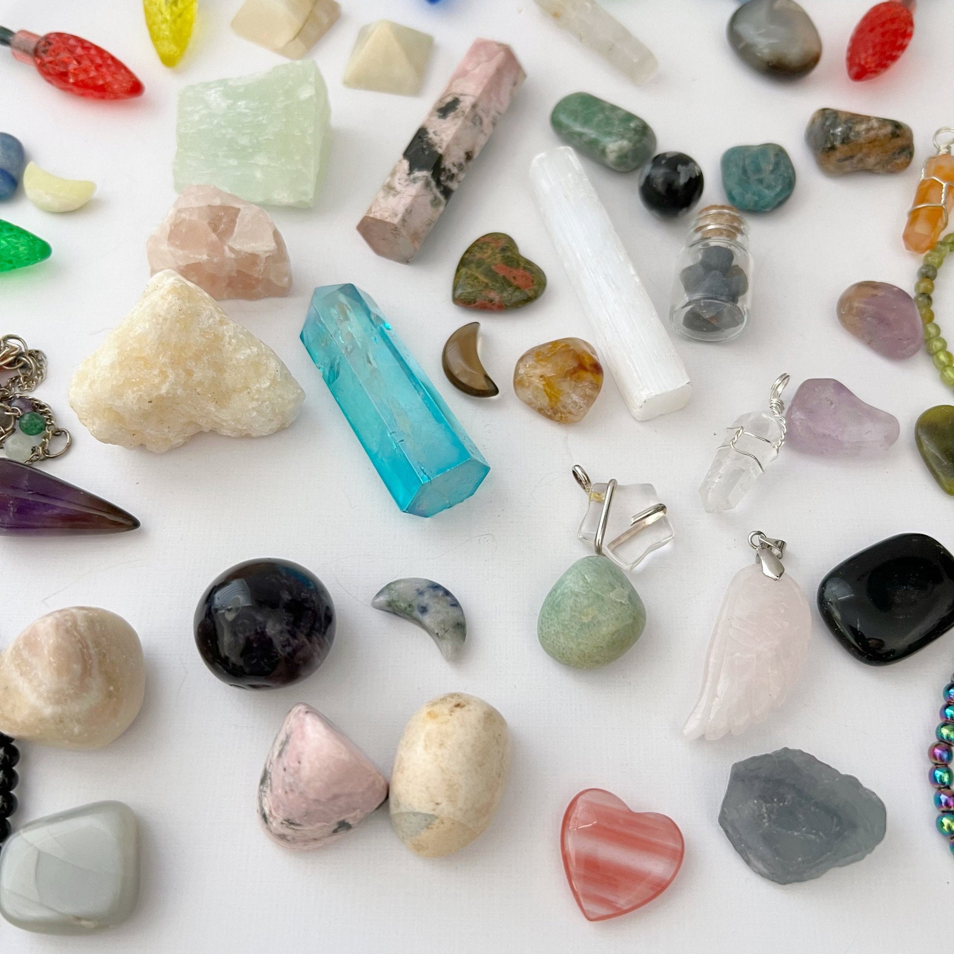 Crystals and Stones in these surprise Christmas boxes range from B-grade stones to stones that may not have met my standards for size range, color, or shape (maybe irregular shapes) and may contain "misfit" pieces such as generators that were too short to list with our regular sizes, or bracelets that may have their ties exposed, pendulums that are a bit too small, to small geodes, angel aura points that are missing their coating (making them clear quartz points!) or aqua aura that wasn't perfectly cut, or pyramids which are too short for our standard pyramids. May contain tumbled and/or raw stones.