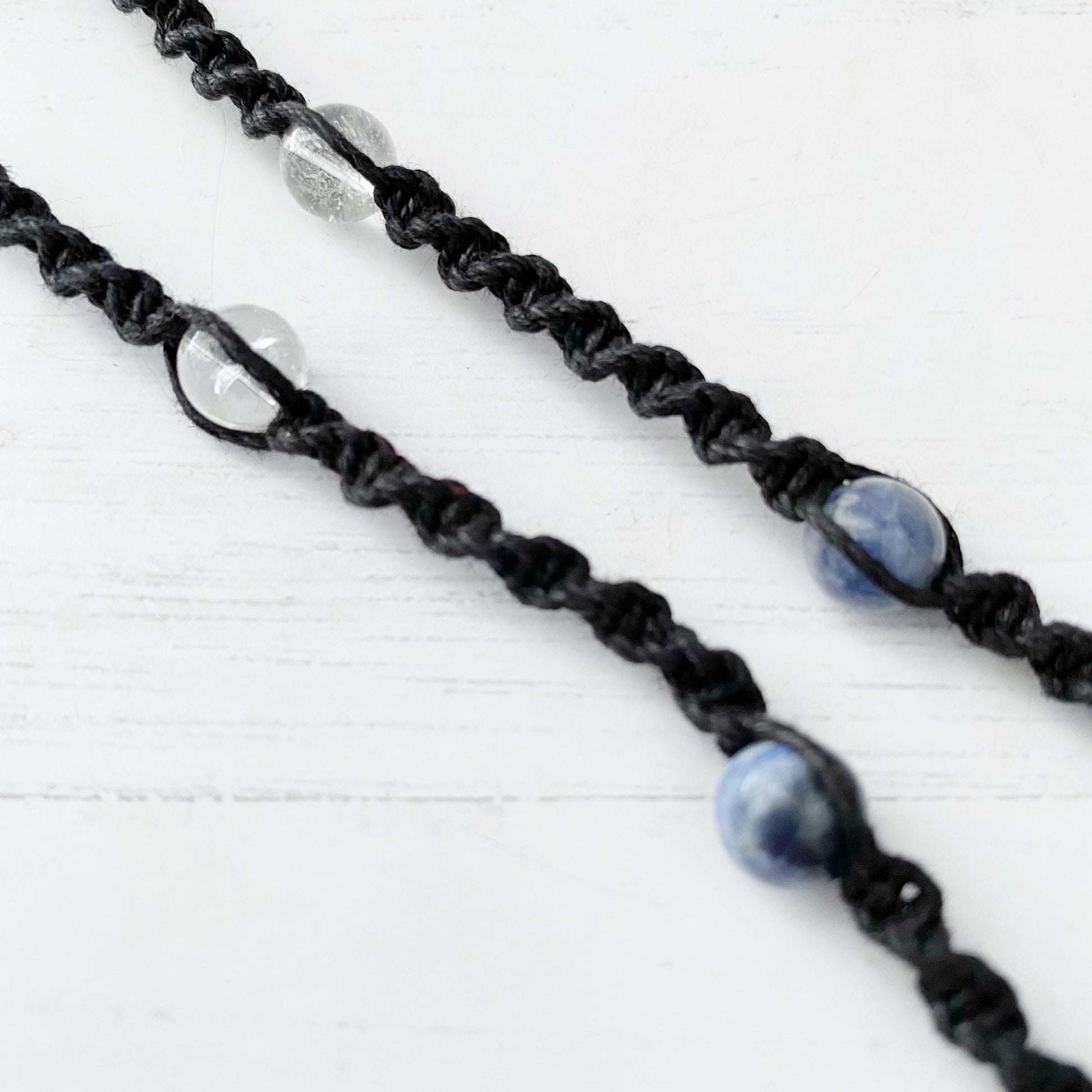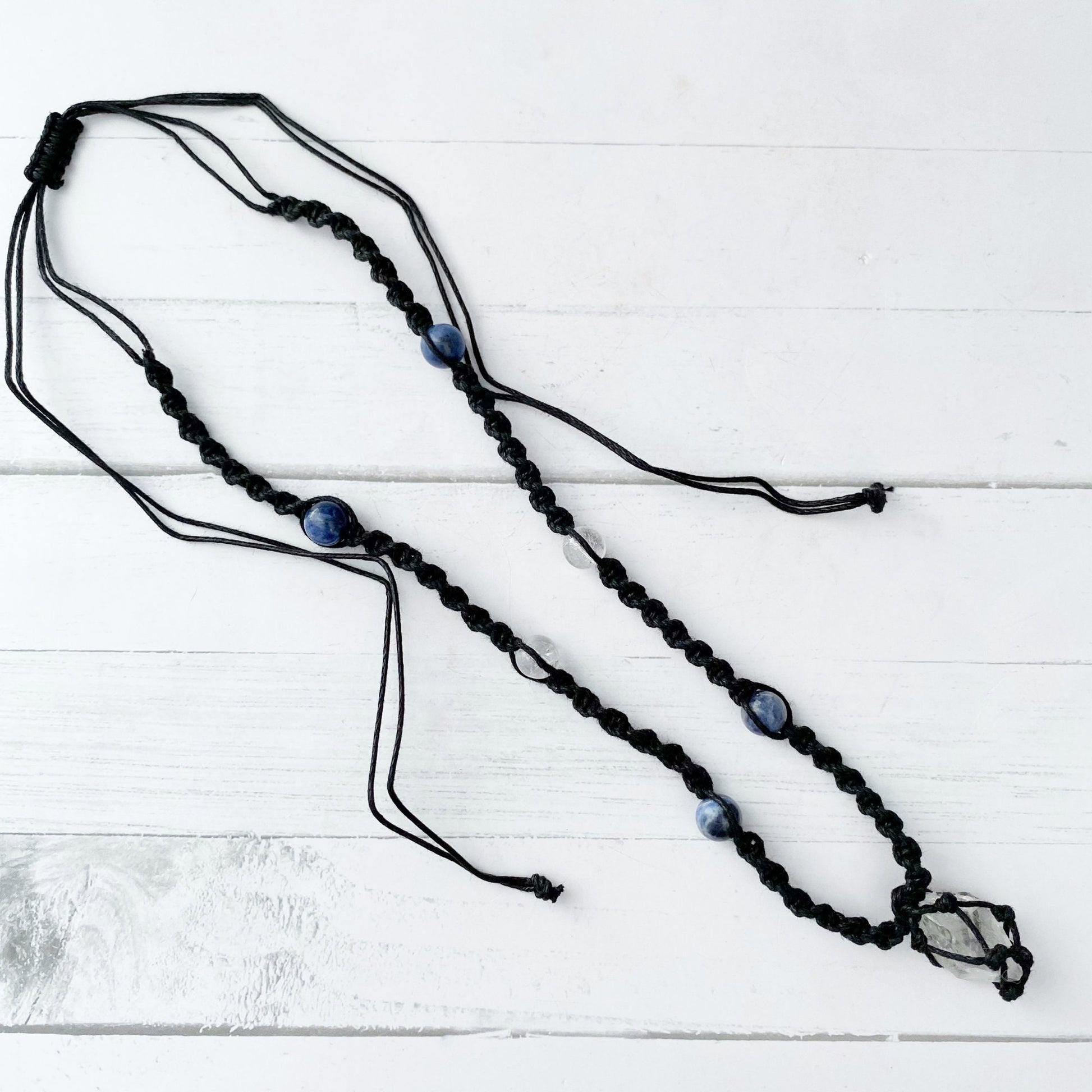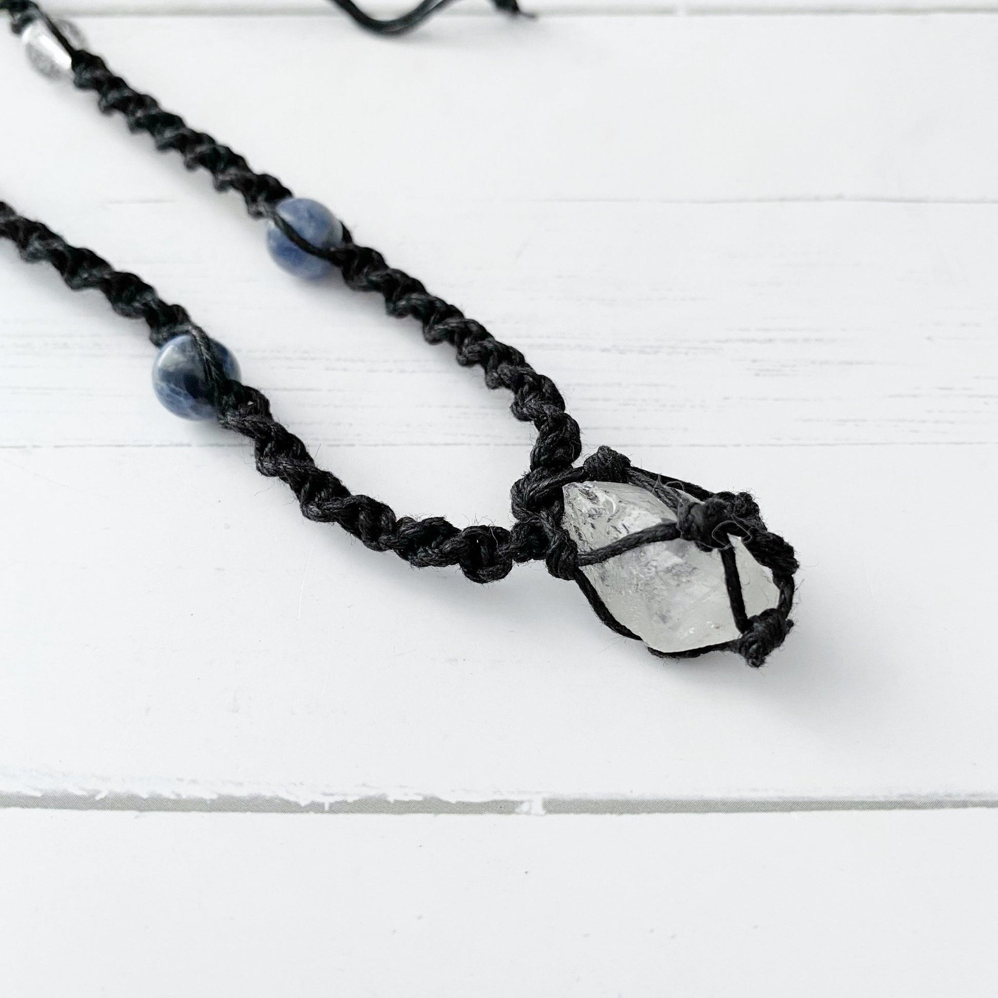 This listing is for 1 Clear Crystal Quartz Point Necklace with clear quartz and sodalite beads. Program the point with your intentions or use it for clearing and aligning your chakras/ The necklace is made from a black wax cord and is handwoven into a net to hold the point, then finished with an adjustable knotted clasp. This Clear Quartz Crystal Necklace is 14” L at its shortest and 30” L when it’s full length.