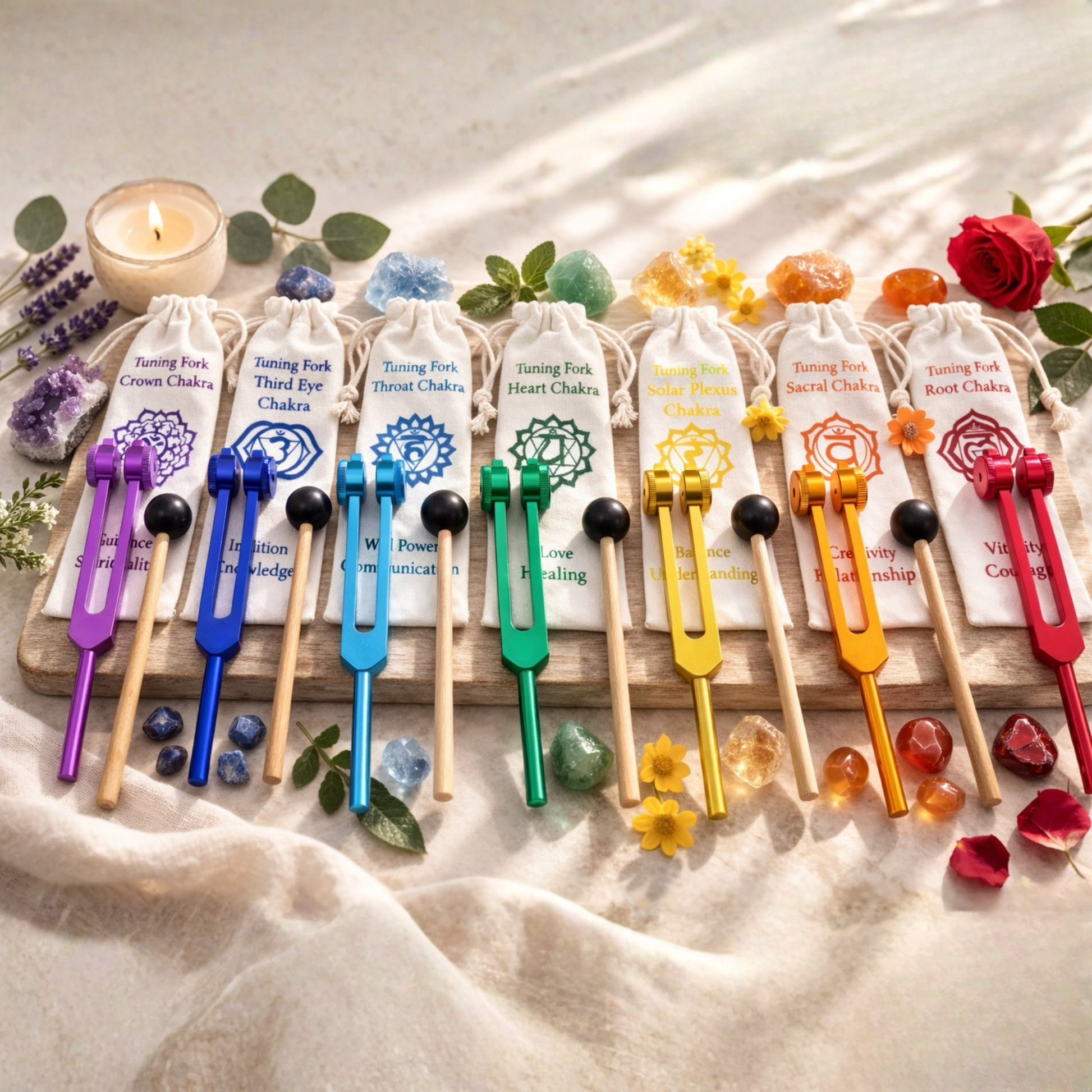 Each fork is calibrated to its corresponding chakra frequency and color-coded for intuitive alignment. Together, they create a structured progression from grounding at the Root to expanded awareness at the Crown — supporting balance, coherence, and energetic clarity across the entire field.