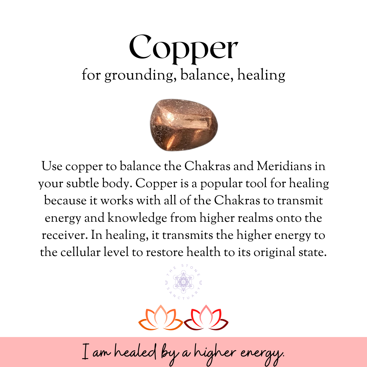 Copper activates and opens the base and sacral chakras, advancing and stabilizing the energies of intuition, sexuality, desire, and vitality - directing these energies toward the pursuit of one's path of evolution. It allows one to recognize the barriers which are in the path of one's development