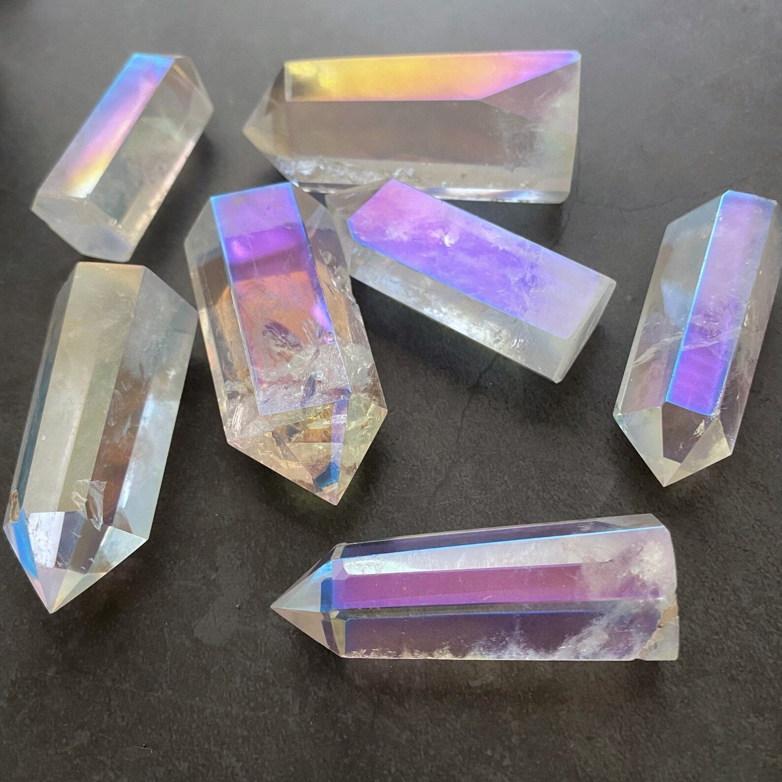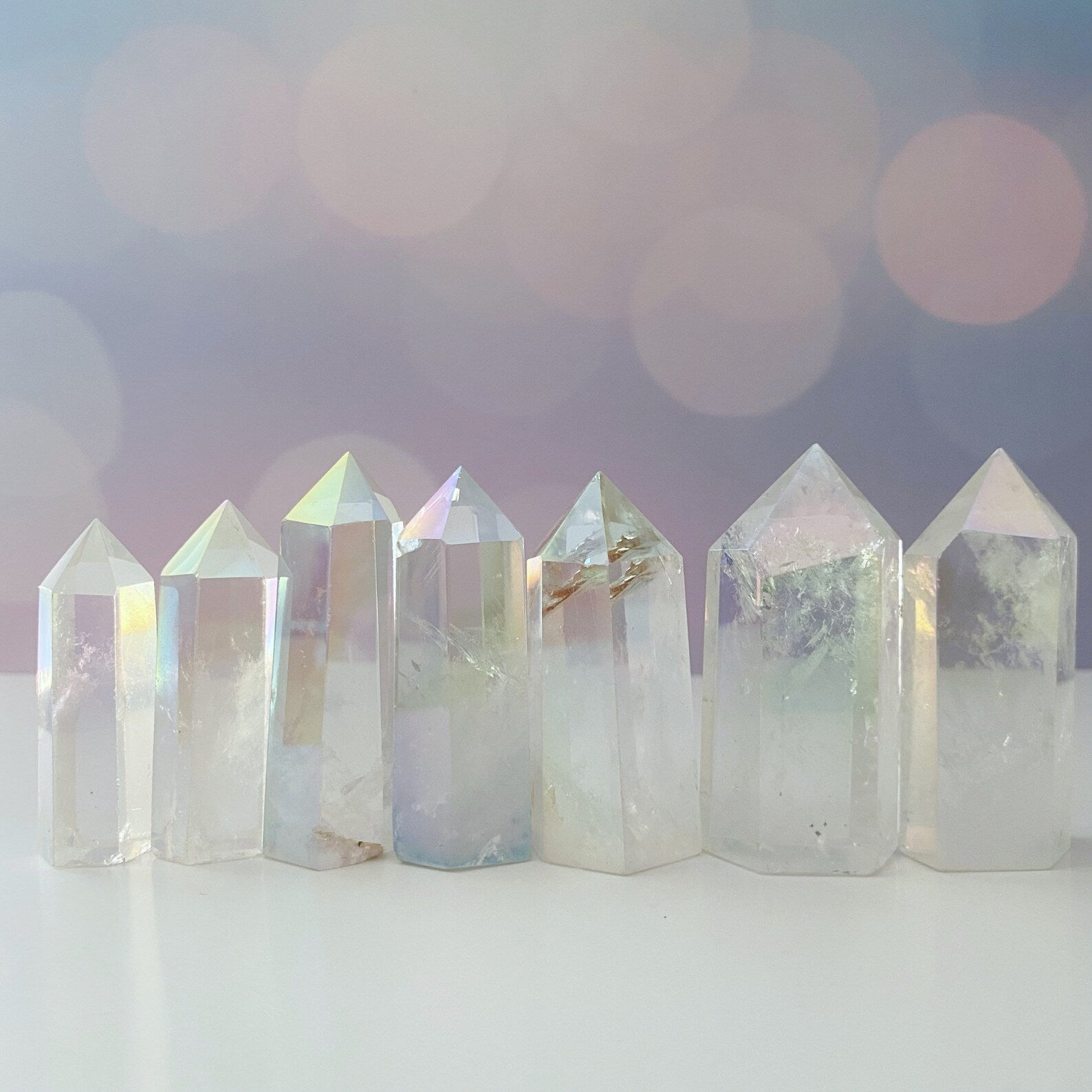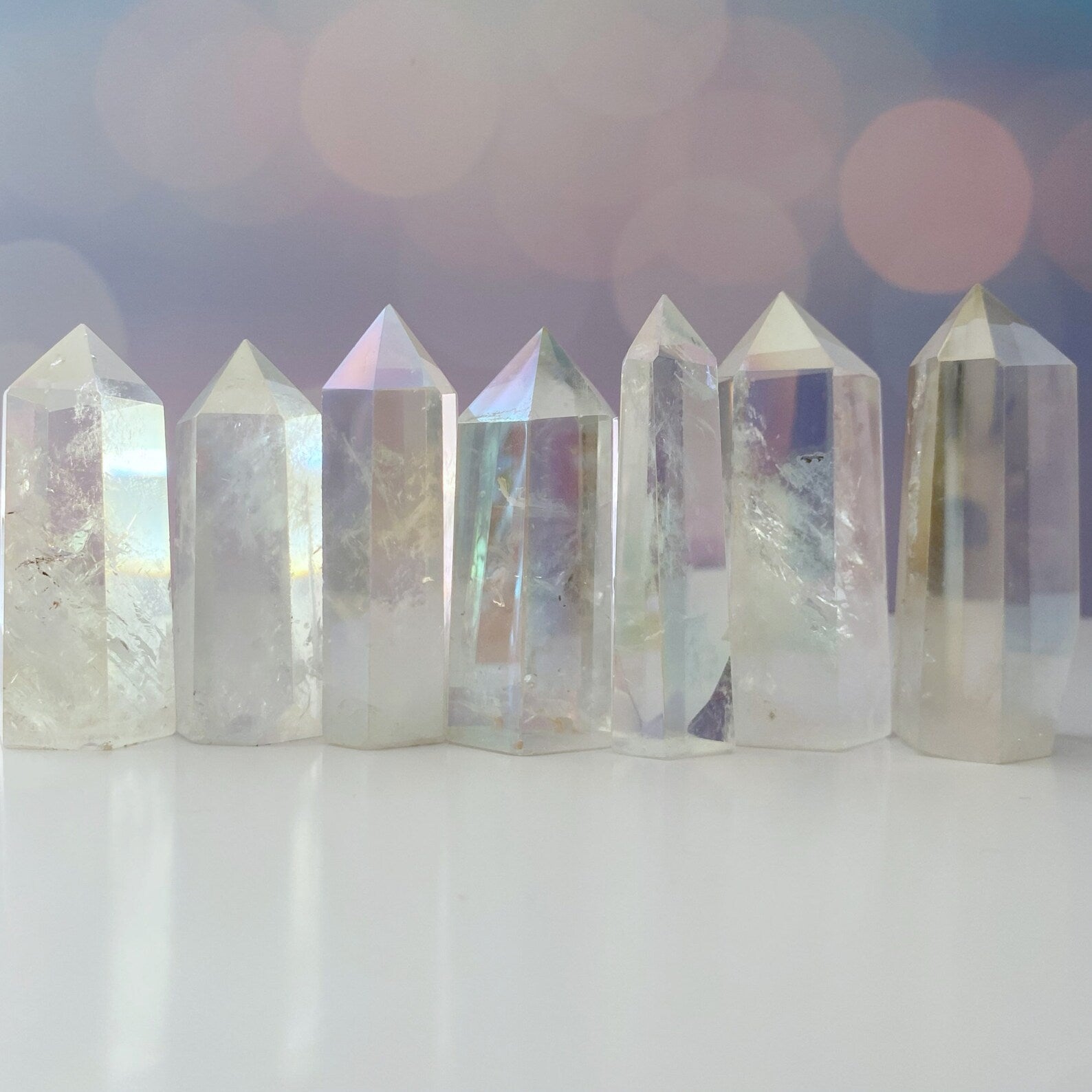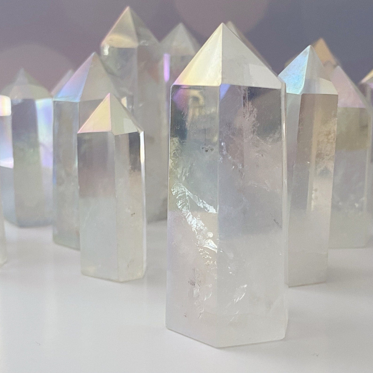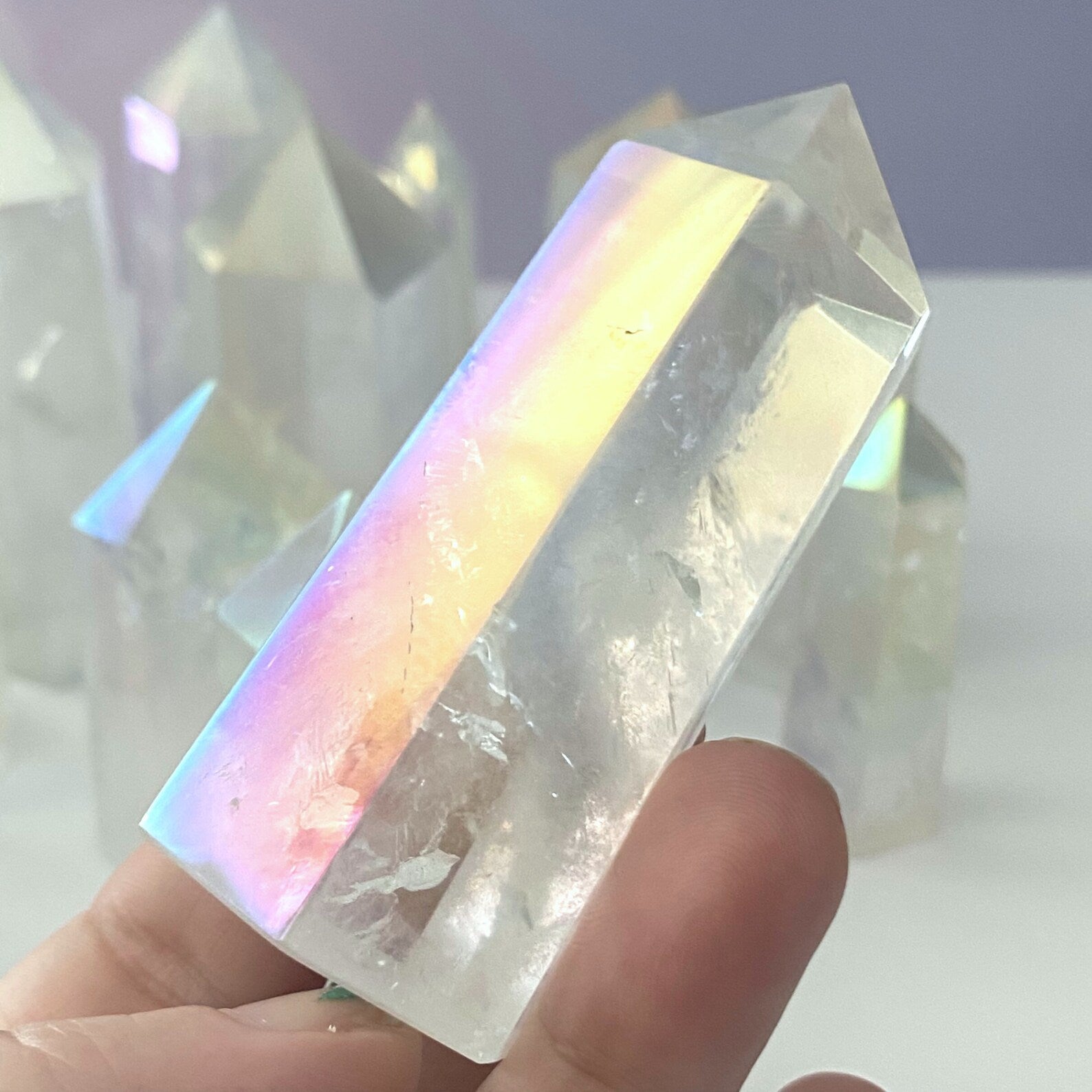 Elevate your energy and crystal collection with our polished Angel Aura Quartz 6-sided energy generator/tower/obelisk. Standing approximately 2-3 inches tall, these exquisite pieces feature polished points and sides, providing a radiant addition to your spiritual practice.