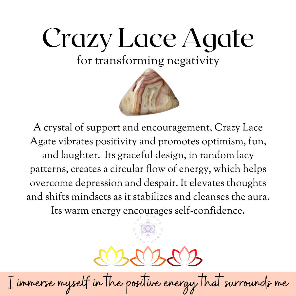 A crystal of support and encouragement, Crazy Lace Agate vibrates positivity and promotes optimism, fun, and laughter. Its graceful design, in random lacy patterns, creates a circular flow of energy, which helps overcome depression and despair. It elevates thoughts and shifts mindsets as it stabilizes and cleanses the aura. Its warm energy encourages self-confidence.